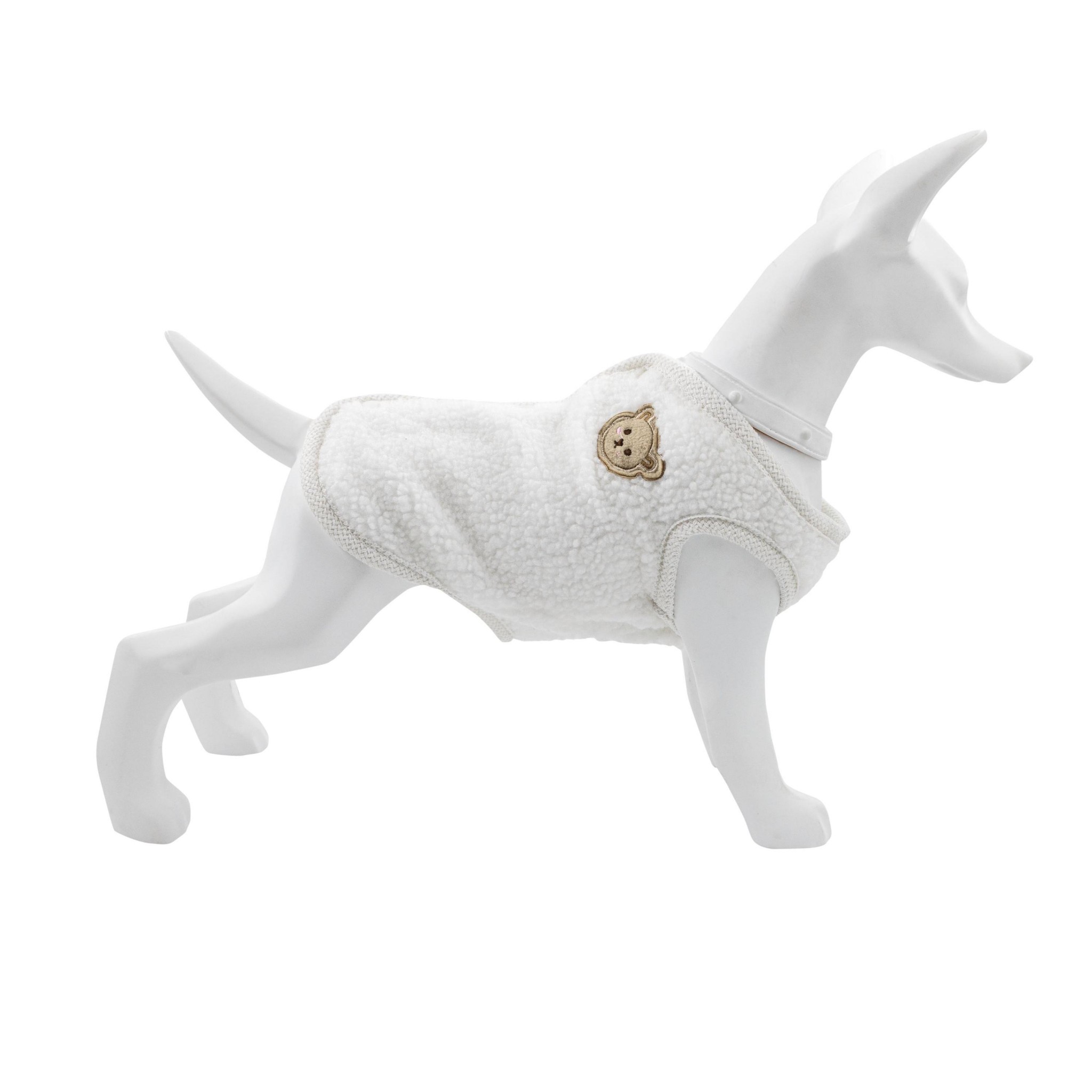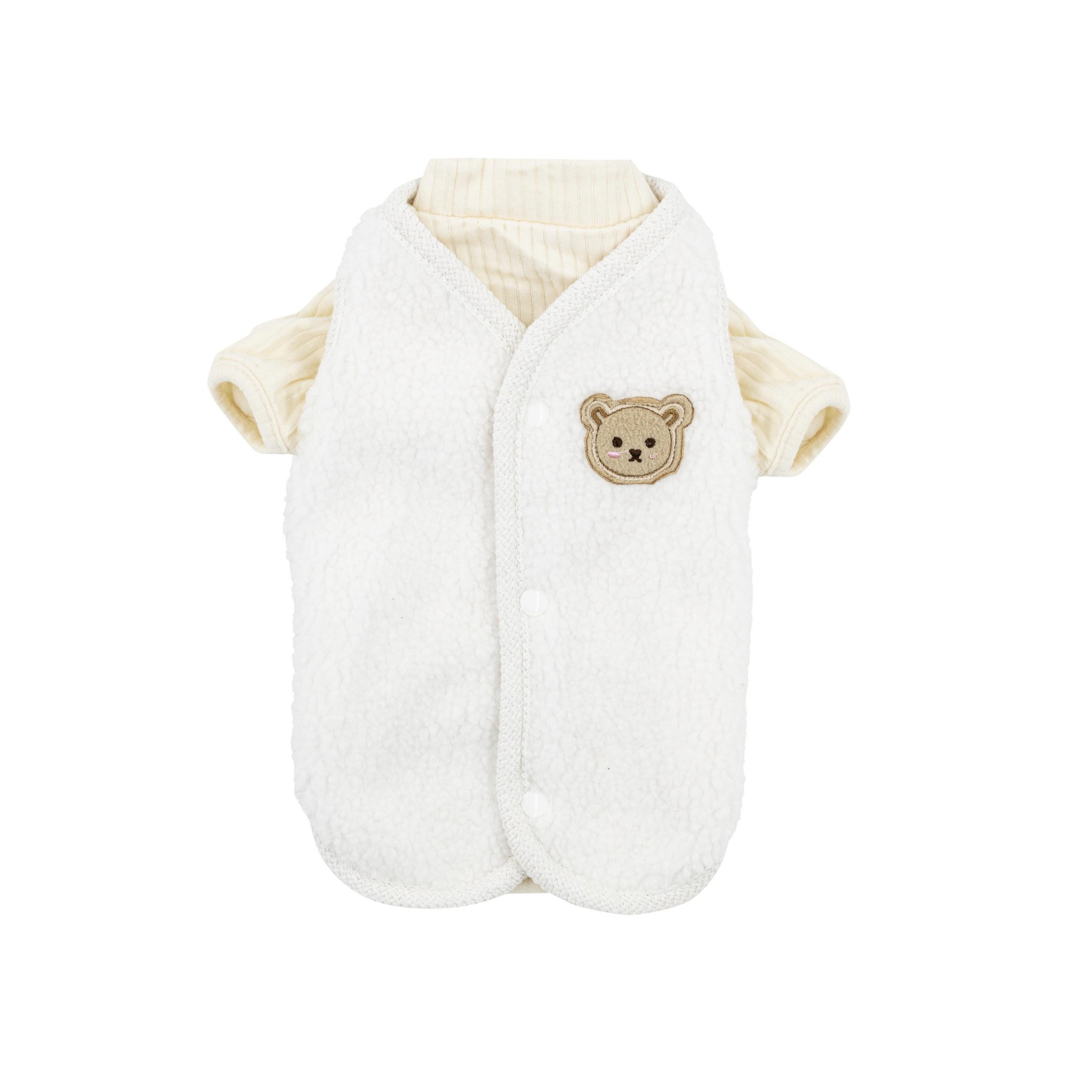 • Kamizelka wykonana jest z delikatnego, miękkiego materiału w eleganckim białym kolorze, który dodaje jej klasy. Subtelna aplikacja w kształcie główki misia na froncie dodaje jej uroku i charakteru.