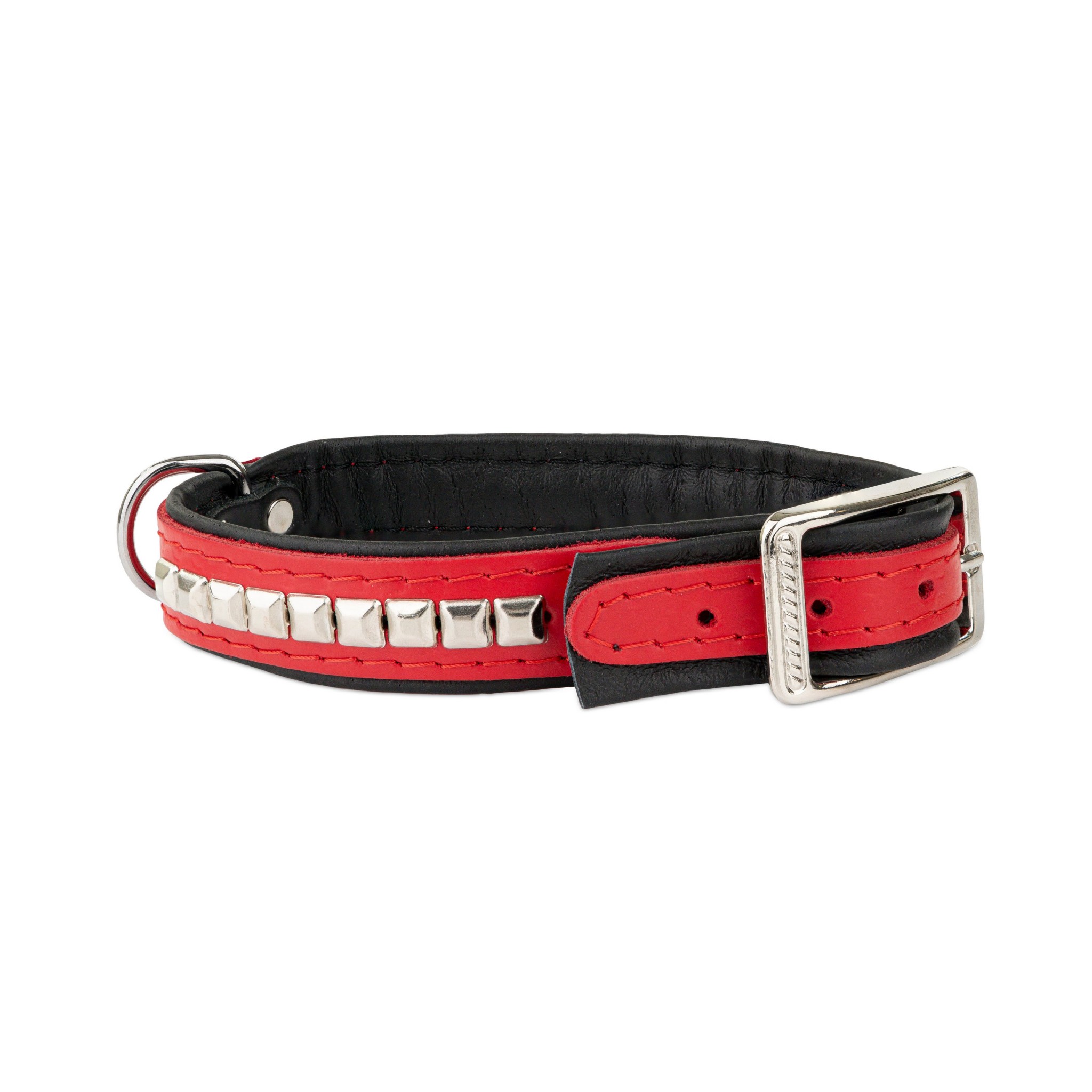 • Unikalne zdobienia – płaskie metalowe ćwieki w kształcie kostek dodają obroży wyjątkowego, nowoczesnego stylu.