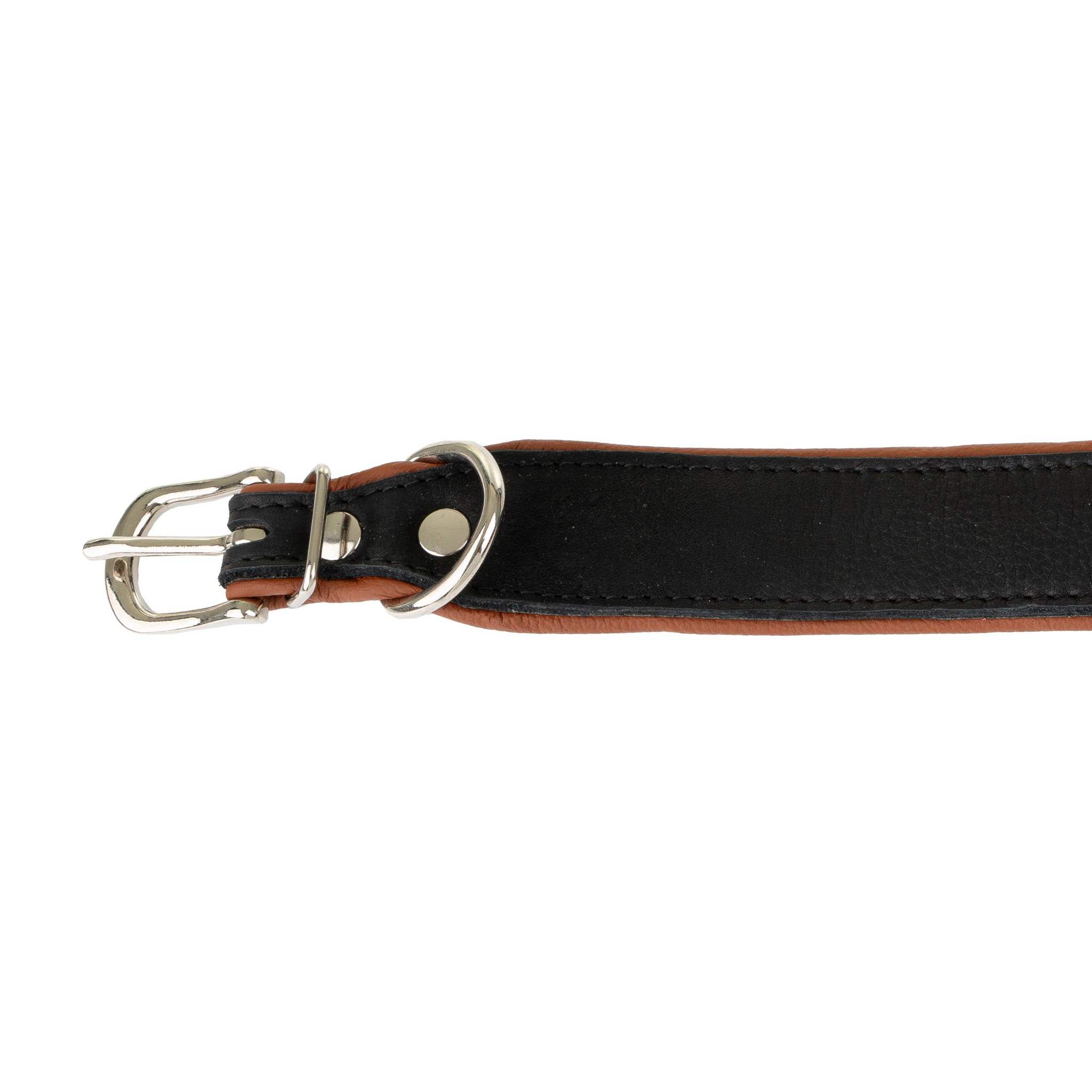 Obroża ta została wykonana w Polsce z dbałością o każdy detal. Wyróżnia się unikalnym połączeniem dwóch warstw skóry – wewnętrznej, wykonanej z naturalnej skóry o wysokiej odporności na przetarcia w wytwornym odcieniu brązu, oraz zewnętrznej, powstałej z luksusowej skóry łosia w kolorze czarnym. Skóra łosia słynie z wyjątkowej miękkości, elastyczności oraz przyjemnej w dotyku struktury, która doskonale dopasowuje się do kształtu szyi psa, zapewniając mu maksimum komfortu bez uczucia ucisku czy otarć.