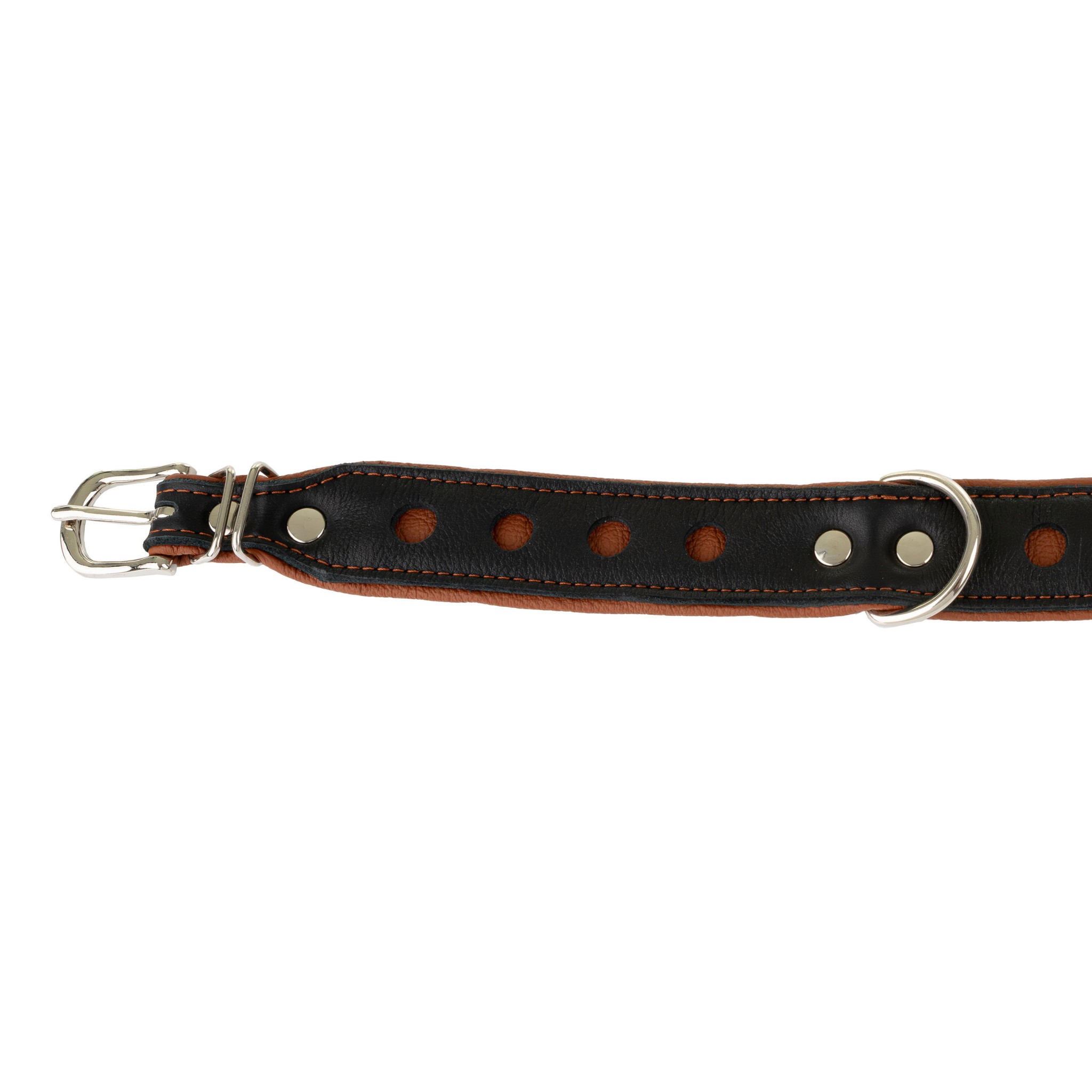 • Oryginalny design – dekoracyjne wycięcia w kształcie kół nadają obroży nowoczesny wygląd i podkreślają elegancki kontrast między czernią a brązowym.