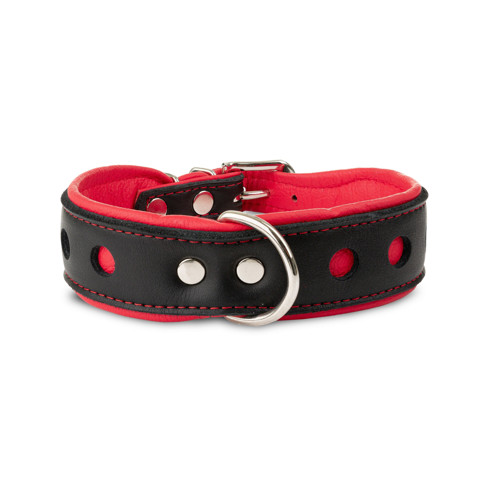 Ten model wyróżnia się unikalnym zestawieniem kolorów i form: zewnętrzna warstwa z miękkiej, czarnej skóry łosia została efektownie wycięta w motyw kół, przez które przebija głęboki, czerwony odcień wewnętrznej warstwy ze skóry bydlęcej. Dzięki temu obroża nie tylko świetnie wygląda, ale również zachowuje wszystkie walory użytkowe. Elastyczna i przyjemna w dotyku skóra łosia zapewnia komfort nawet przy długim noszeniu, a klasyczna, metalowa klamra i regulowane zapięcie gwarantują bezpieczeństwo i trwałość.