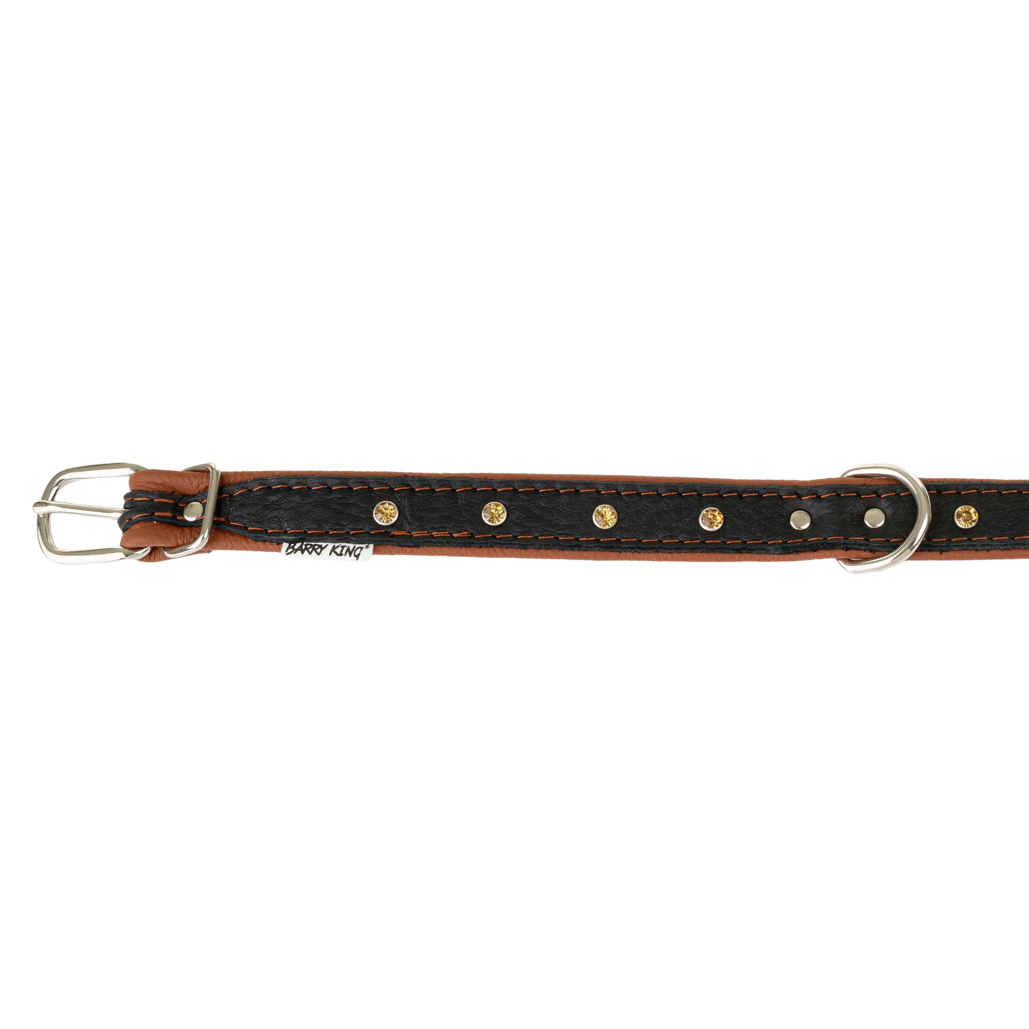 Obroża została wykonana z dwóch warstw skóry naturalnej – miękkiej, odpornej skóry bydlęcej w kolorze brązowym od wewnątrz oraz czarnej, elastycznej skóry łosia od zewnątrz. Jednak tym, co wyróżnia tą obrożę, są ozdobne kryształki w metalowych oprawach, subtelnie osadzone wzdłuż obroży. Tworzą one delikatny, ale zauważalny efekt biżuterii, idealny na wyjątkowe okazje lub codzienne spacery z nutą szyku.