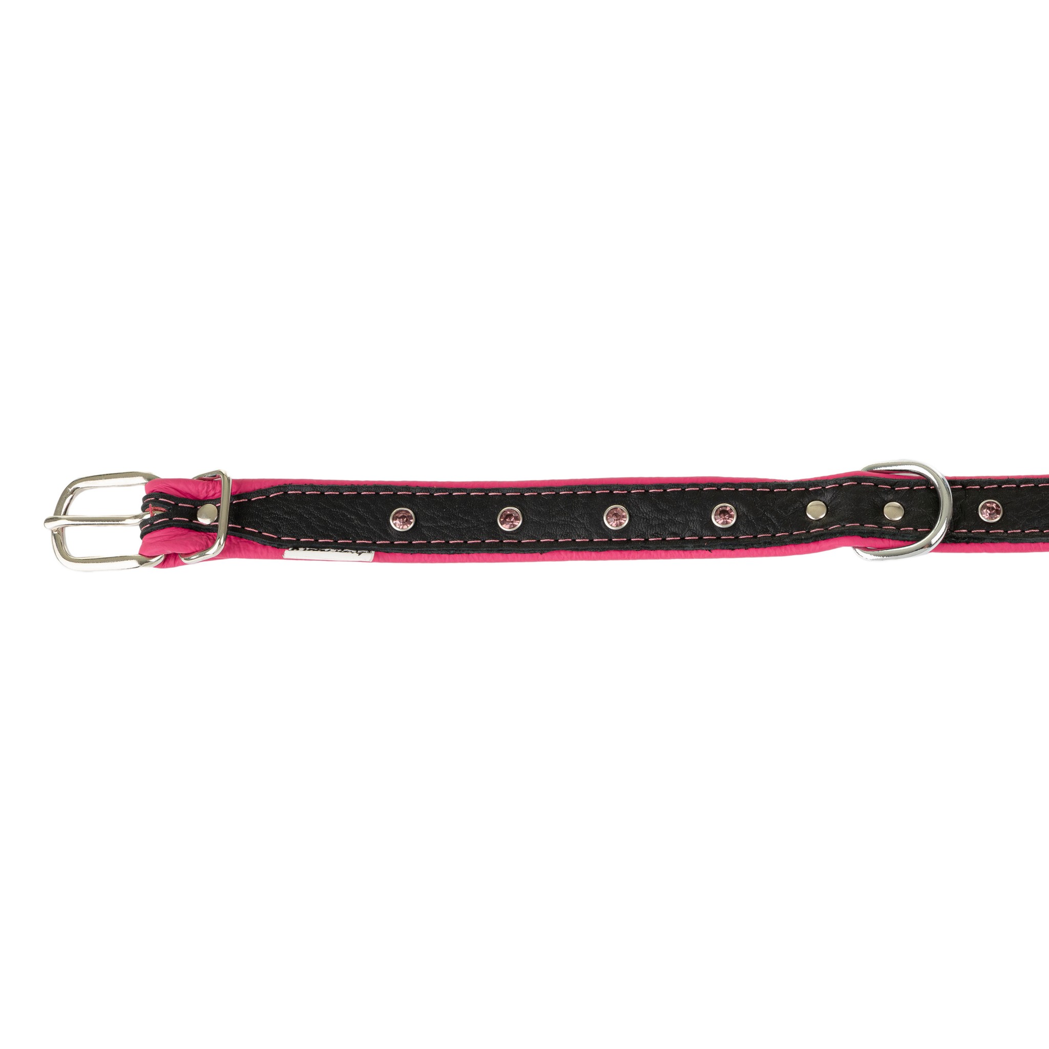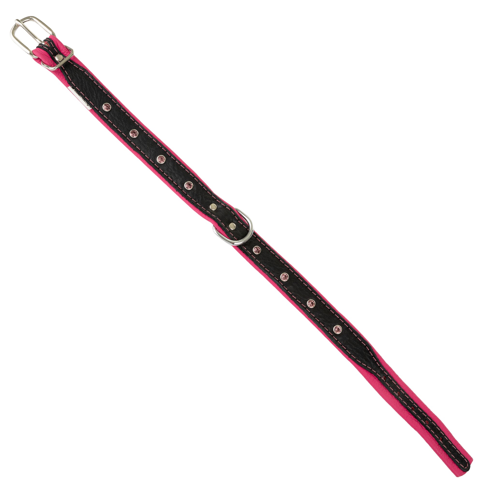 Obroża została wykonana z dwóch warstw skóry naturalnej – miękkiej, odpornej skóry bydlęcej w kolorze różowym od wewnątrz oraz czarnej, elastycznej skóry łosia od zewnątrz. Jednak tym, co wyróżnia tą obrożę, są ozdobne kryształki w metalowych oprawach, subtelnie osadzone wzdłuż obroży. Tworzą one delikatny, ale zauważalny efekt biżuterii, idealny na wyjątkowe okazje lub codzienne spacery z nutą szyku.