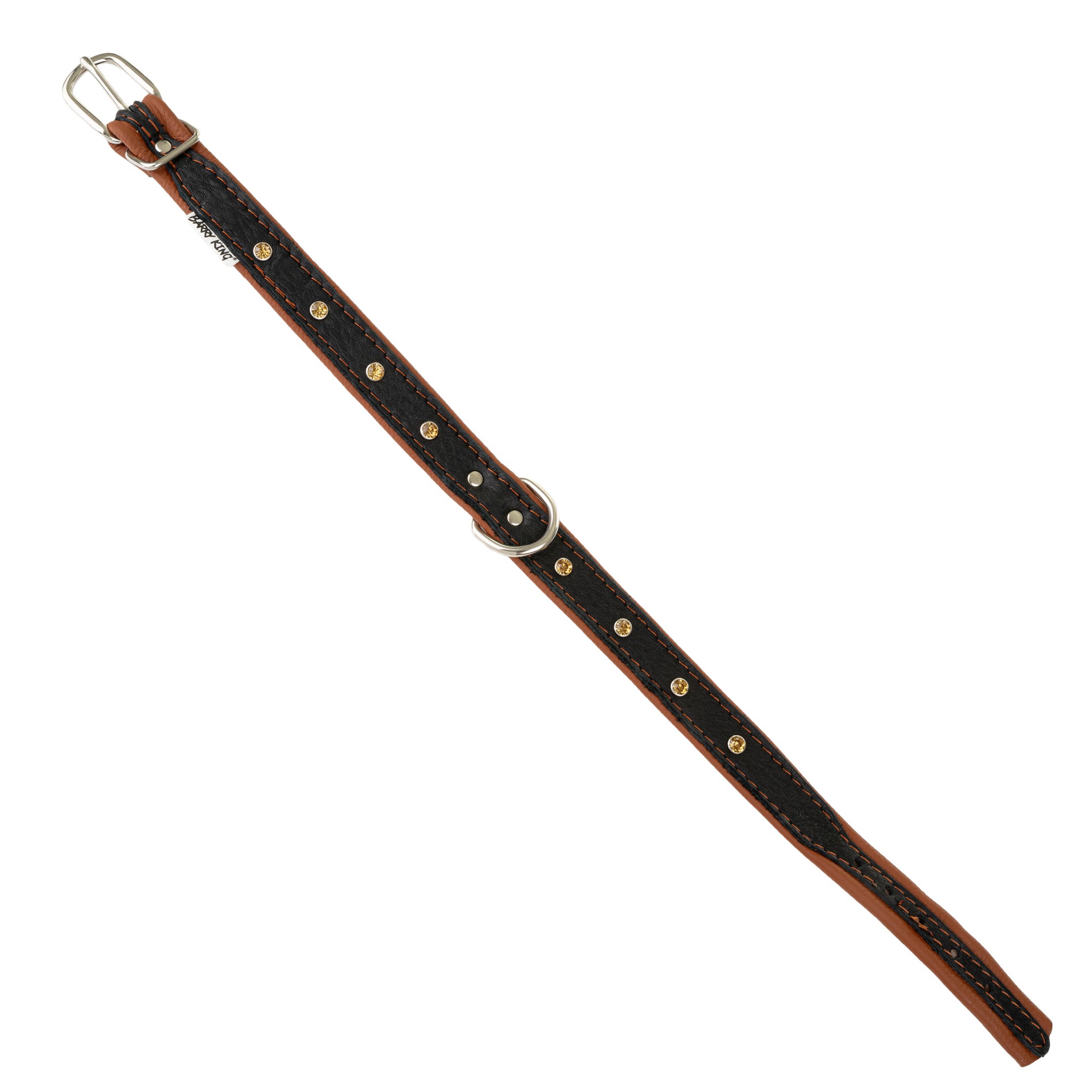 Obroża została wykonana z dwóch warstw skóry naturalnej – miękkiej, odpornej brązowej skóry bydlęcej od wewnątrz oraz czarnej, elastycznej skóry łosia od zewnątrz. Jednak tym, co wyróżnia tą obrożę, są ozdobne, białe kryształki w metalowych oprawach, subtelnie osadzone wzdłuż obroży. Tworzą one delikatny, ale zauważalny efekt biżuterii, idealny na wyjątkowe okazje lub codzienne spacery z nutą szyku.