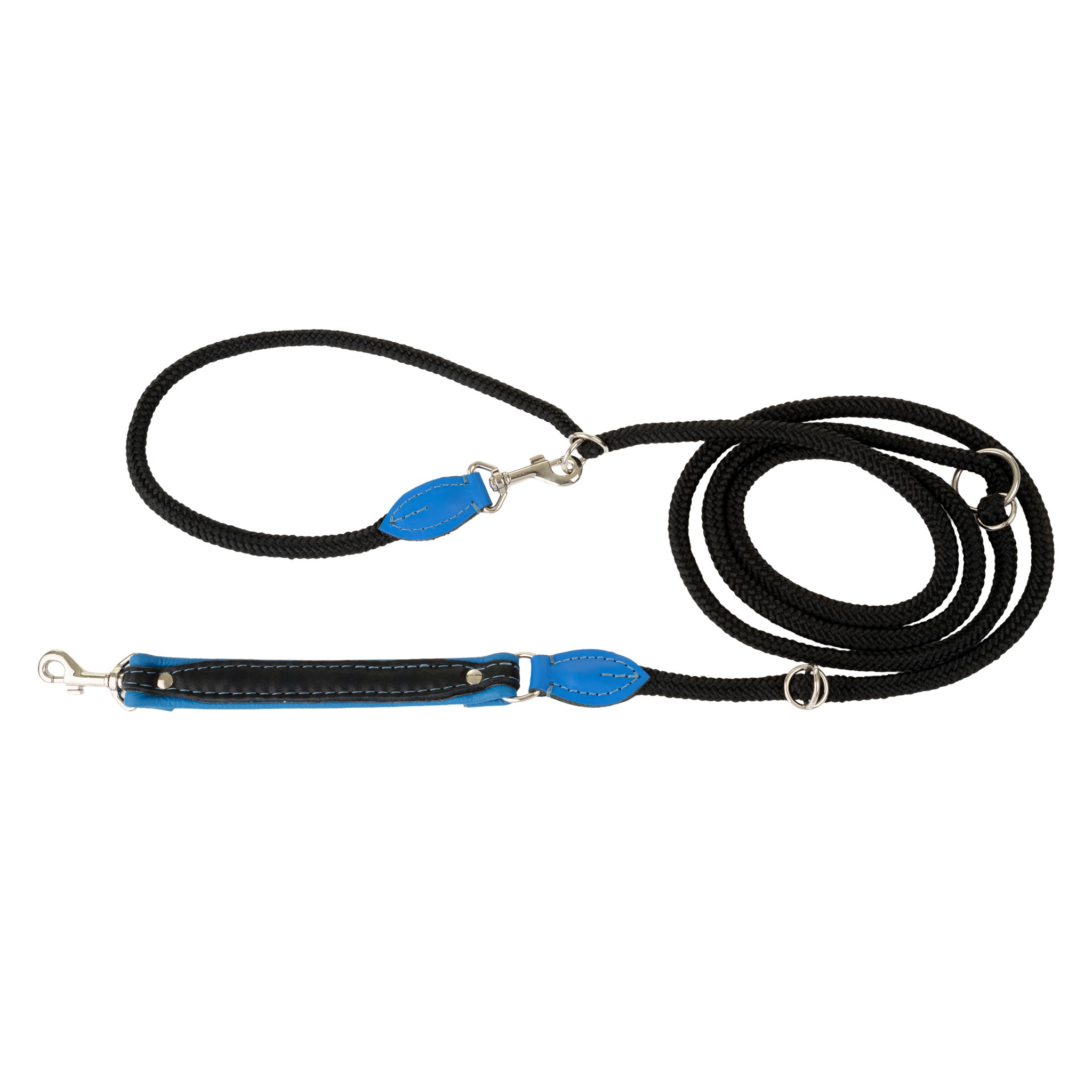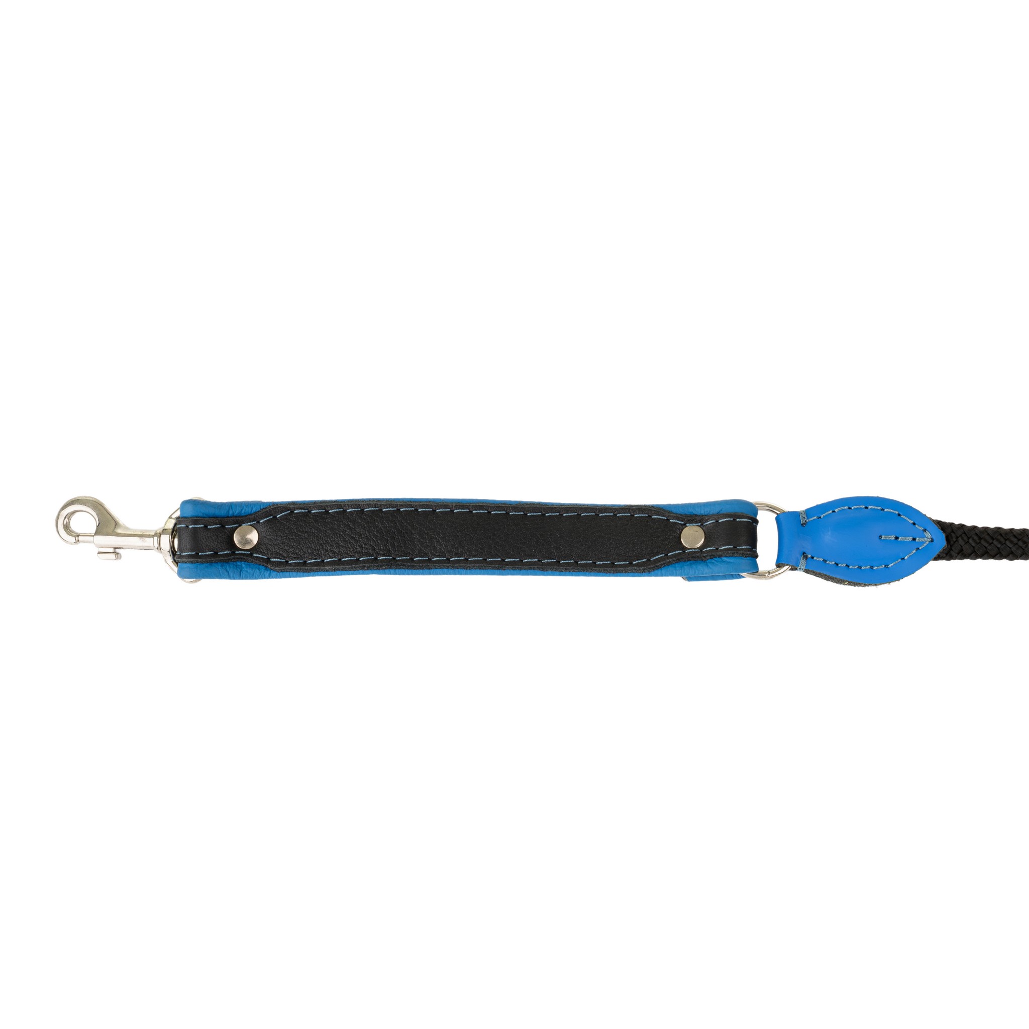Smycz wykonano z dwóch wysokiej jakości materiałów: naturalnej skóry i mocnej plecionej linki. Część skórzana (20 mm szerokości) została zbudowana z dwóch warstw – od wewnątrz znajduje się gładka, naturalna skóra w kolorze niebieskim, a z zewnątrz miękka i sprężysta skóra łosia, wyróżniająca się wyjątkową wytrzymałością i odpornością na ścieranie. Czarna pleciona linka o średnicy 6 mm podkreśla kontrastowy charakter smyczy, jednocześnie zapewniając dużą odporność na rozciąganie i uszkodzenia.