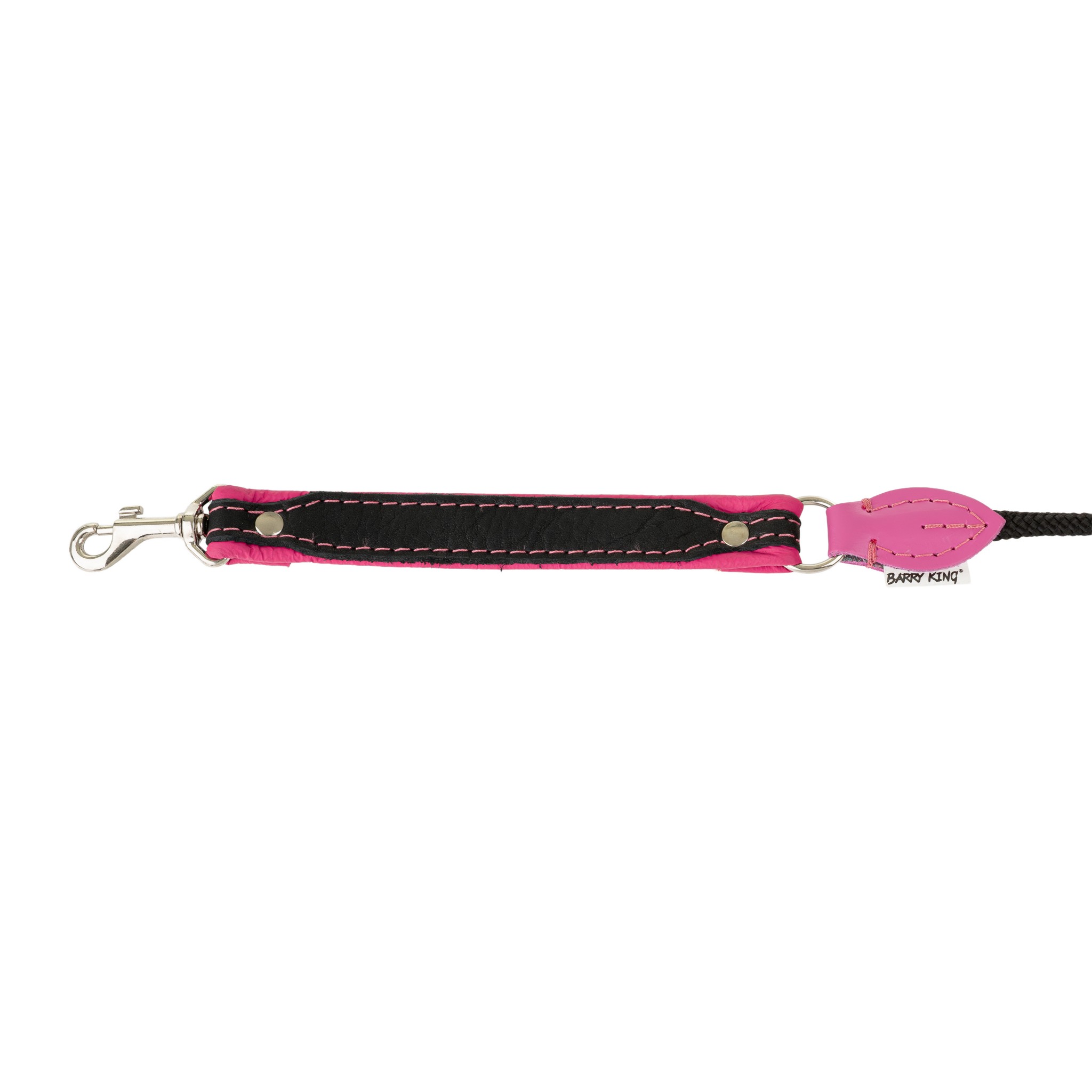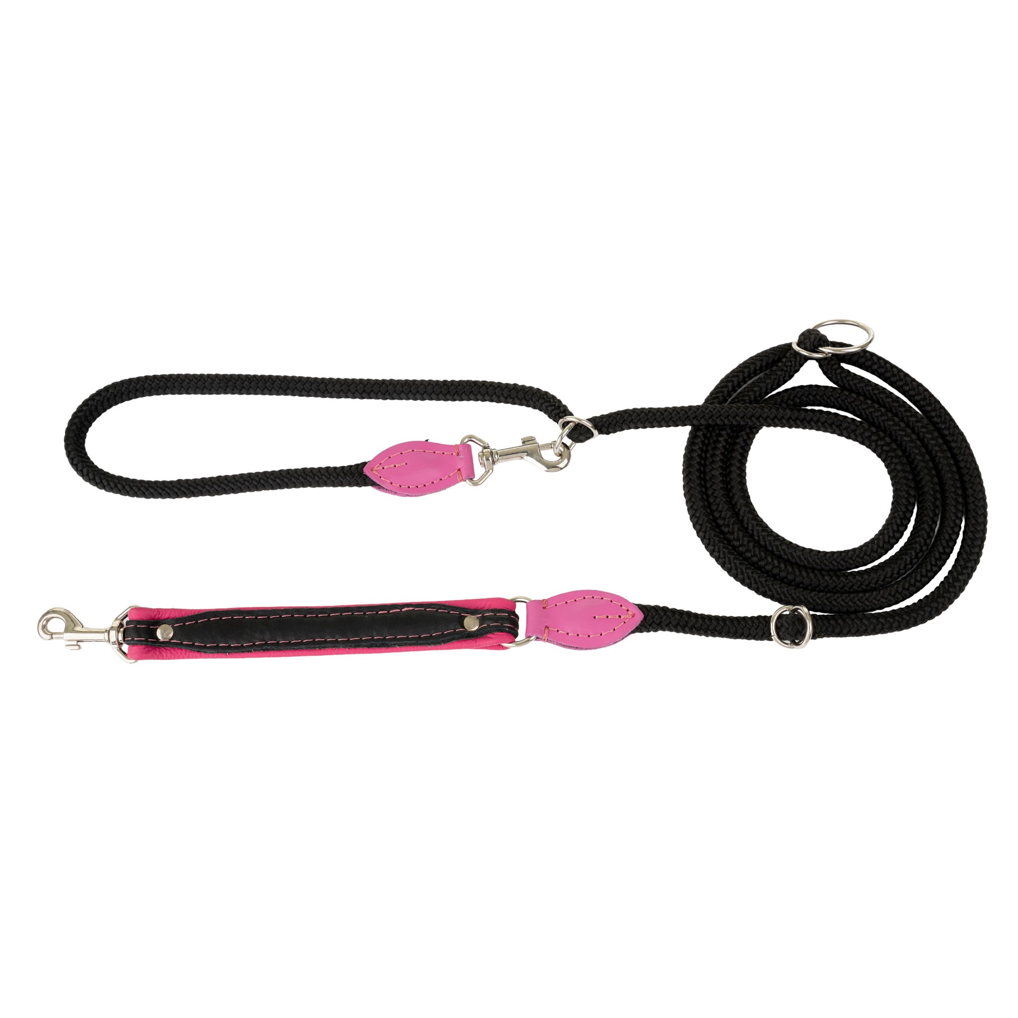 Smycz wykonano z dwóch wysokiej jakości materiałów: naturalnej skóry i mocnej plecionej linki. Część skórzana (20 mm szerokości) została zbudowana z dwóch warstw – od wewnątrz znajduje się gładka, naturalna skóra w kolorze różowym, a z zewnątrz miękka i sprężysta skóra łosia, wyróżniająca się wyjątkową wytrzymałością i odpornością na ścieranie. Czarna pleciona linka o średnicy 6 mm podkreśla kontrastowy charakter smyczy, jednocześnie zapewniając dużą odporność na rozciąganie i uszkodzenia.