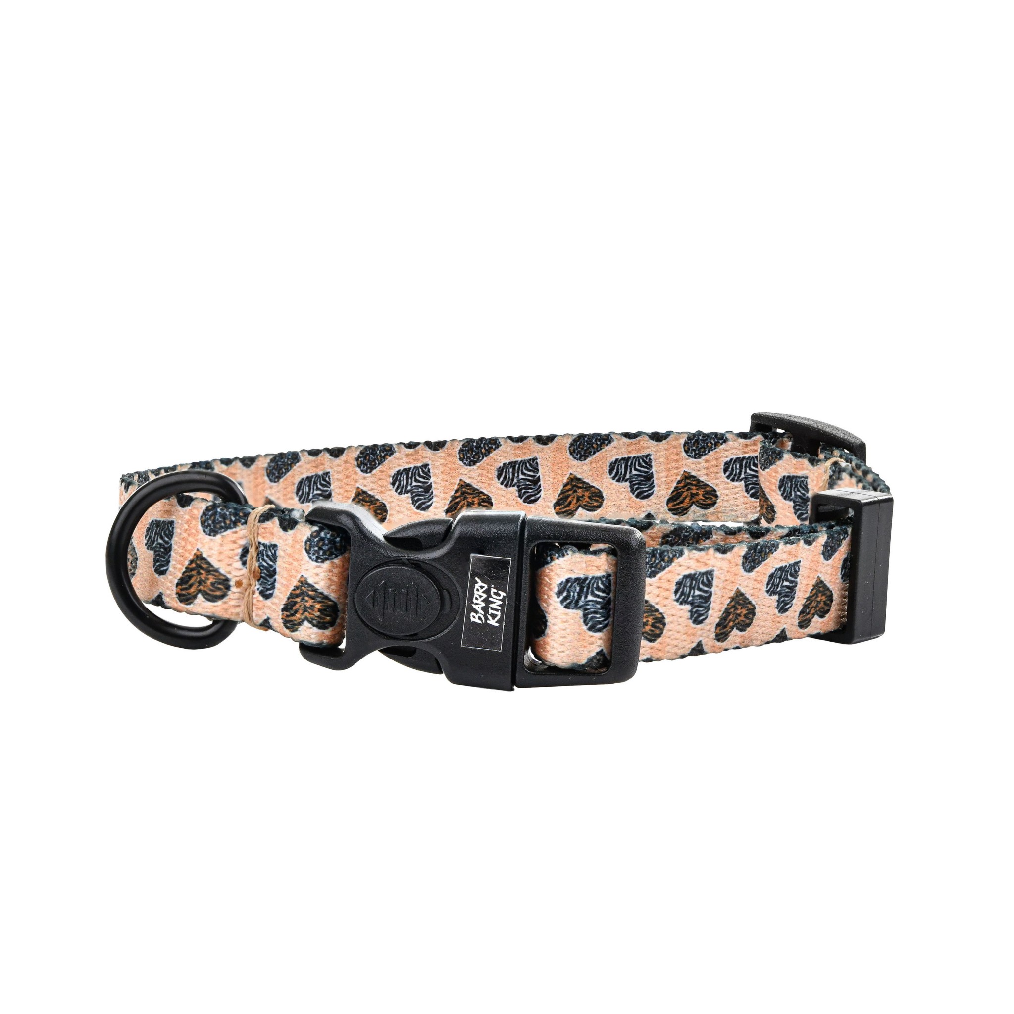 Przedstawiamy obrożę Barry King w subtelnym wzorze Safari Love. Jasna, beżowa taśma ozdobiona delikatnym printem zwierzęcym w kształcie serduszek łączy motyw safari z lekką, elegancką stylistyką. To idealna propozycja dla opiekunów, którzy szukają wygodnej i trwałej obroży dla psa w jasnym, modnym wydaniu.