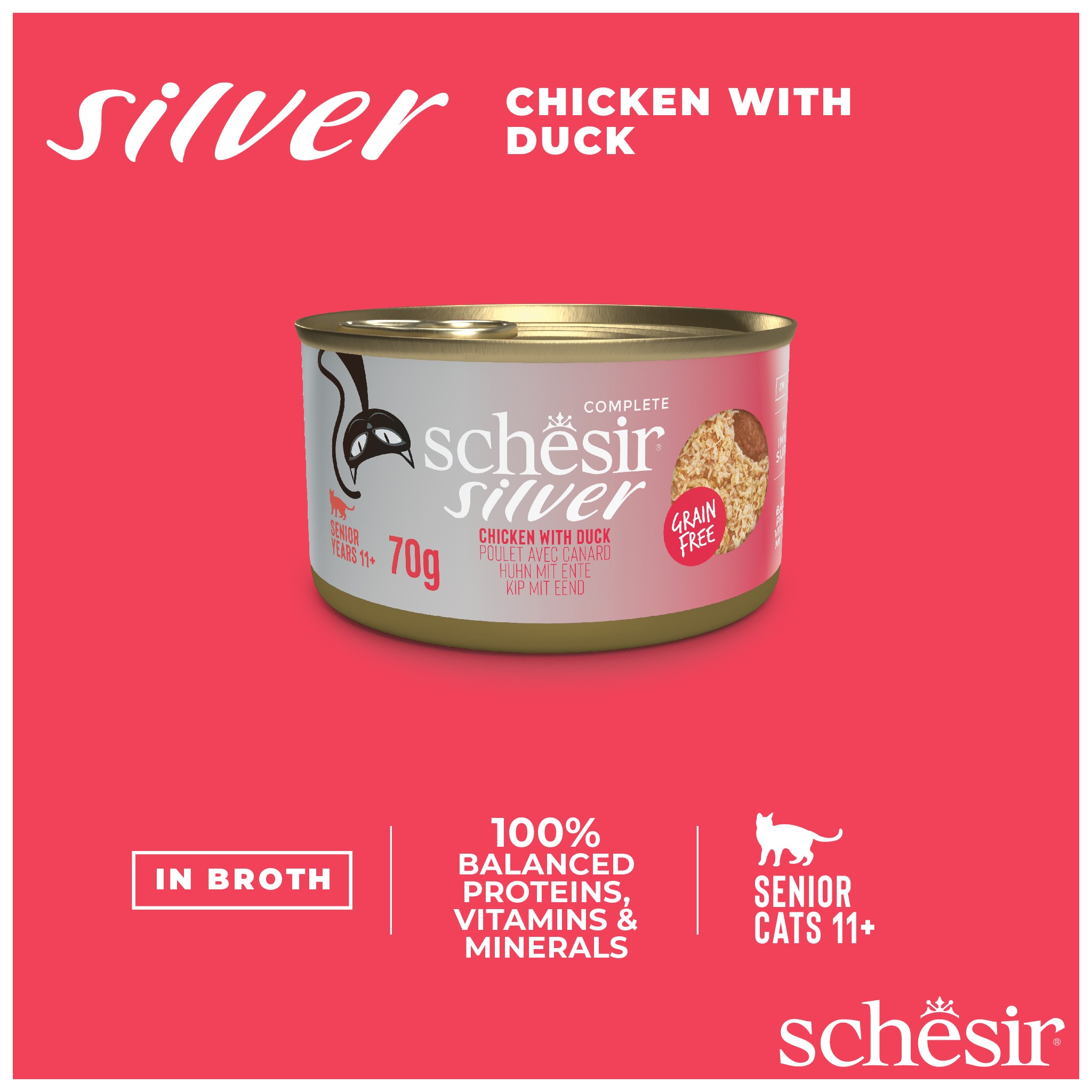 Schesir Silver to linia minimalnie przetworzonych, kompletnych i zbilansowanych mokrych karm, które pomagają utrzymać zdrowie i szczęście starszych kotów, dzięki specjalnym formułom opracowanym specjalnie dla nich.