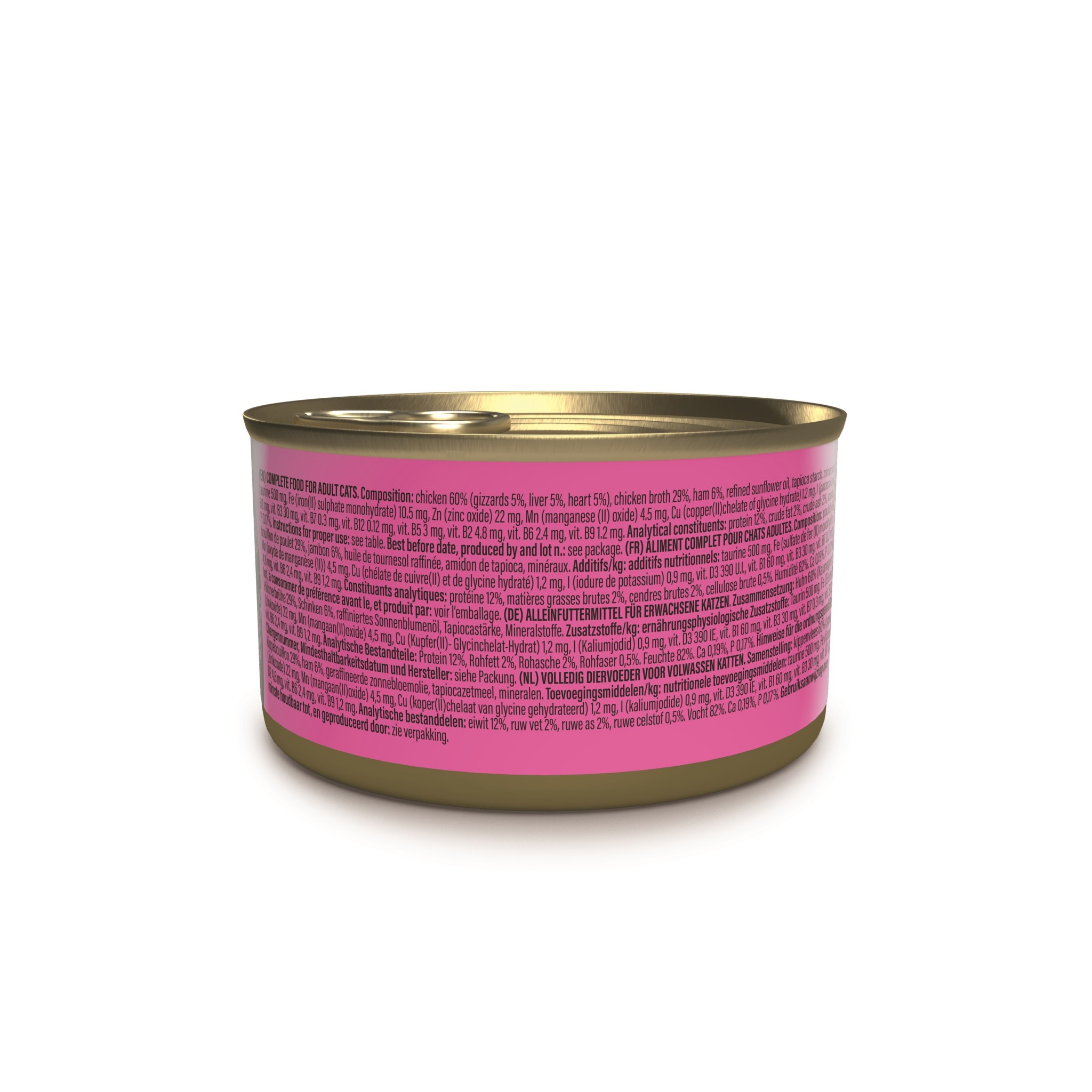 Bogata w białko karma z prawdziwych filetów z kurczaka w bulionie, z dodatkiem smacznych i odżywczych kawałków serca, wątroby, żołądków oraz pysznej szynki.