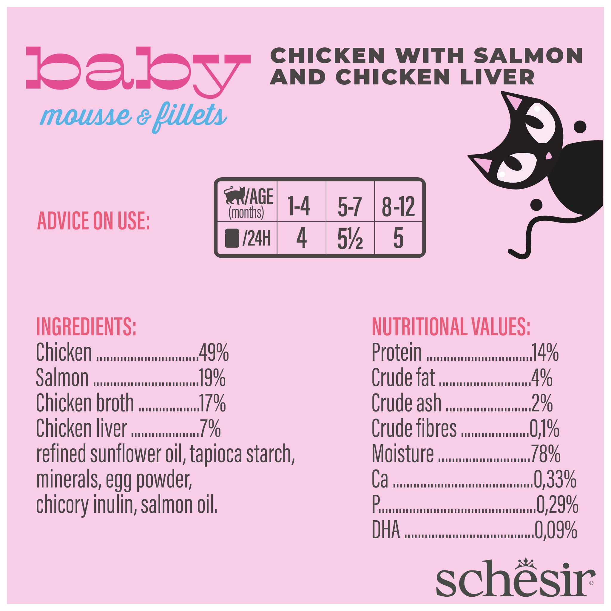 Schesir Baby to linia minimalnie przetworzonej, kompletnej i zbilansowanej mokrej karmy, która zaspokaja złożone potrzeby żywieniowe i energetyczne kociąt.
