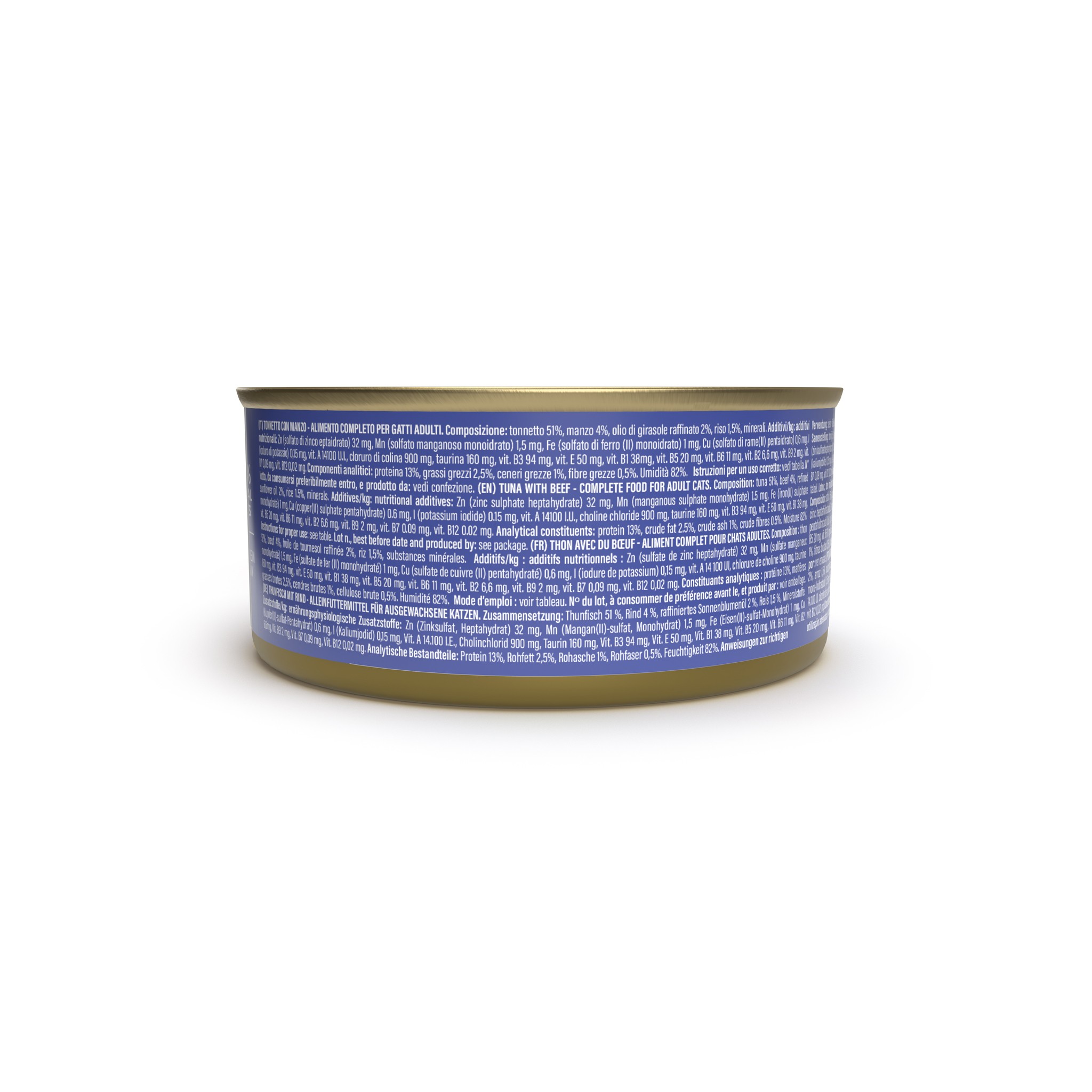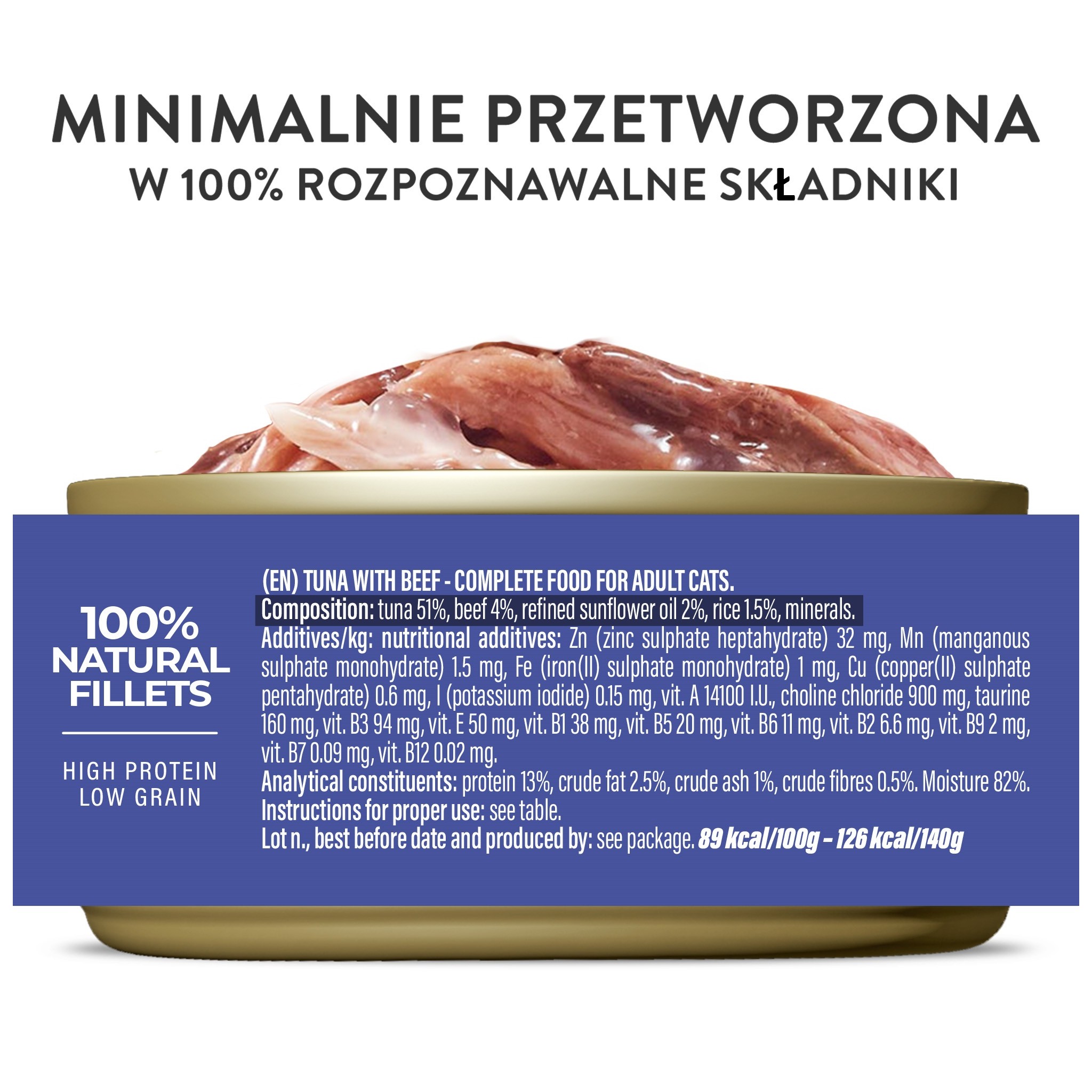 Receptura oparta jest na prawdziwych filetach z pysznego tuńczyka w połączeniu z dodatkiem apetycznej wołowiny, zapewniając ekscytujące doznania smakowe. Karma jest dostępna w postaci galaretki, aby zadowolić gusta kotów, które uwielbiają naturalny smak w połączeniu z bardziej stałą konsystencją w misce.