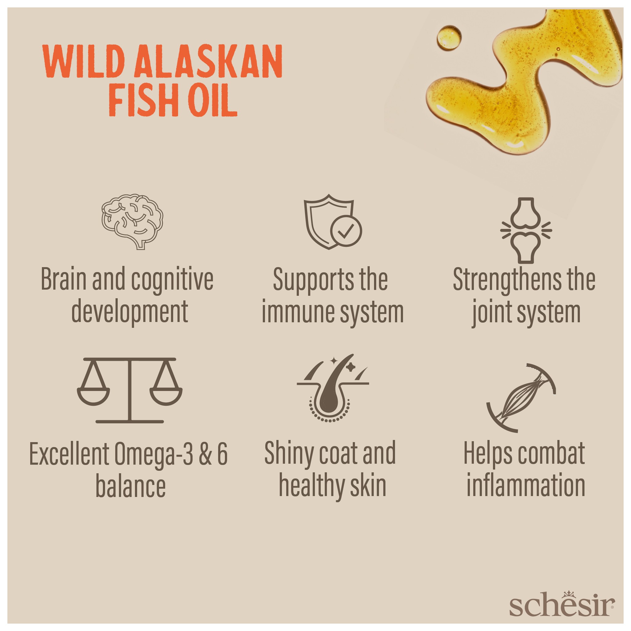 Schesir Wild Alaskan Fish Oil to więcej niż zwykły olej. Jest to naturalne źródło kwasów tłuszczowych Omega-3, które pomagają zapewnić zdrową i błyszczącą skórę i sierść, a także wspierają silny metabolizm i układ odpornościowy.
