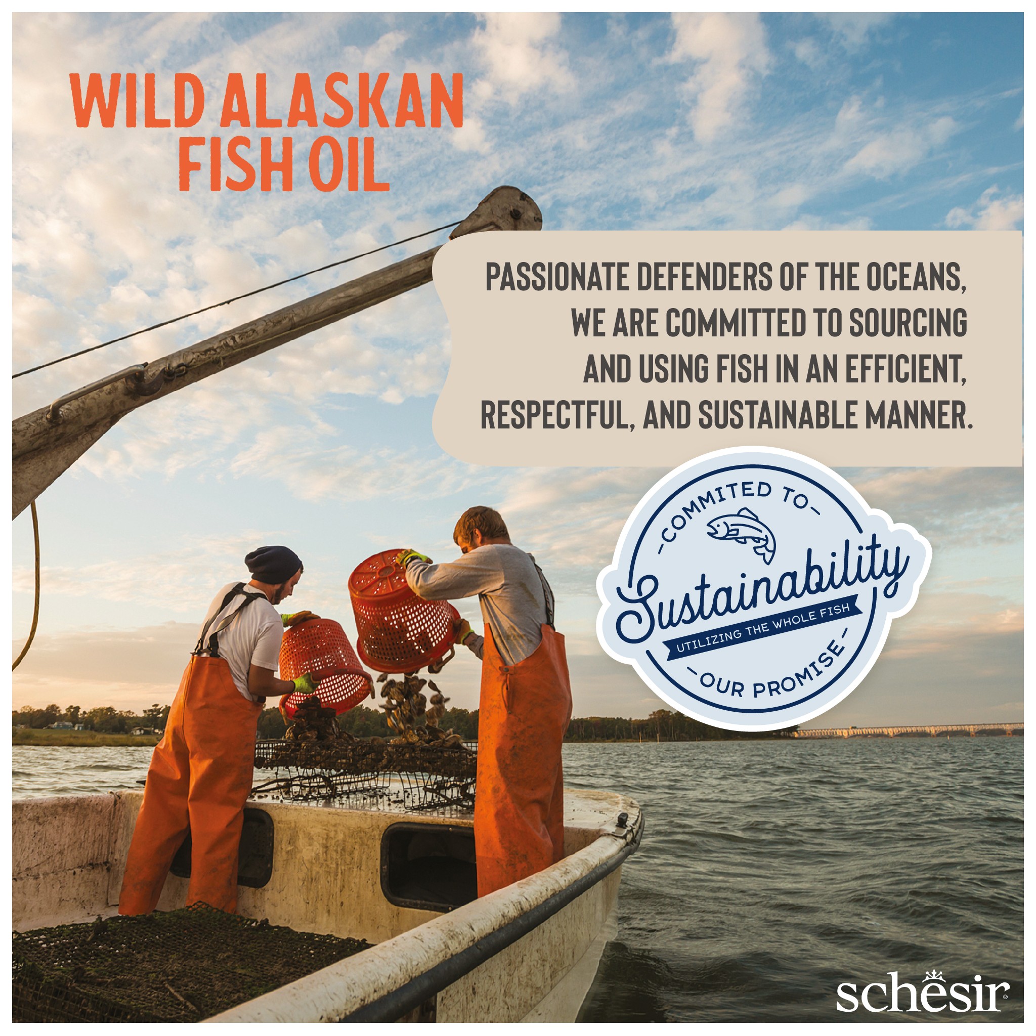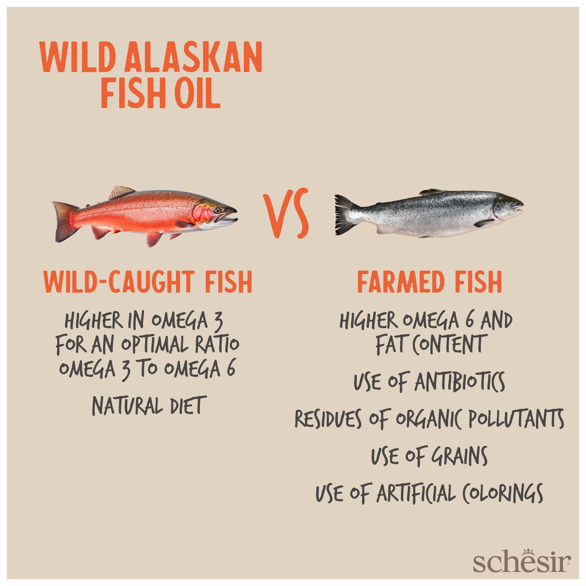 Olej Schesir pochodzi wyłącznie z dzikich ryb złowionych w głębinach Alaski: ryb, które całe swoje życie spędziły na naturalnym odżywianiu się. Dzięki temu olej zawiera zrównoważoną mieszankę cennych tłuszczów omega.