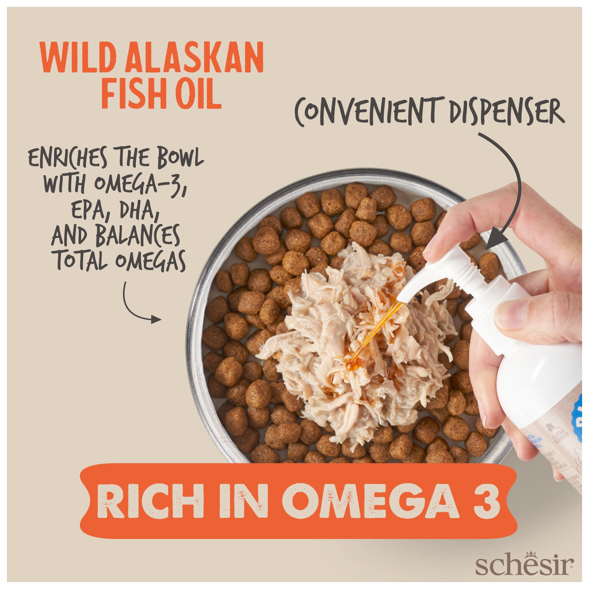 Olej Schesir jest uzupełniającym pokarmem, który dostarcza kwasów tłuszczowych Omega-3, EPA i DHA. Te kwasy tłuszczowe pełnią różne funkcje, w tym wspieranie układu odpornościowego, zdrowia skóry i sierści.