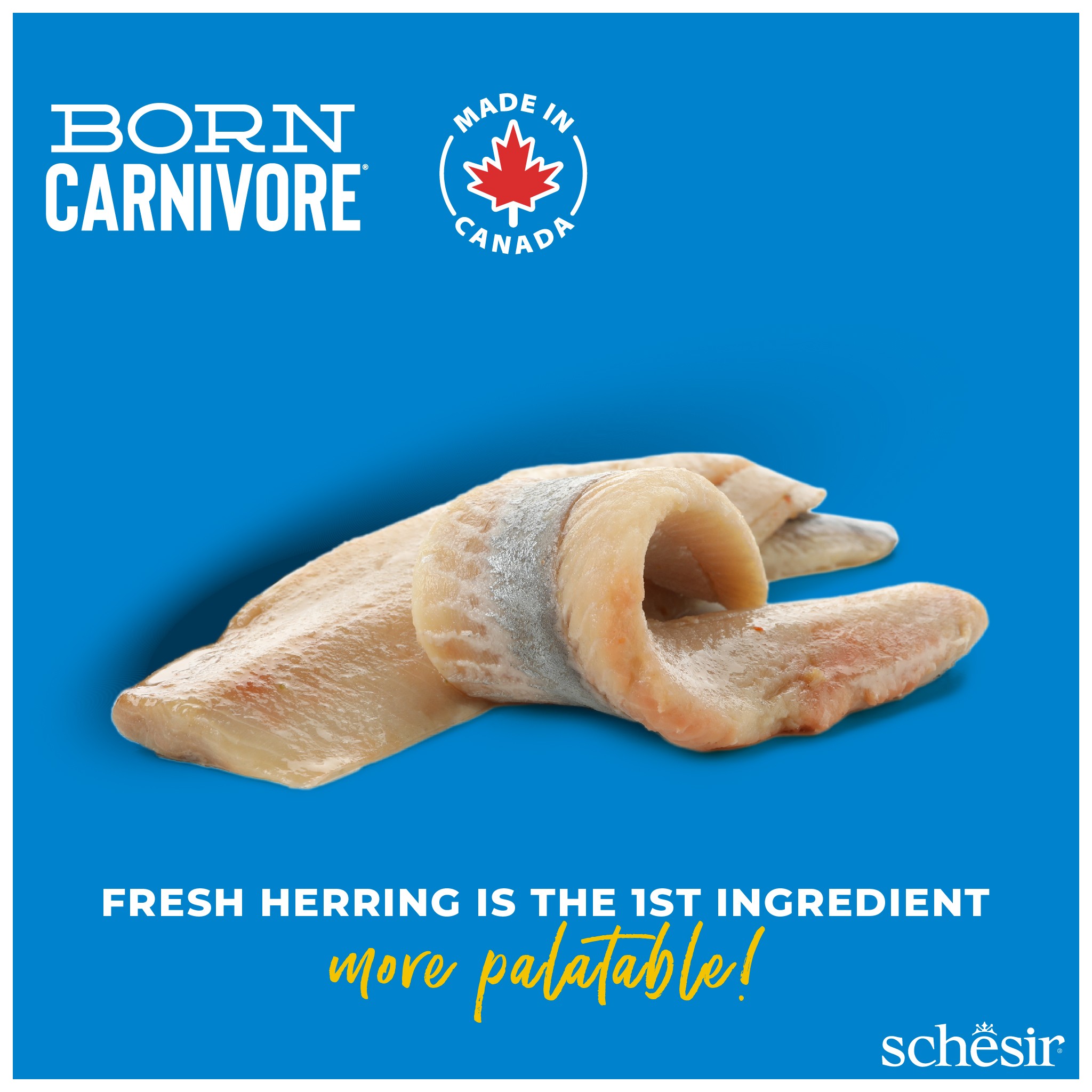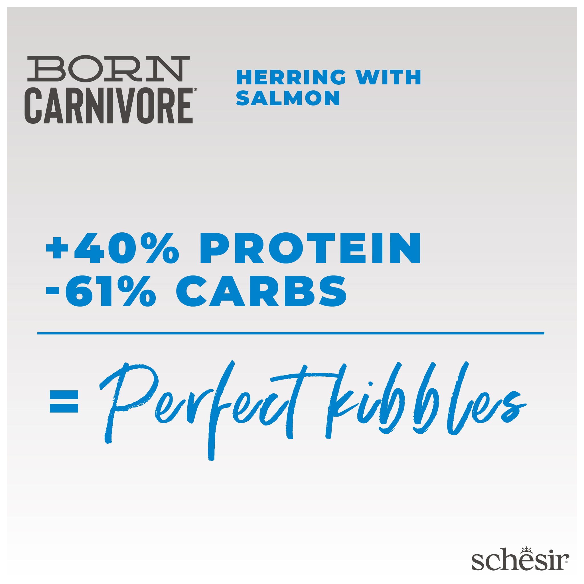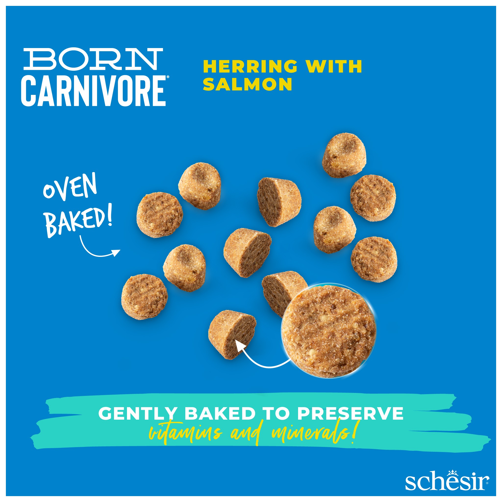 SCHESIR BORN CARNIVORE Adult Śledź z łososiem – to granulki pieczone w piecu, aby zachować witaminy i minerały. Świeży śledź to pierwszy składnik (33%), niska zawartość węglowodanów, z błonnikiem dla łatwego trawienia oraz kwasami omega 3 i 6 dla zdrowej skóry i sierści. Kompletny, wysoko białkowy posiłek, wyprodukowany w Kanadzie.