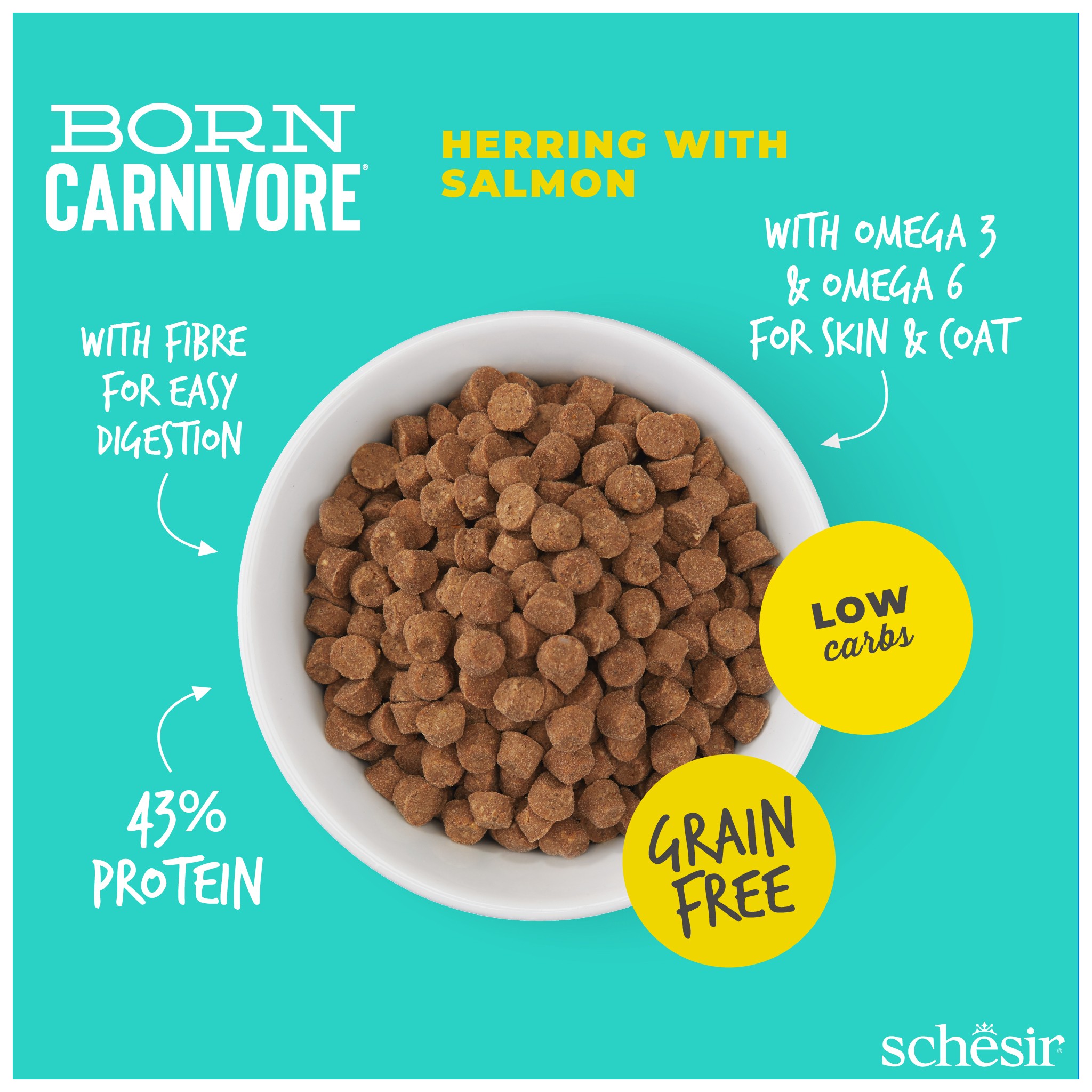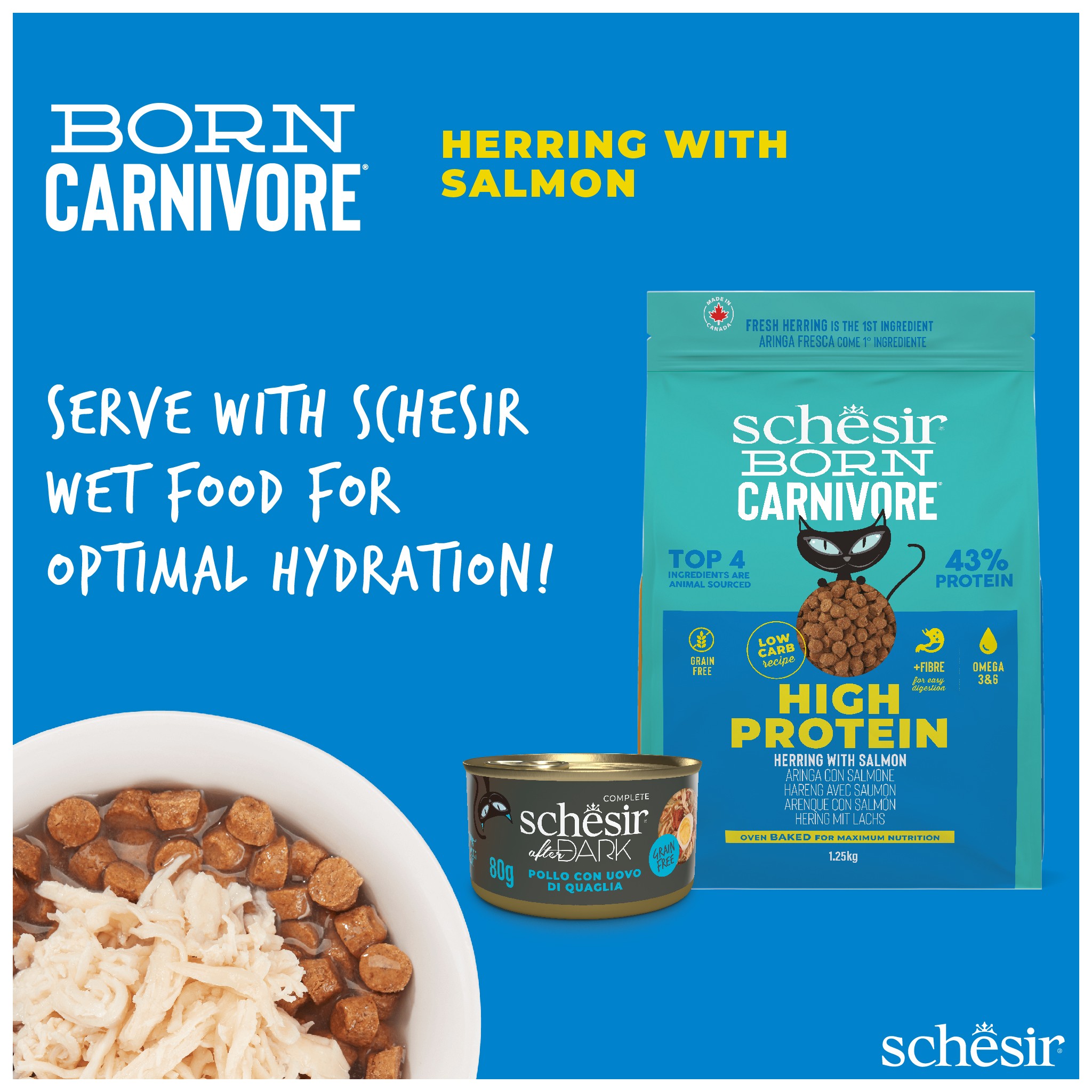 • Schesir Born Carnivore to receptura o wysokiej zawartości białka zwierzęcego dla prawdziwych mięsożerców (43%).