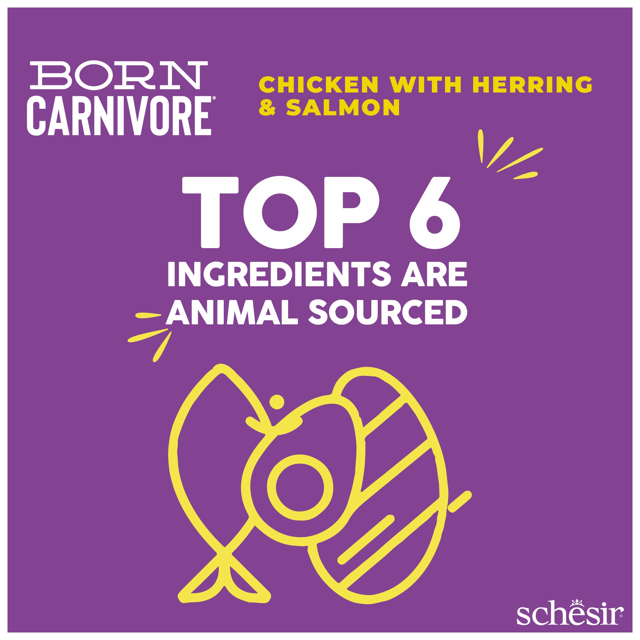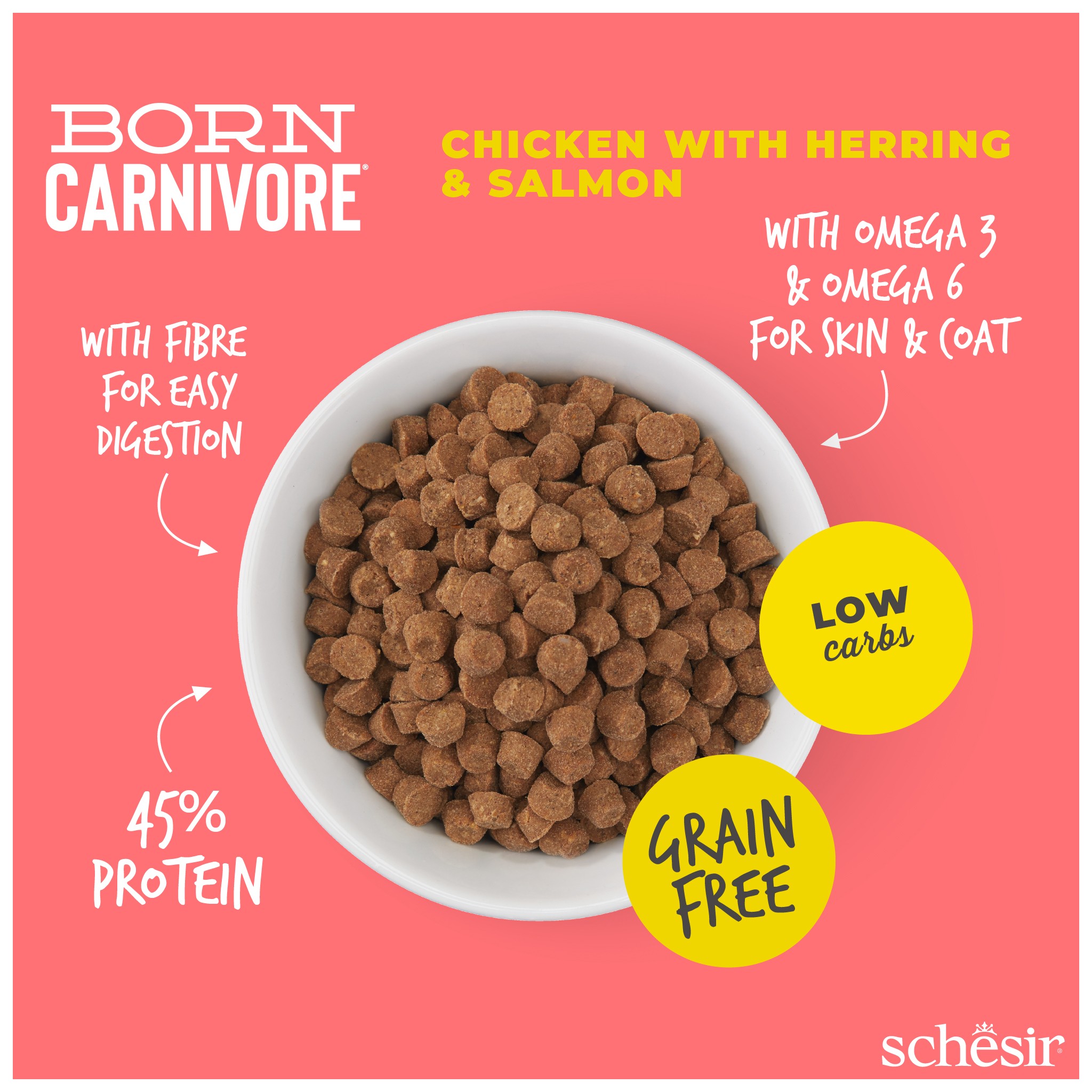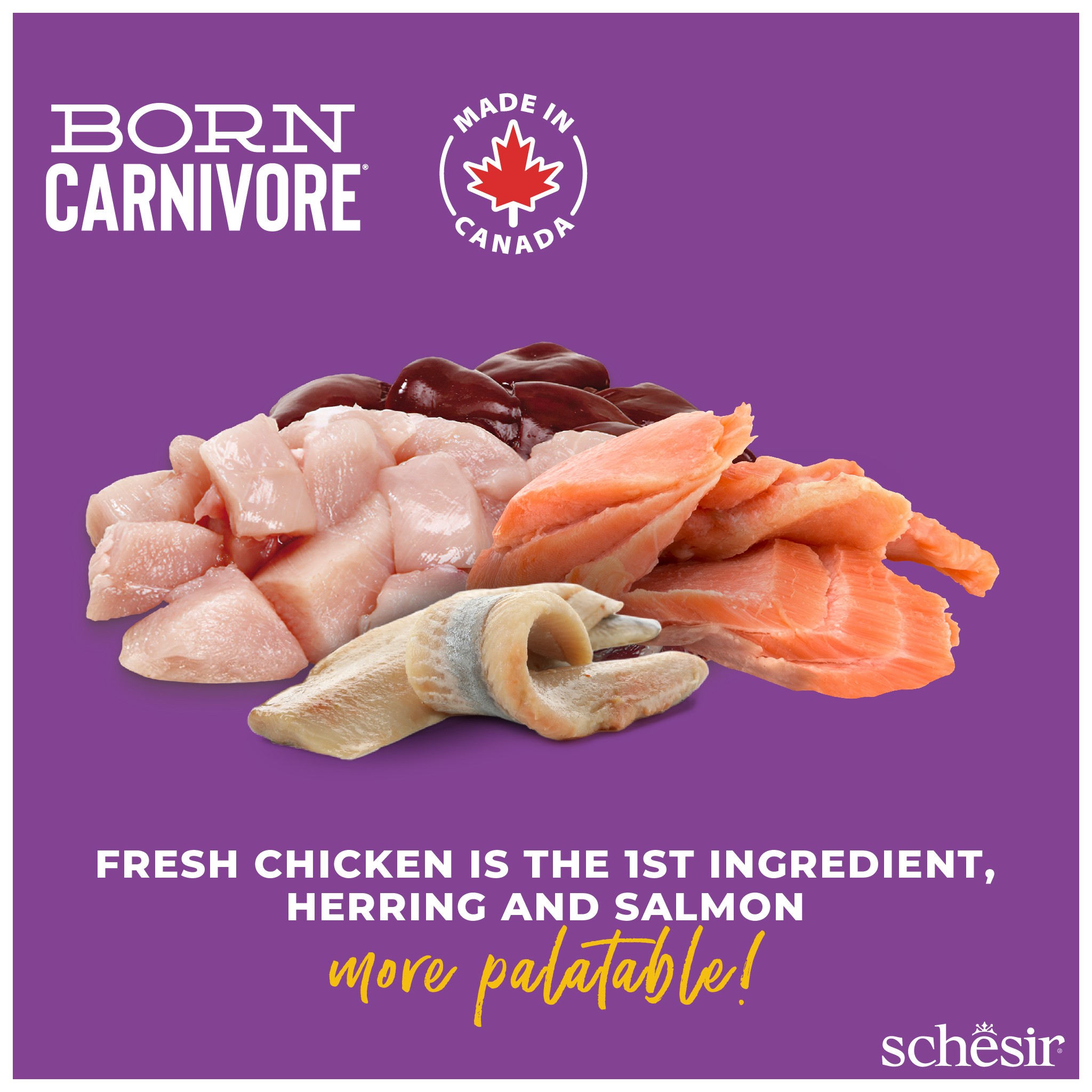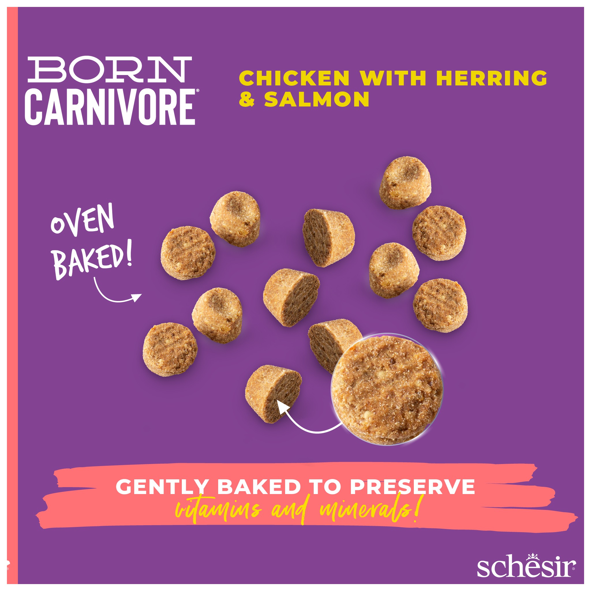 SCHESIR BORN CARNIVORE Adult Kurczak ze śledziem i łososiem - granulki pieczone w piecu, aby zachować witaminy i minerały. Świeży kurczak i świeży śledź to pierwsze składniki (35%), niska zawartość węglowodanów, z błonnikiem dla łatwego trawienia oraz kwasami omega 3&6 dla zdrowej skóry i sierści. Kompletny, wysoko białkowy posiłek, wyprodukowany w Kanadzie.