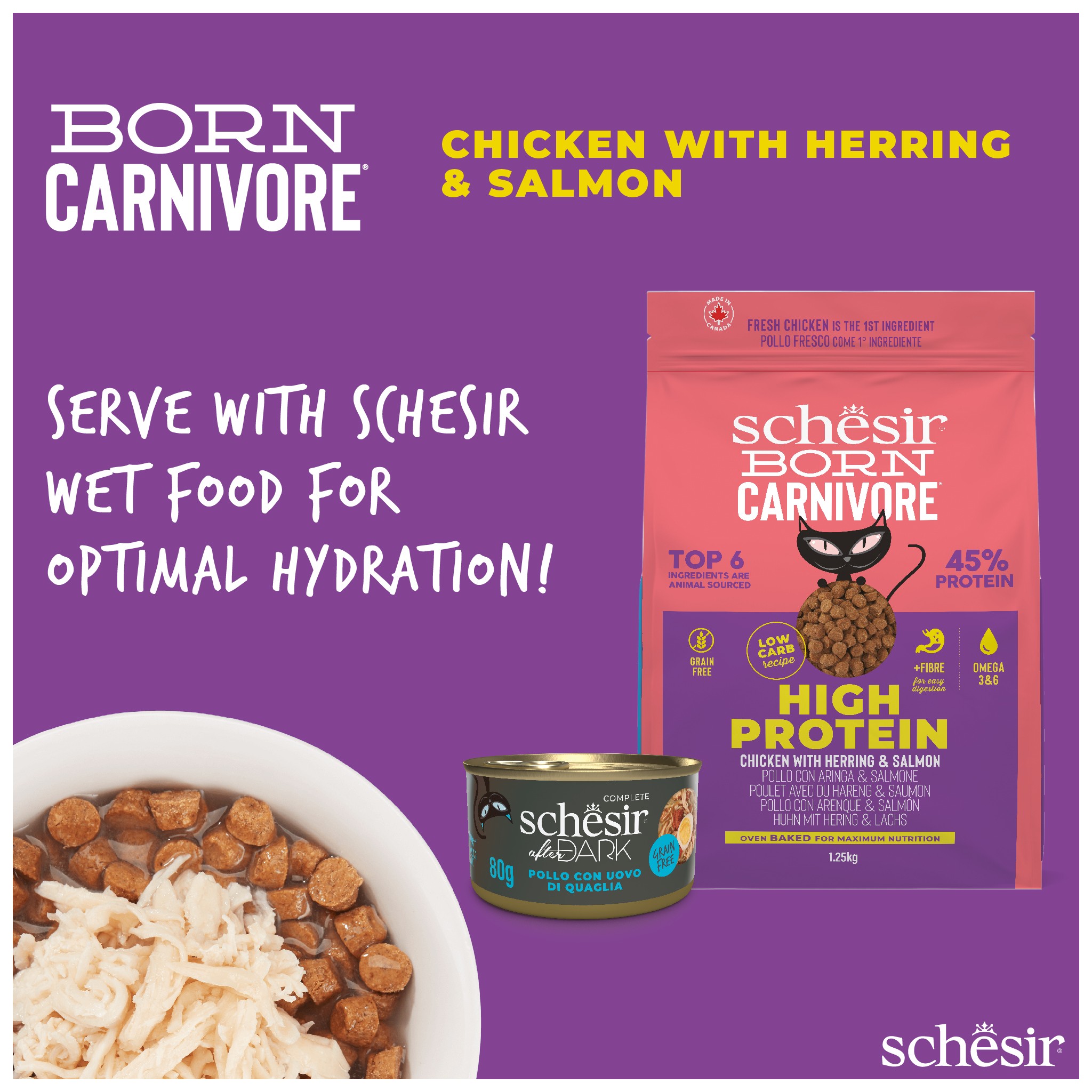 • Schesir Born Carnivore to receptura z wysoką zawartością białka zwierzęcego dla prawdziwych mięsożerców (45%)