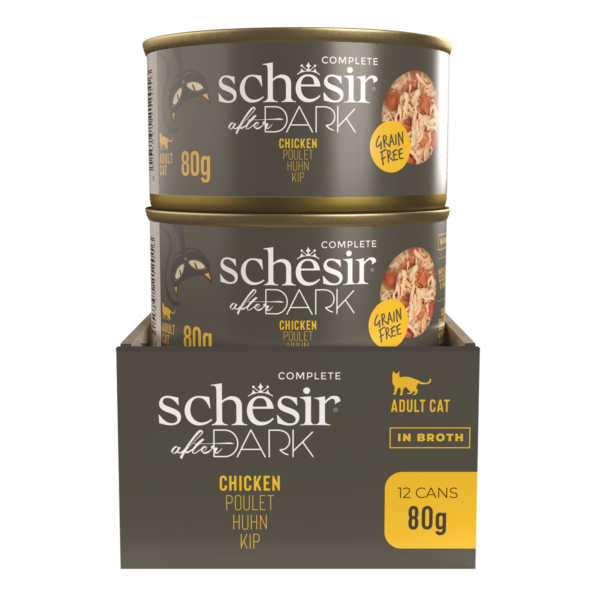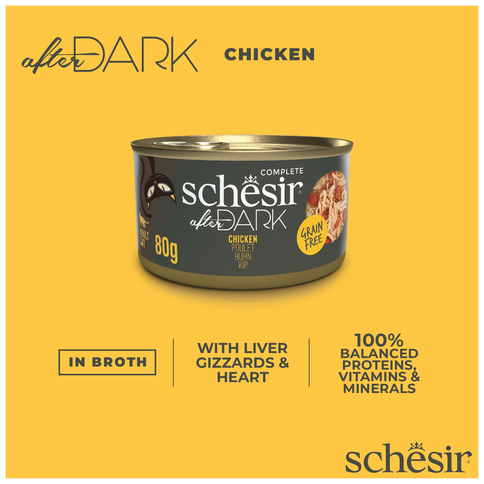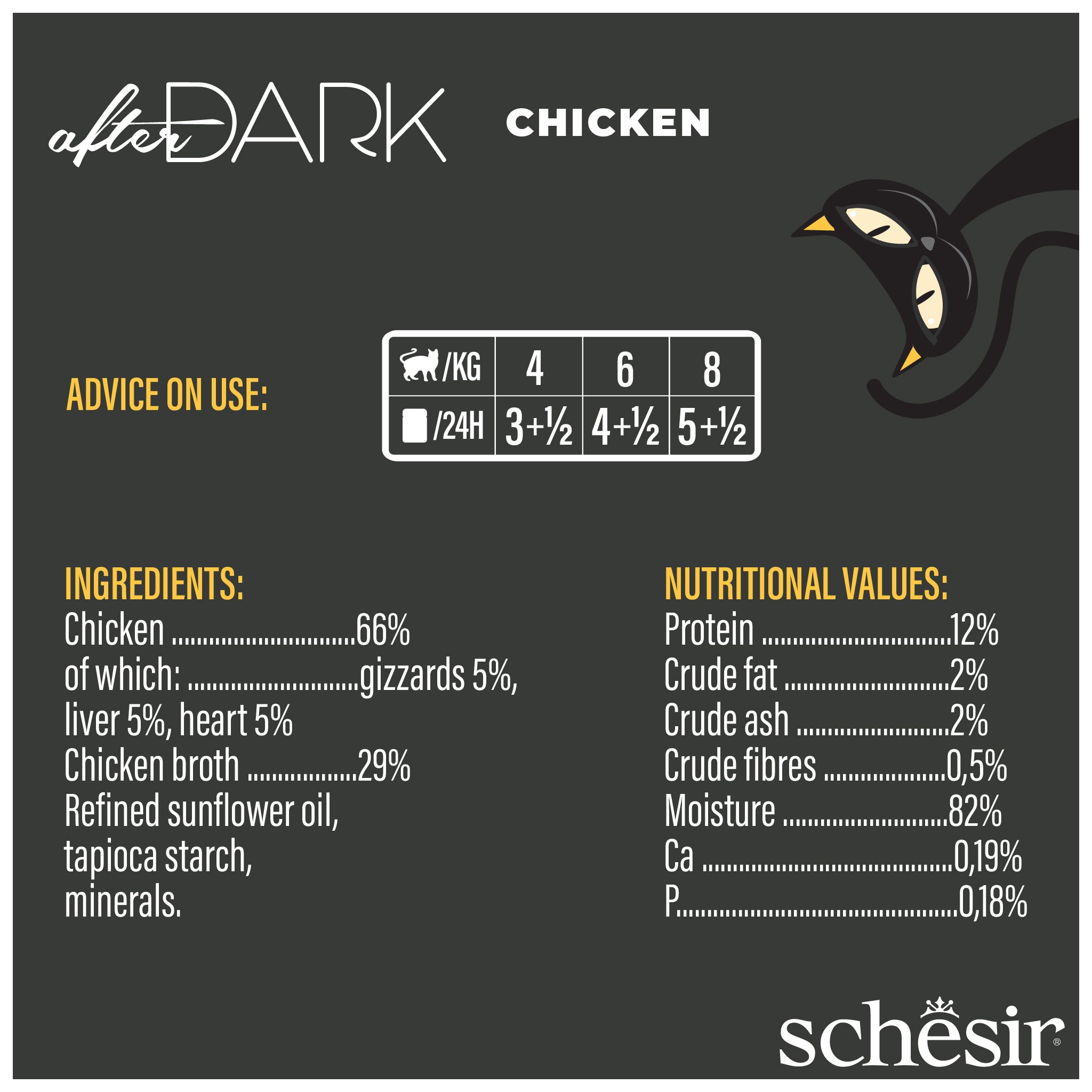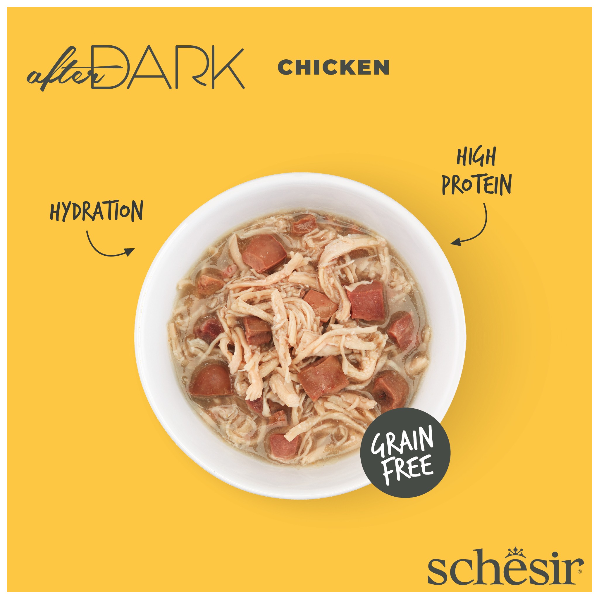 Schesir After Dark to linia minimalnie przetworzonych, kompletnych i zbilansowanych mokrych karm o wysokiej zawartości białka, przeznaczona dla kotów, które kochają smak mięsa i podrobów.