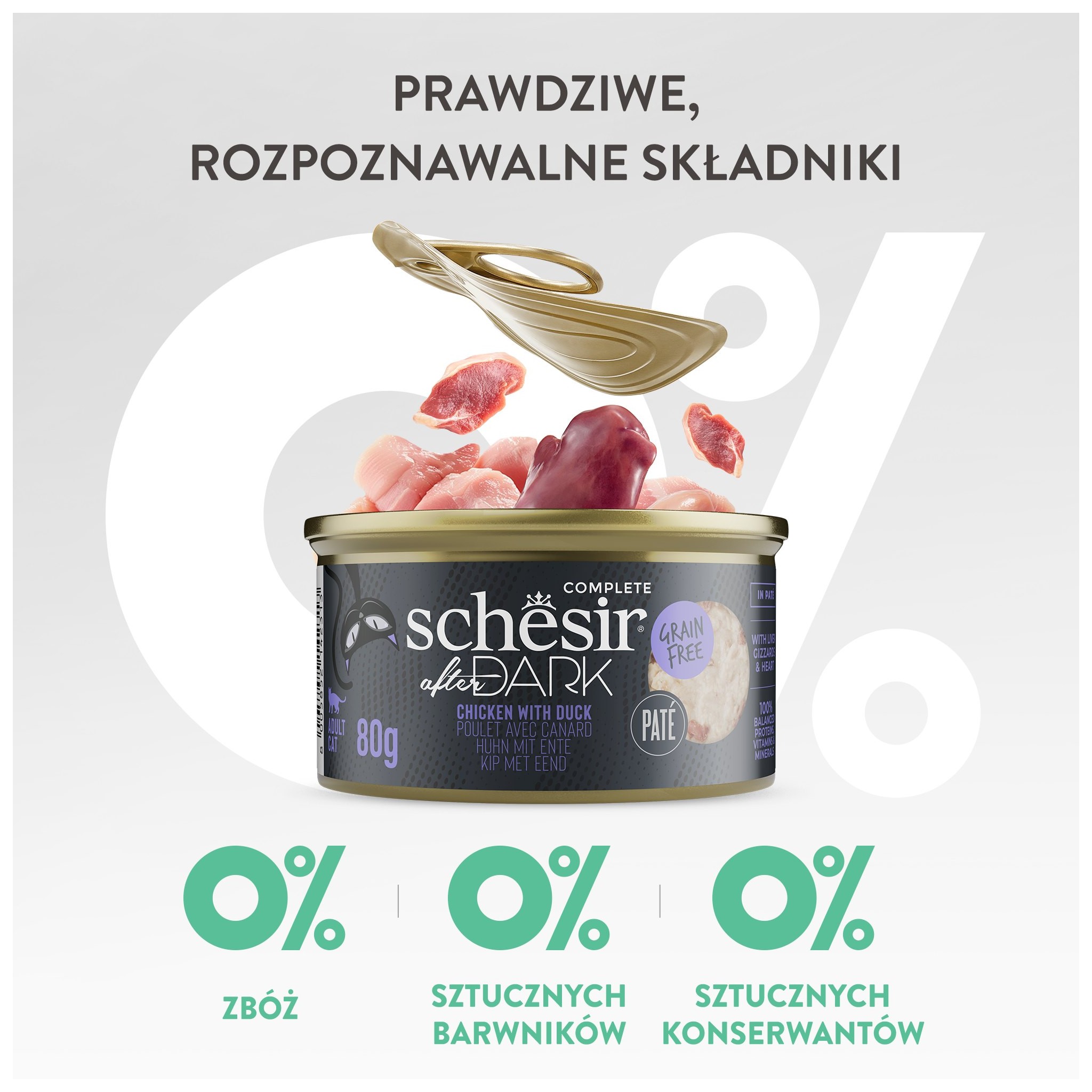 Schesir After Dark to linia mokrych karm stworzona z myślą o kotach, które potrzebują diety bogatej w mięso i podroby, zgodnej z ich naturalnymi potrzebami żywieniowymi. Pasztet z kurczaka z dodatkiem kaczki, serc, wątróbki i żołądków to kompletny i zbilansowany posiłek, który dostarcza wysokiej jakości białka, witamin i minerałów. Dzięki minimalnej obróbce składników zachowuje maksimum wartości odżywczych, a wilgotna, kremowa konsystencja wspiera prawidłowe nawodnienie organizmu.