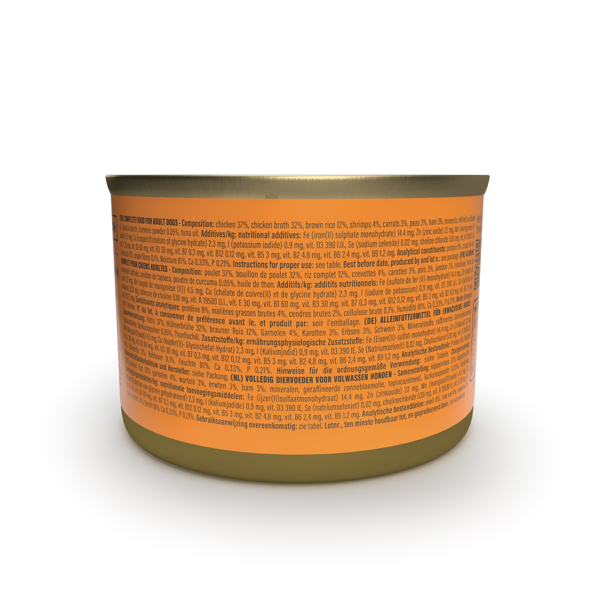 kurczak 37%, bulion z kurczaka 32%, brązowy ryż 12%, krewetki 4%, marchew 3%, groszek 3%, szynka 3%, minerały, rafinowany olej słonecznikowy, skrobia z tapioki, kurkuma w proszku 0,05%, olej z tuńczyka.