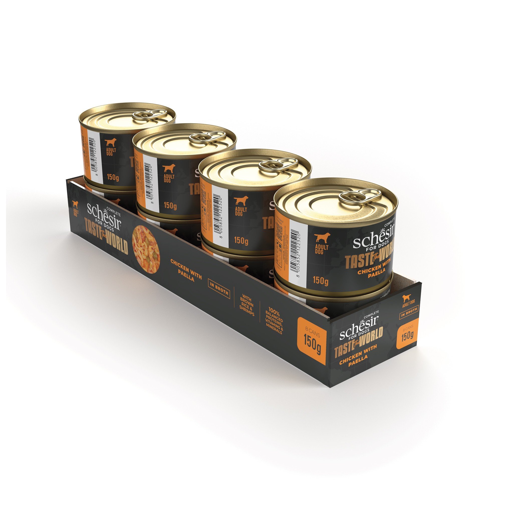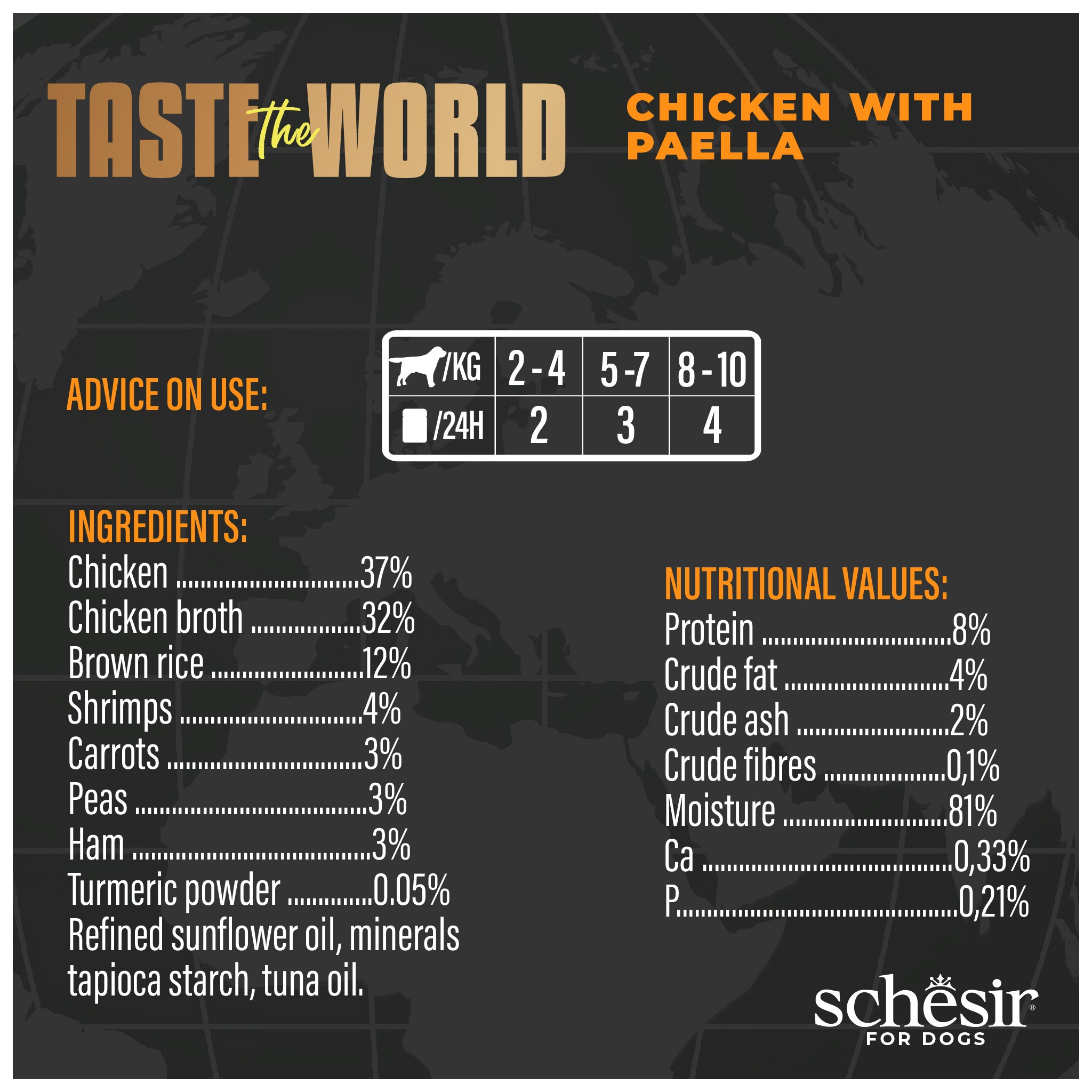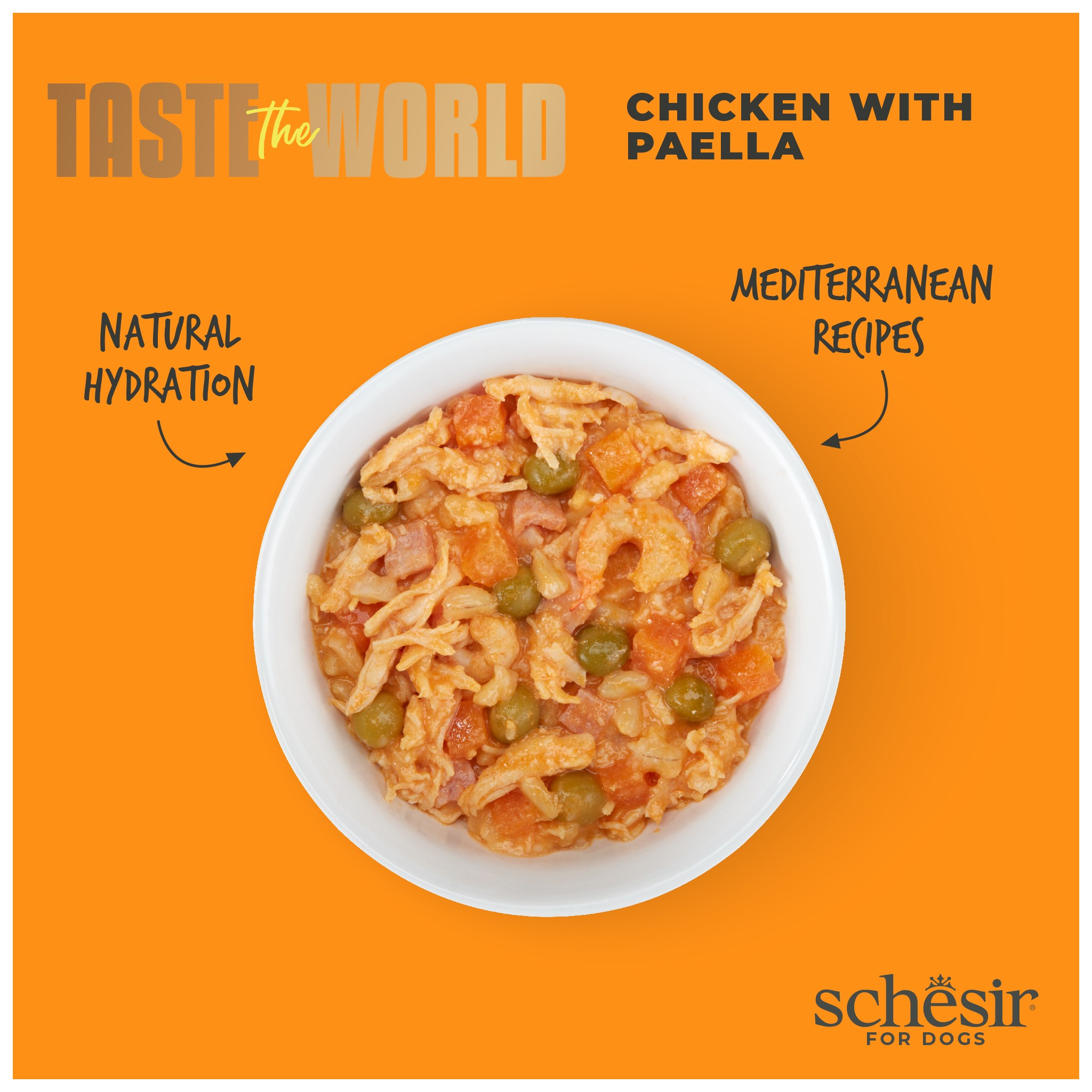 Brązowy ryż, krewetki, szynka i warzywa towarzyszą filetom z kurczaka: pełny i zbilansowany posiłek inspirowany słynną paellą, oferujący Twojemu psu wysoką jakość składników w pysznej kombinacji smaków.