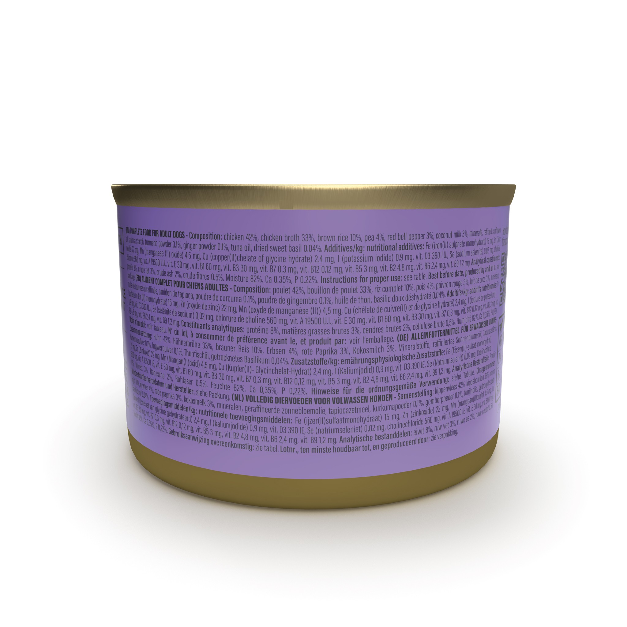 Kurczak z brązowym ryżem i mlekiem kokosowym, uzupełniony smacznymi i oryginalnymi warzywami: pełny i zbilansowany posiłek inspirowany kuchnią tajską, oferujący Twojemu psu wysokiej jakości składniki w pysznej kombinacji smaków.