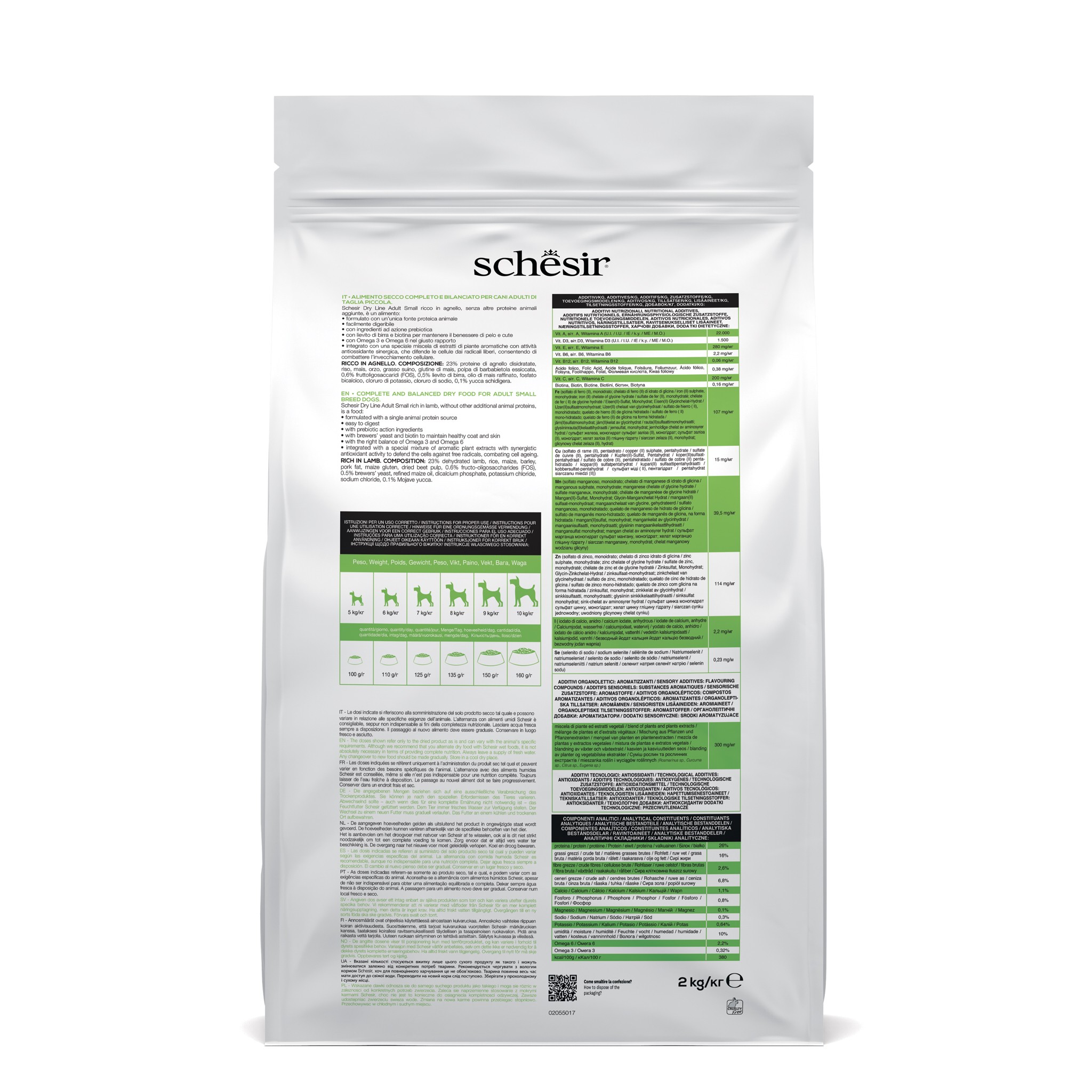 Aby zapewnić kompletną i zbilansowaną dietę, warto codziennie podawać psu zarówno suchą, jak i mokrą karmę Schesir. Przejście na nową karmę powinno być stopniowe. Podane ilości odnoszą się do podawania samego suchego produktu lub w połączeniu z mokrym i mogą się różnić w zależności od indywidualnych potrzeb zwierzęcia.