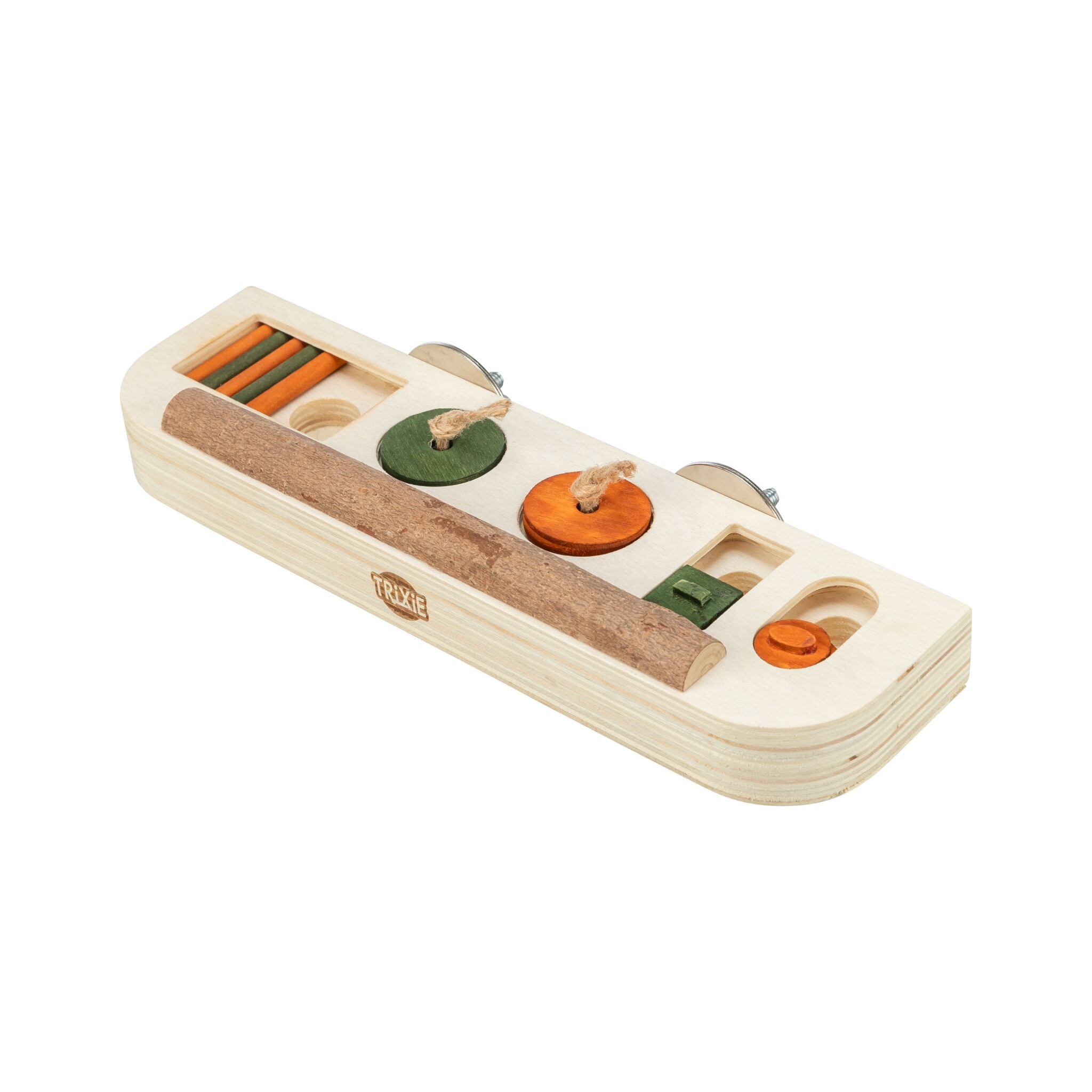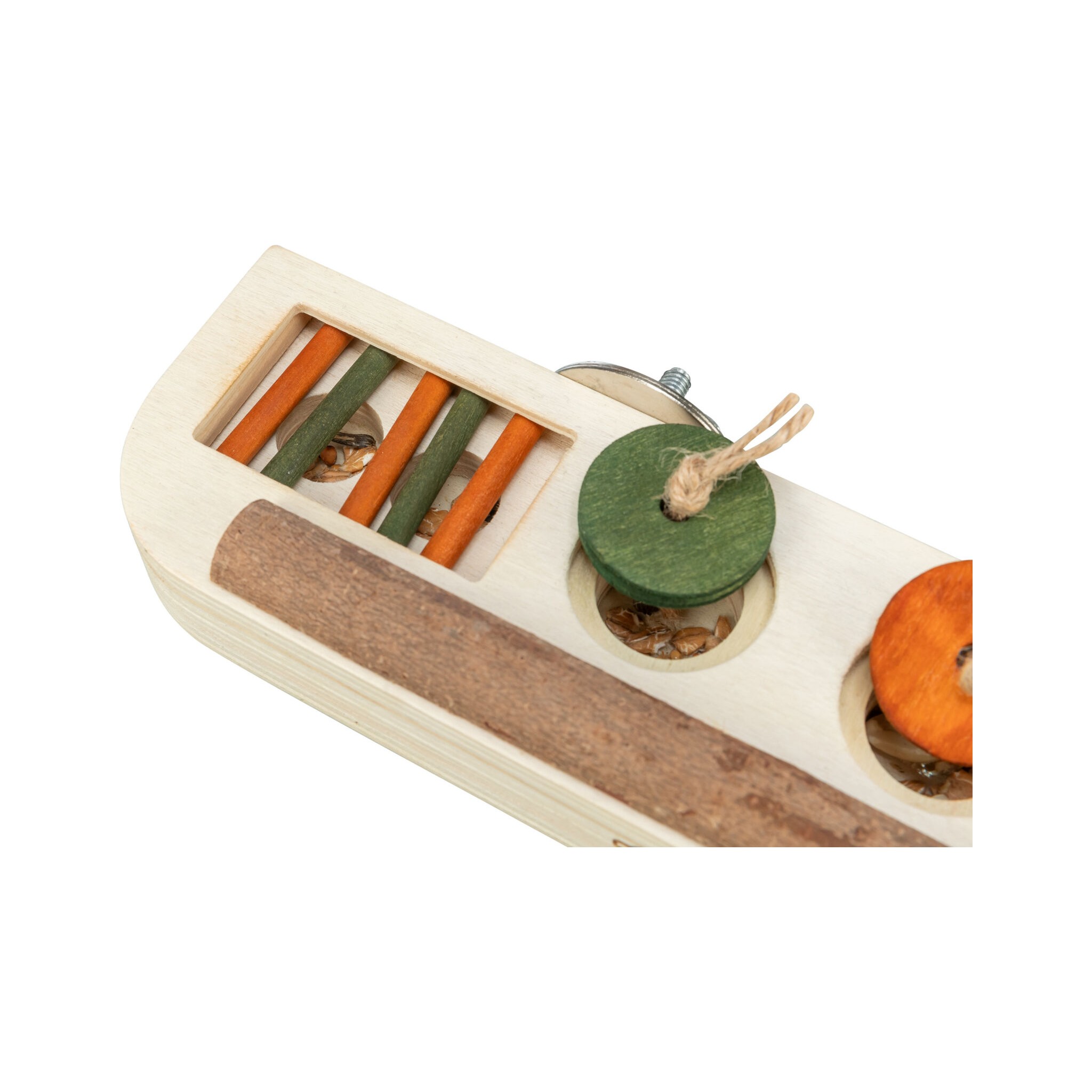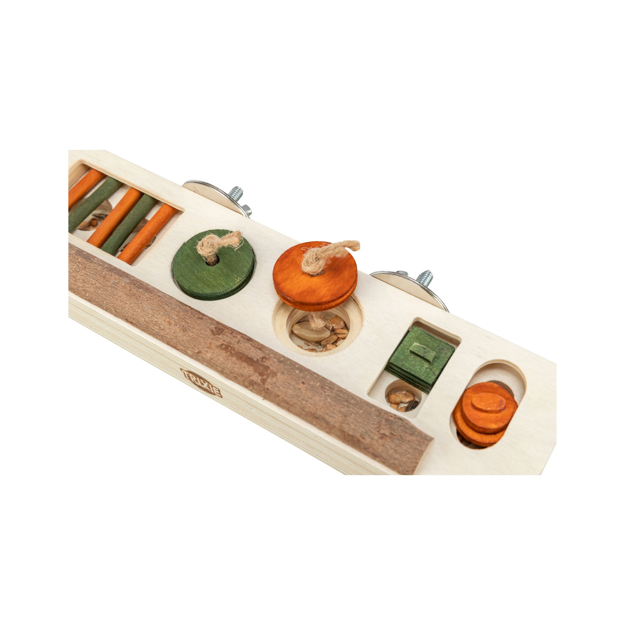 Zabawka-smakołyk to plansza do gry z drążkami, przesuwanymi pokrywami i wgłębieniami, która umożliwia zwierzęciu otrzymywanie nagrody poprzez ciągnięcie i pchanie. Zabawka wykonana jest z drewna i wyposażona w śrubę mocującą, pobudzając aktywność i umysł zwierzęcia. Produkt polecany przez World Bird Park Walsrode.