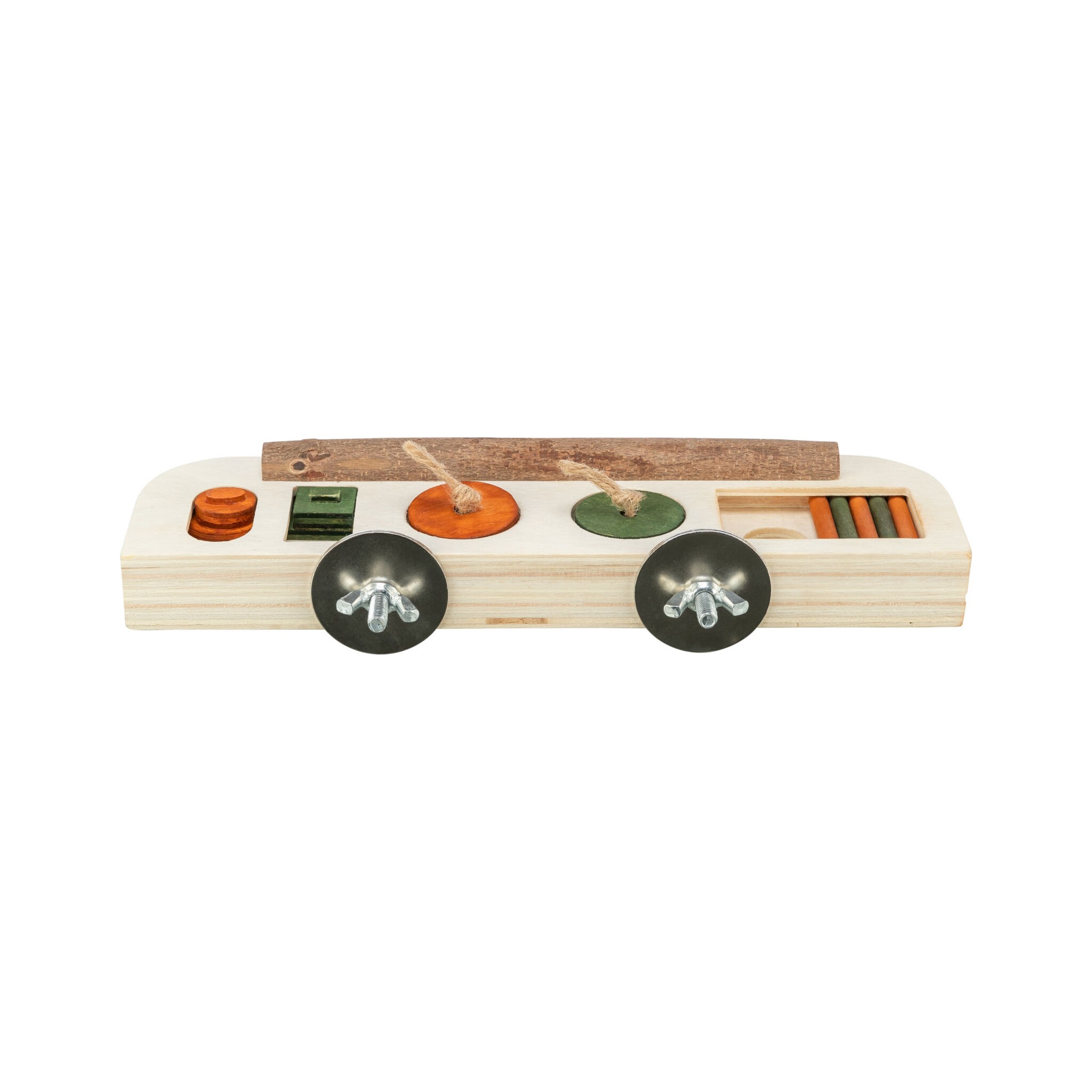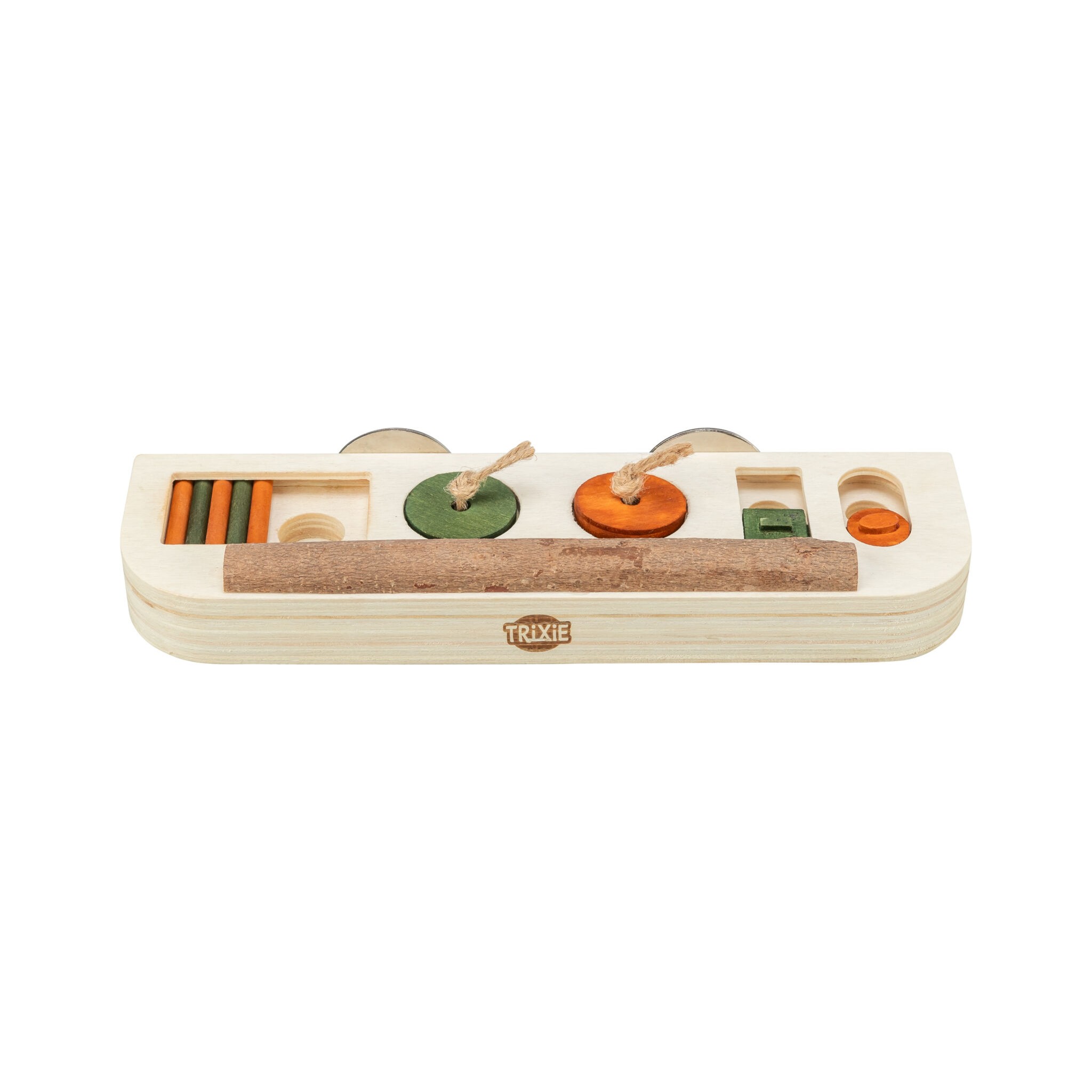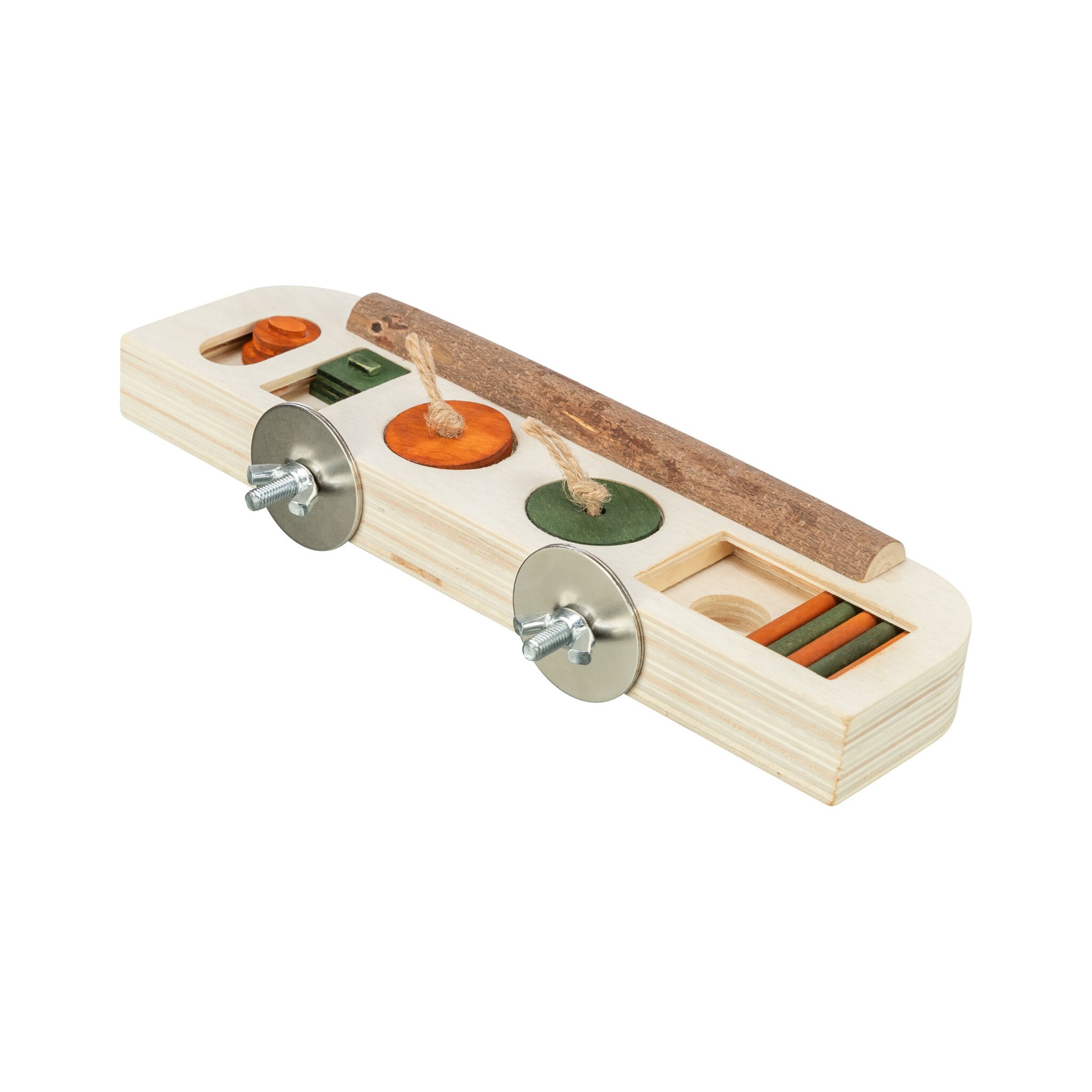 Zabawka-smakołyk to plansza do gry z drążkami, przesuwanymi pokrywami i wgłębieniami, która umożliwia zwierzęciu otrzymywanie nagrody poprzez ciągnięcie i pchanie. Zabawka wykonana jest z drewna i wyposażona w śrubę mocującą, pobudzając aktywność i umysł zwierzęcia. Produkt polecany przez World Bird Park Walsrode.