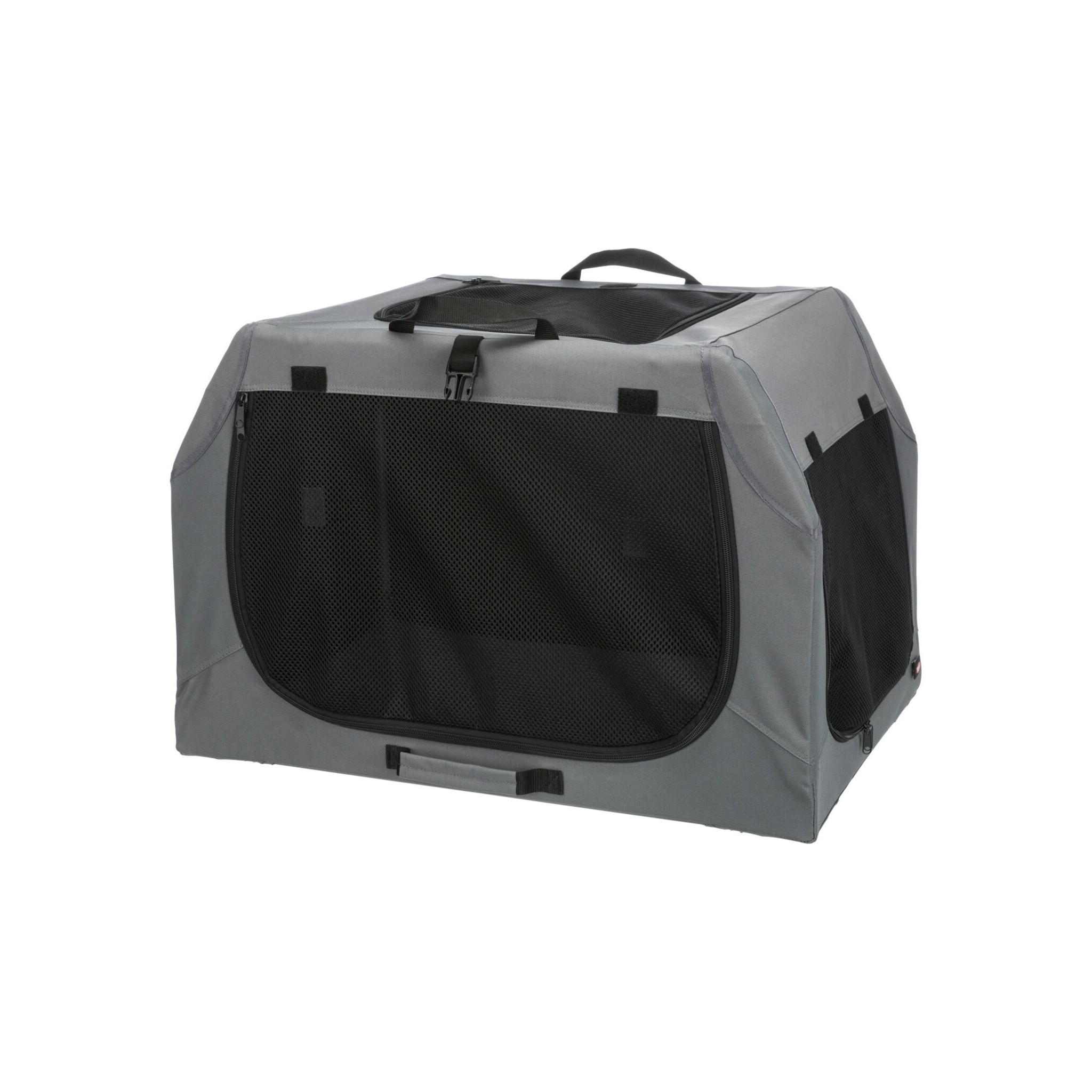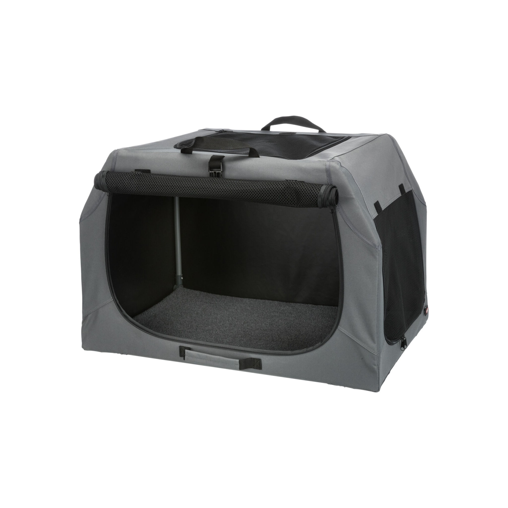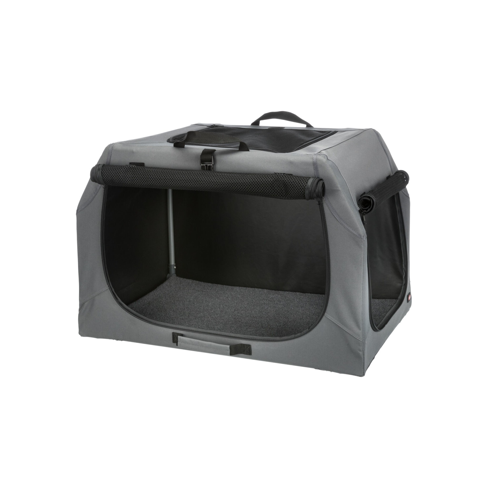 Klatka dla psa Easy to praktyczne i wygodne rozwiązanie do transportu czworonoga. Wyposażona w stabilną ramę metalową oraz otwarcie z trzech stron zapewnia bezpieczeństwo i wygodę zwierzęciu. Trzy rączki ułatwiają przenoszenie, a mata do leżenia z imitacji futra jagnięcego zapewnia komfortowy odpoczynek podczas podróży. Wykonana z poliestru, w kolorze szarym.
