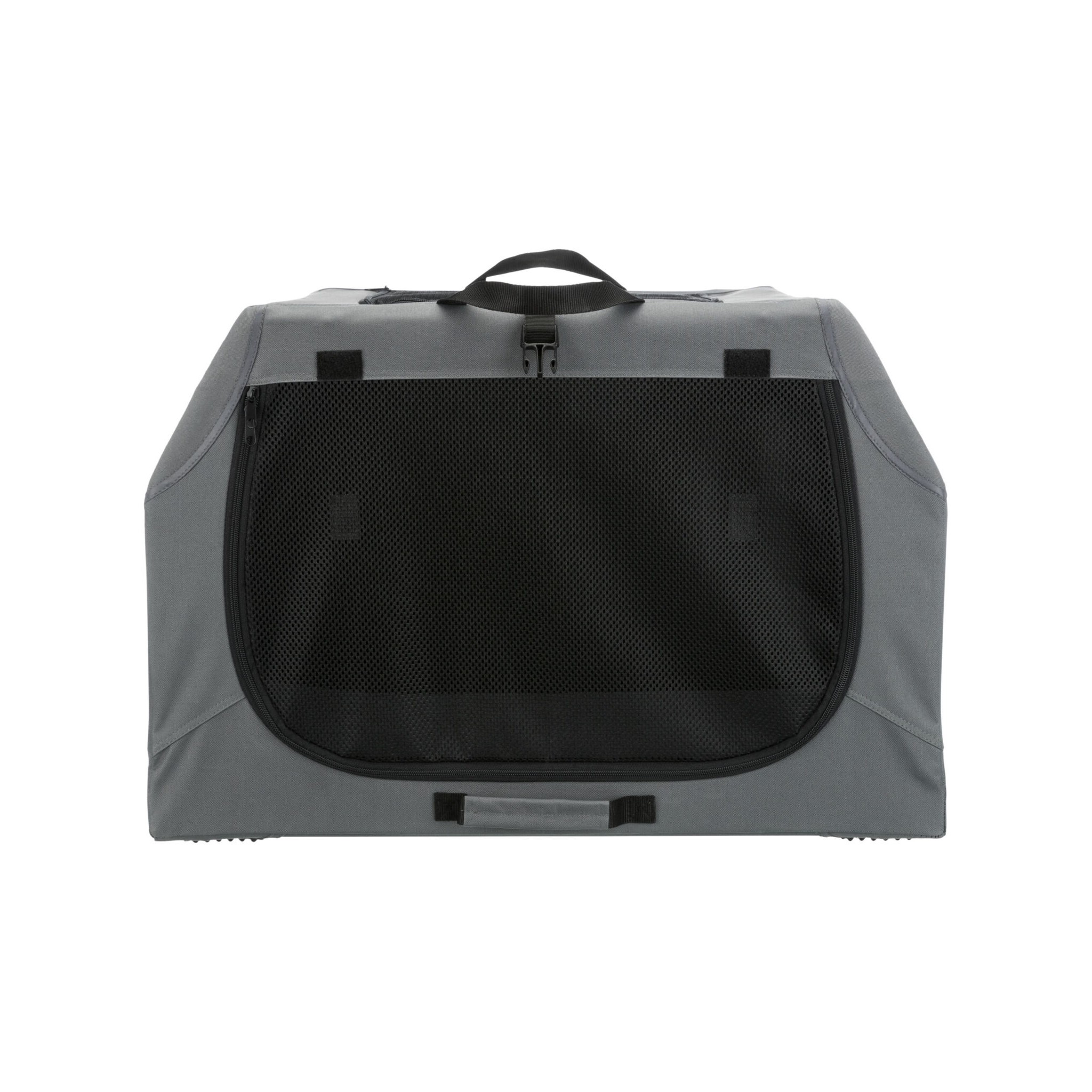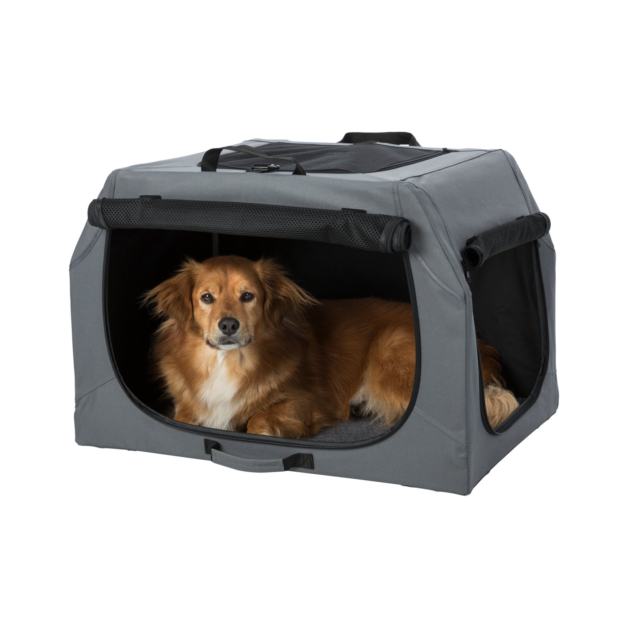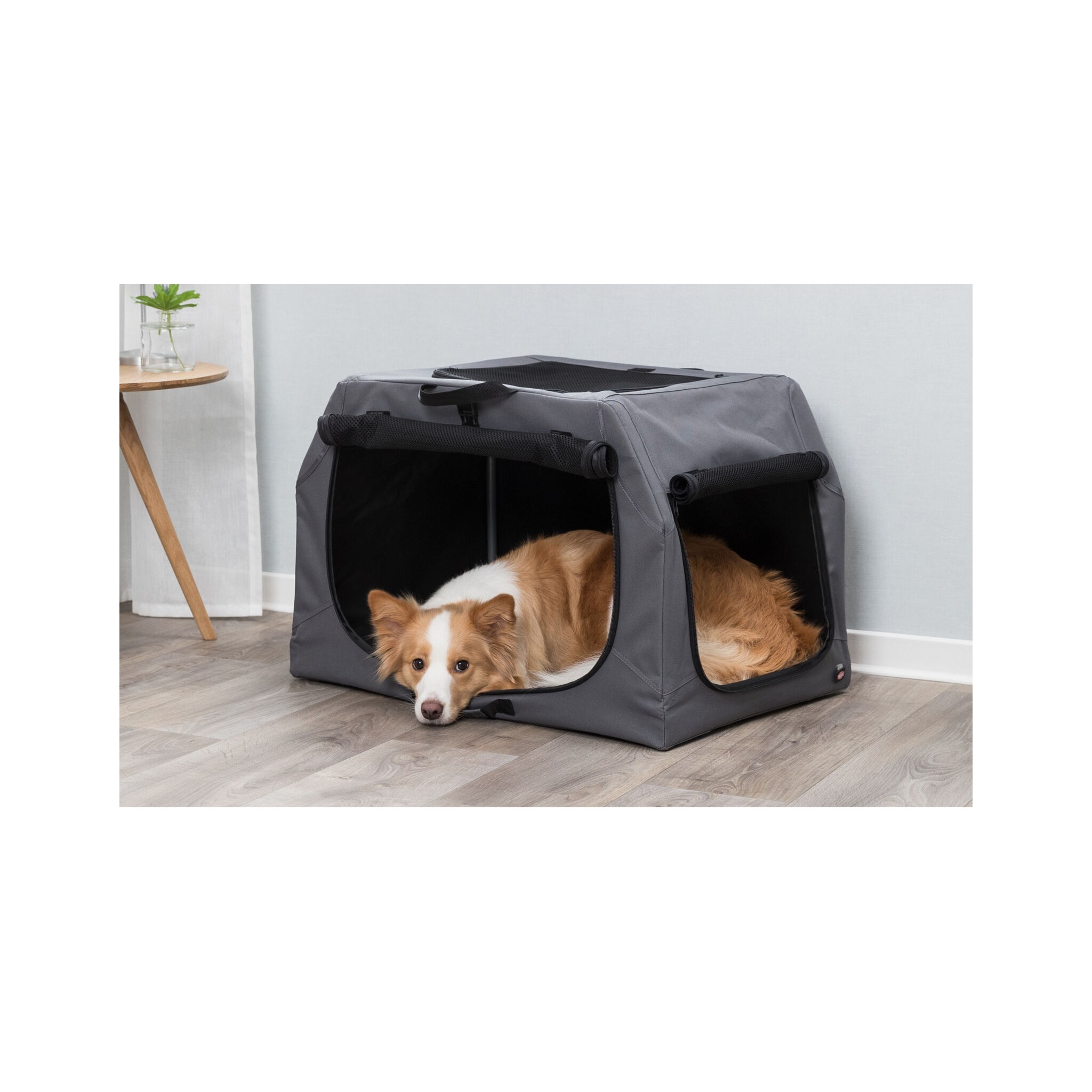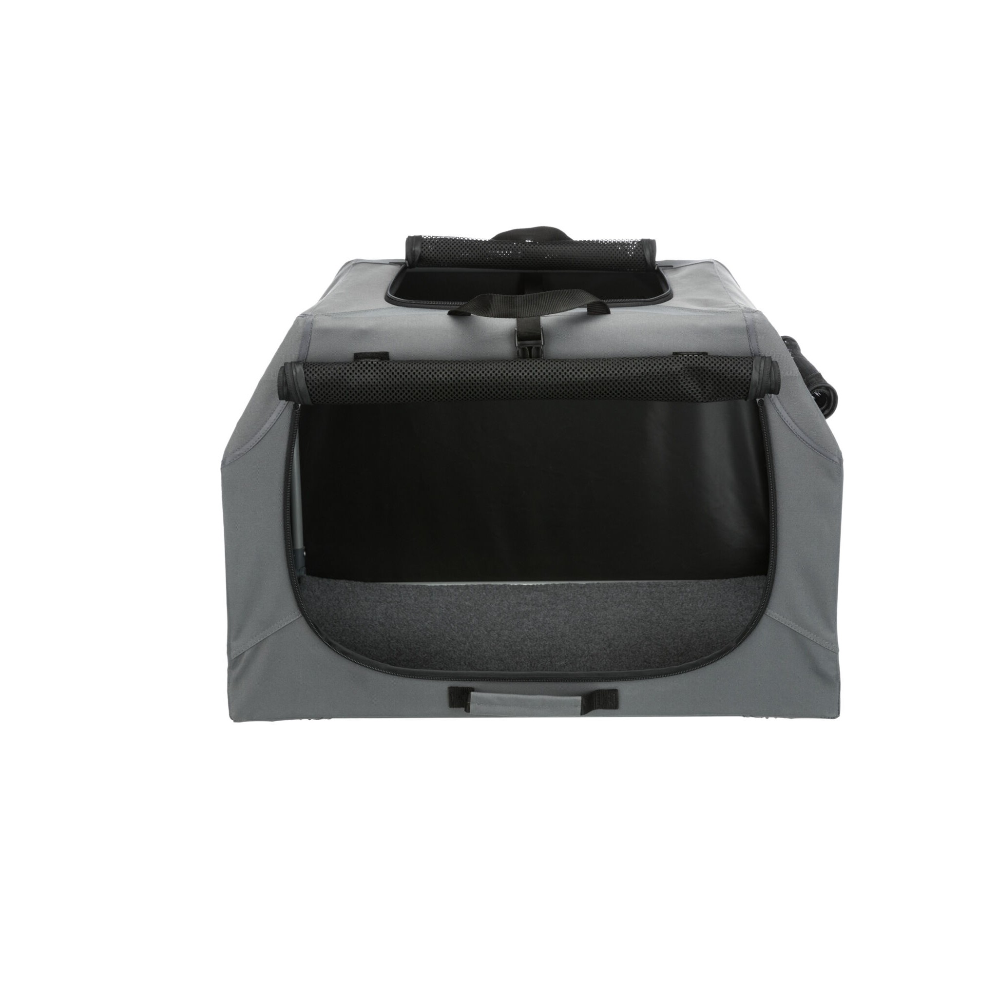 Klatka dla psa Easy to praktyczne i wygodne rozwiązanie do transportu czworonoga. Wyposażona w stabilną ramę metalową oraz otwarcie z trzech stron zapewnia bezpieczeństwo i wygodę zwierzęciu. Trzy rączki ułatwiają przenoszenie, a mata do leżenia z imitacji futra jagnięcego zapewnia komfortowy odpoczynek podczas podróży. Wykonana z poliestru, w kolorze szarym.