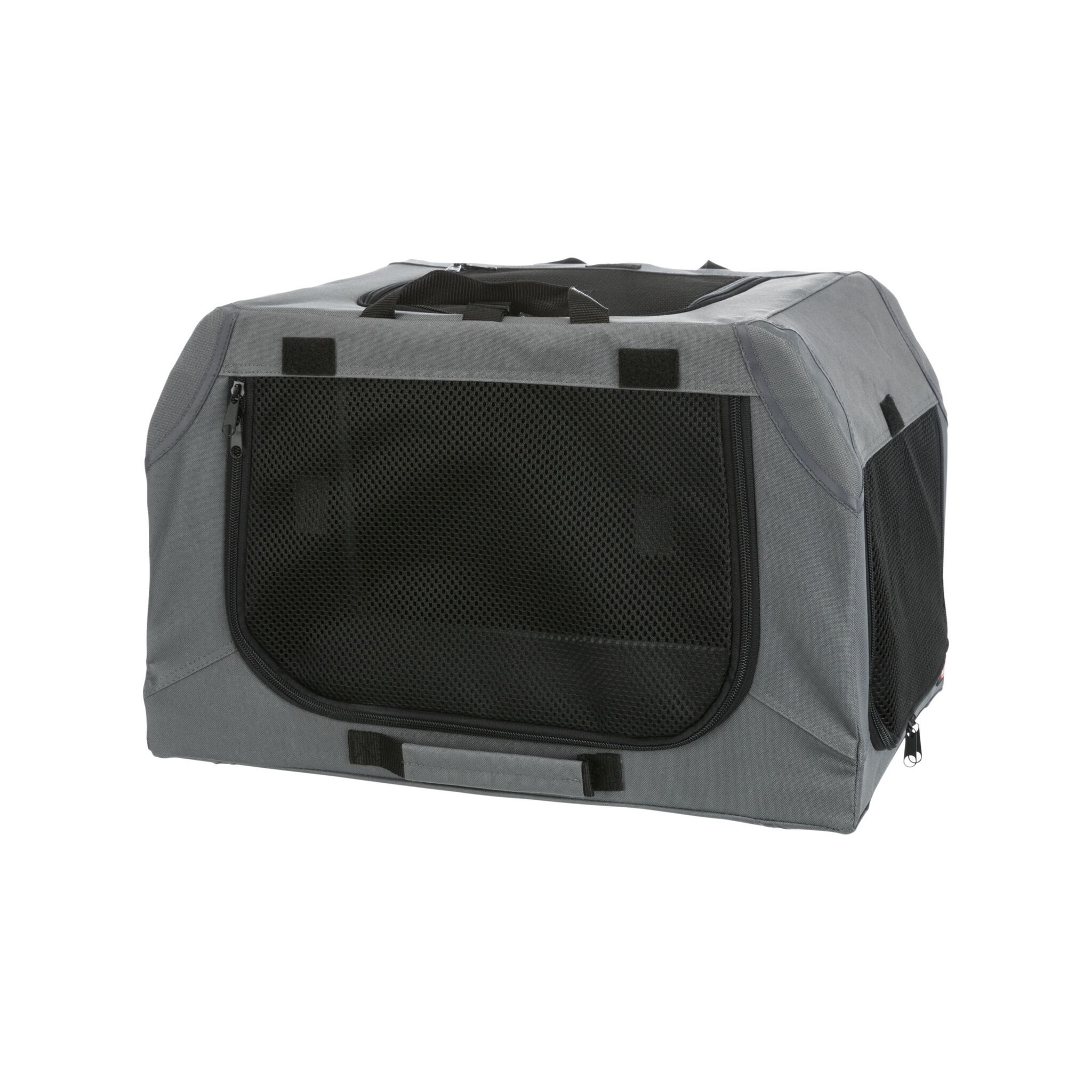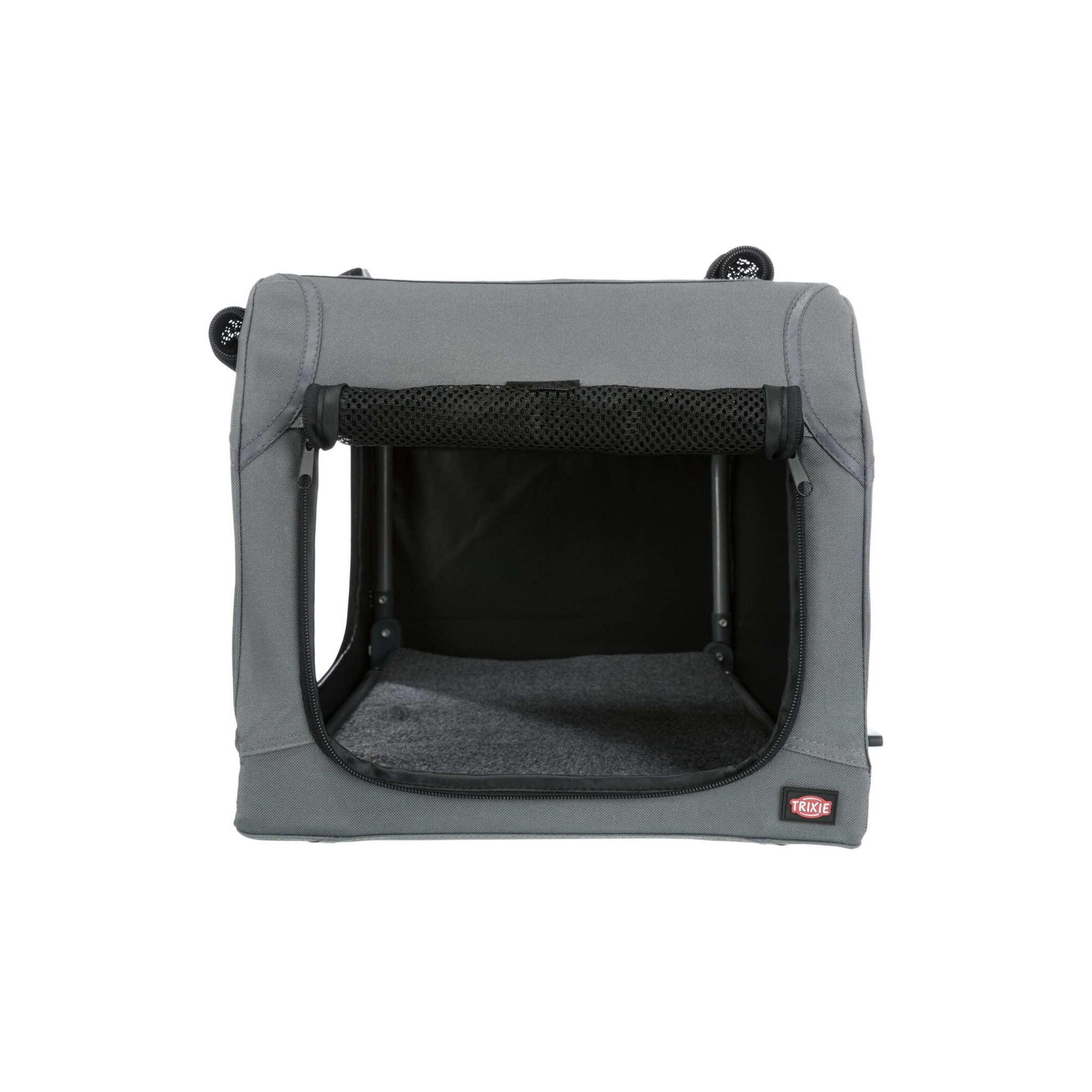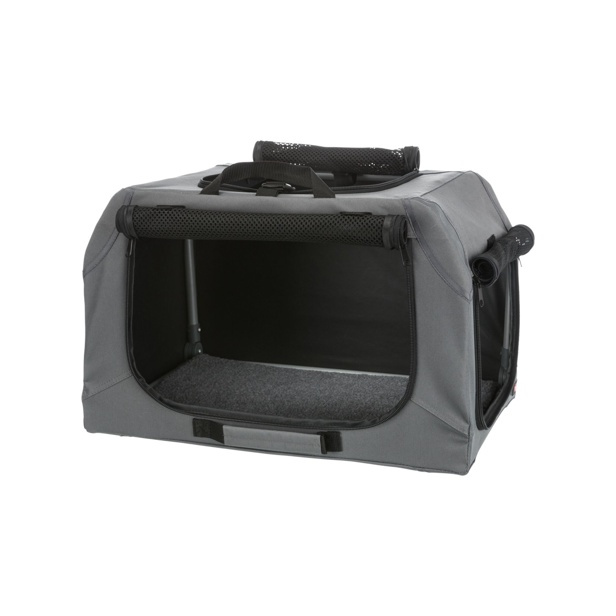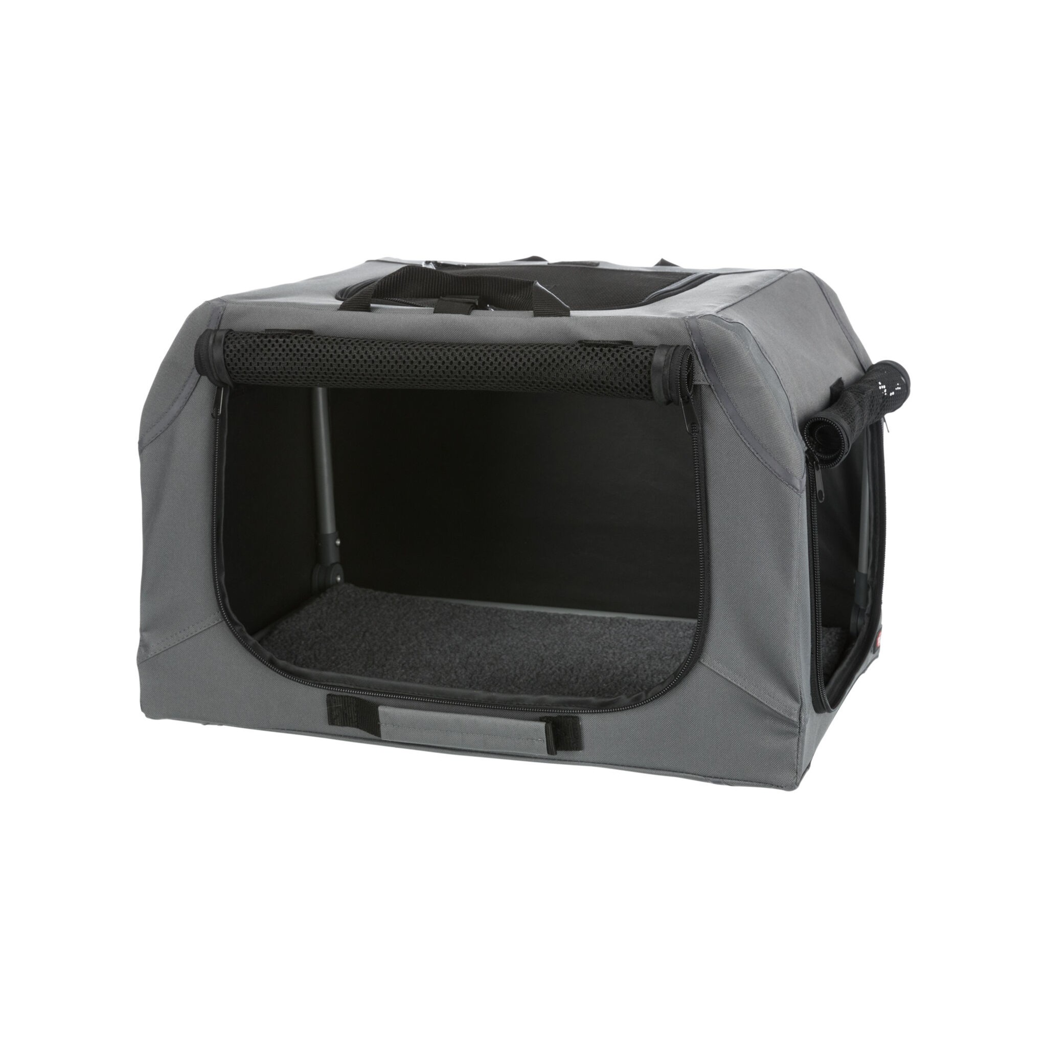 Klatka dla psa Easy to praktyczne i wygodne rozwiązanie do transportu czworonoga. Wyposażona w stabilną ramę metalową oraz otwarcie z trzech stron zapewnia bezpieczeństwo i wygodę zwierzęciu. Trzy rączki ułatwiają przenoszenie, a mata do leżenia z imitacji futra jagnięcego zapewnia komfortowy odpoczynek podczas podróży. Wykonana z poliestru, w kolorze szarym.