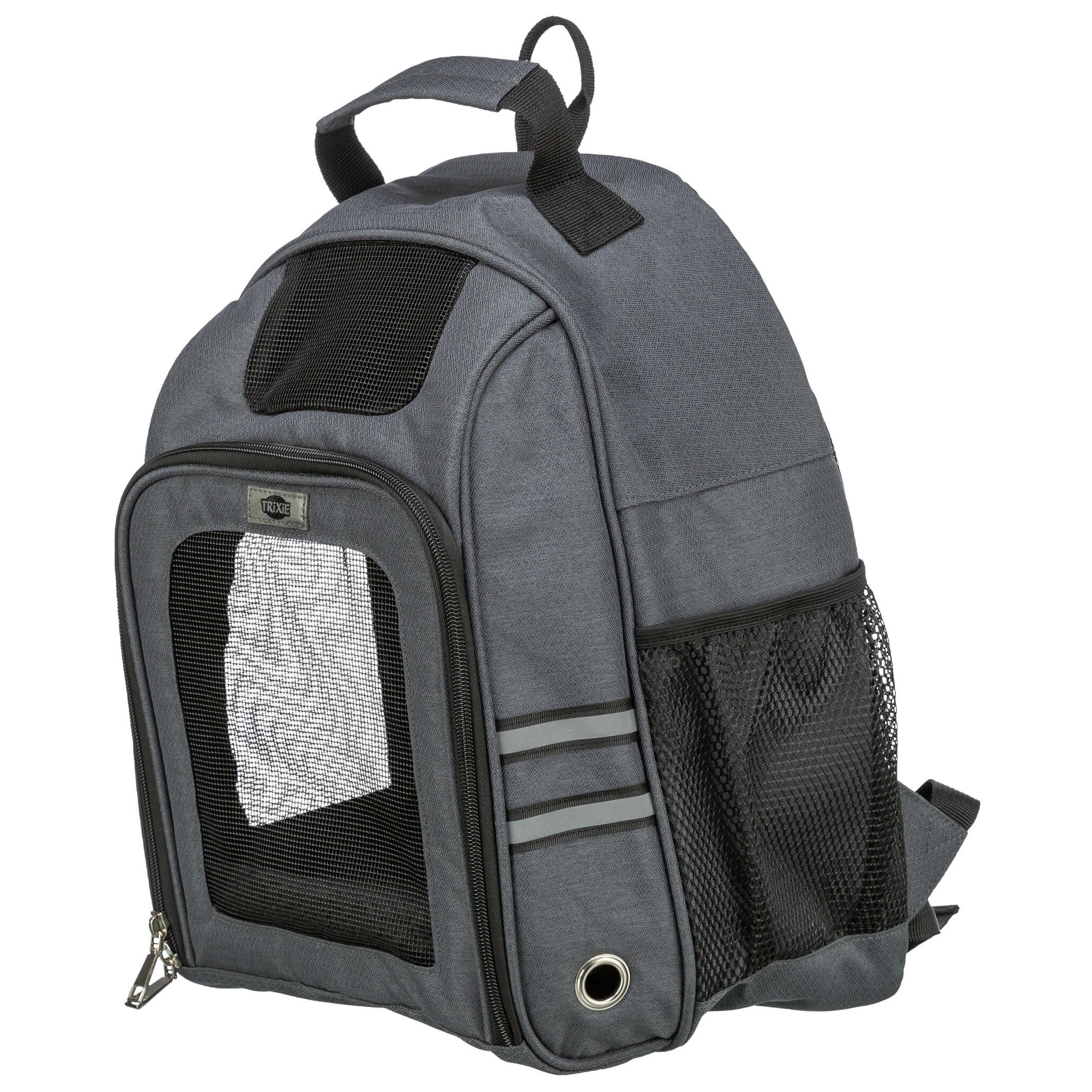 Plecak dla psów, wyposażony w pas przy talii, co zapewnia idealne rozłożenie ciężaru. Posiada stabilny kształt oraz frontowe drzwiczki, co ułatwia dostęp do wnętrza. Wygodna kieszeń siatkowa oraz zintegrowana krótka smycz to dodatkowe atuty. Wyściełana podstawa wykonana z materiału imitującego owczą wełnę (z poliestru) ma zdejmowane pokrycie, a elementy odblaskowe zwiększają bezpieczeństwo. Plecak wykonany jest z poliestru.