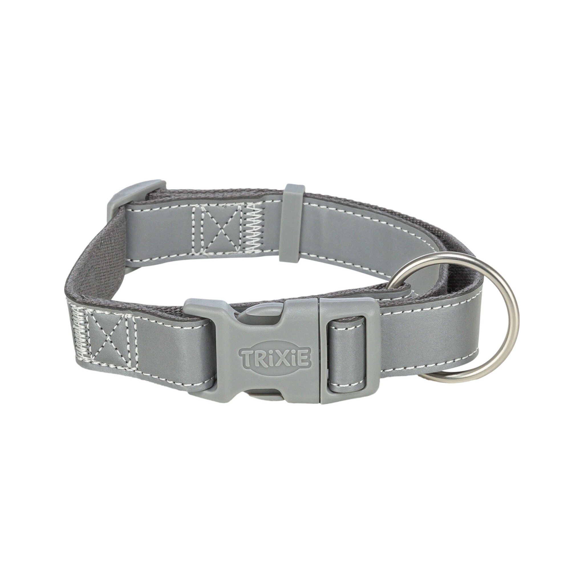 Obroża posiada górną część wykonaną z tworzywa sztucznego oraz dolną z taśmy parcianej w kolorze grafitowym. Jest w pełni regulowana, zapewniając komfort i dopasowanie. Wyposażona jest w odblaskowe elementy, które zwiększają widoczność psa podczas spacerów po zmroku. Obroża od rozmiaru S do M jest wyposażona w klamrę odciążającą, co podnosi komfort użytkowania.