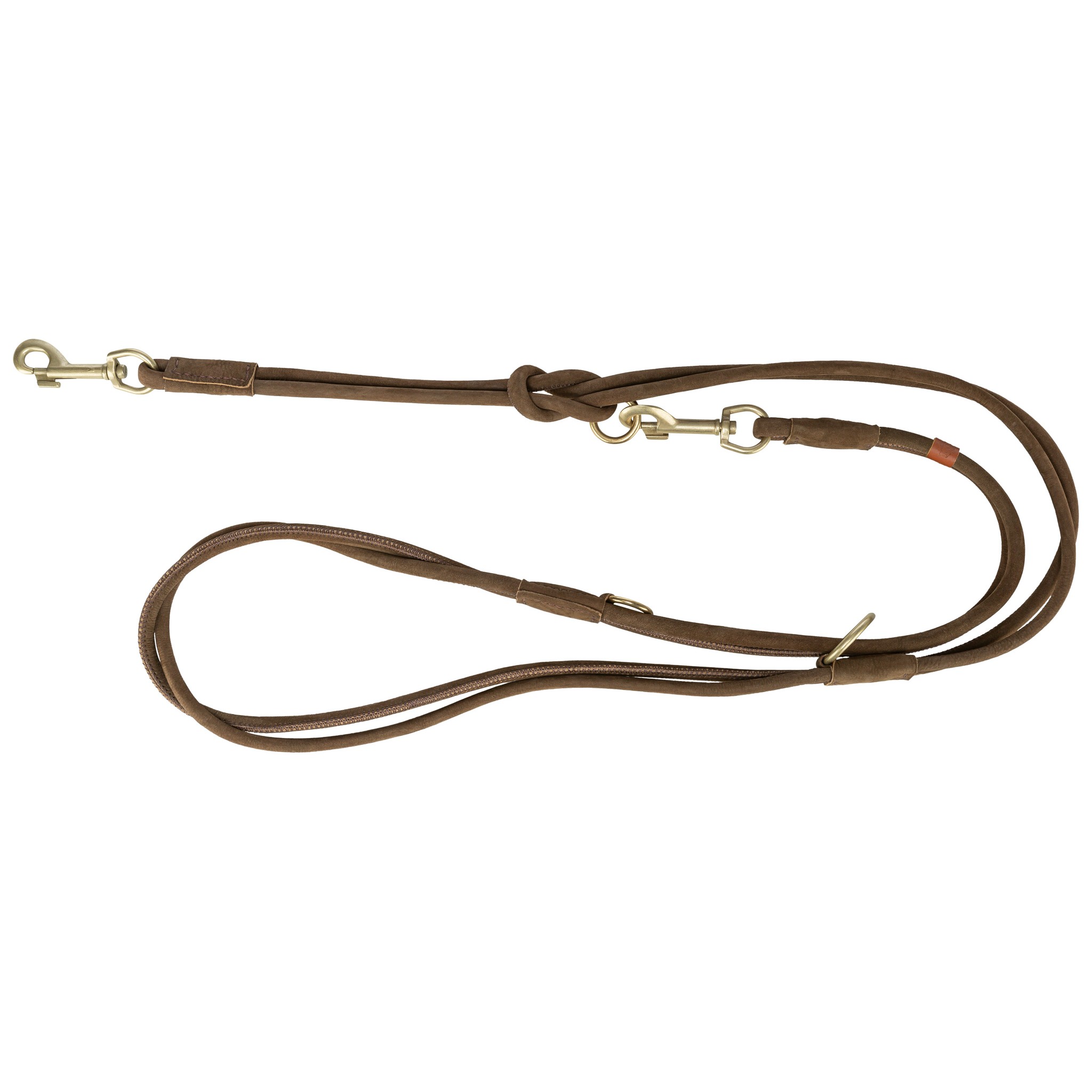 Regulowana smycz wykonana ze skóry nubukowej, która charakteryzuje się wysoką jakością i trwałością. Okrągła, szyta konstrukcja zapewnia wygodę użytkowania, a 3-stopniowa regulacja pozwala dostosować długość smyczy do potrzeb psa.
