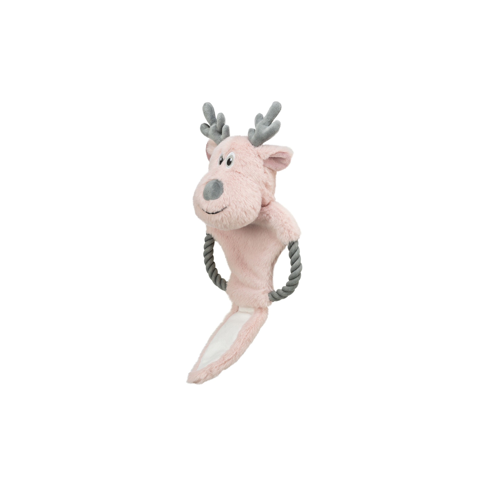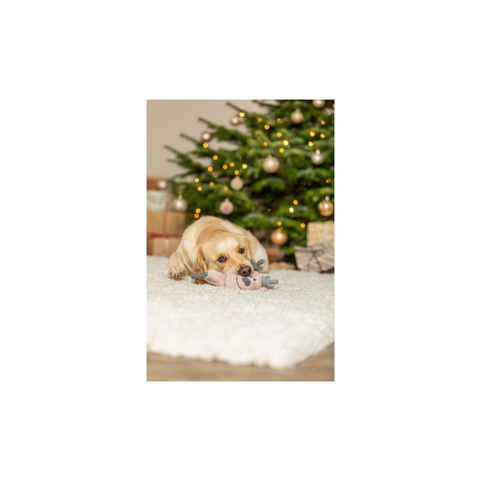 Pluszowa zabawka w kształcie renifera, wykonana z poliestru lub bawełny. Zabawka jest szeleszcząca, co dodatkowo urozmaica zabawę dla psa.