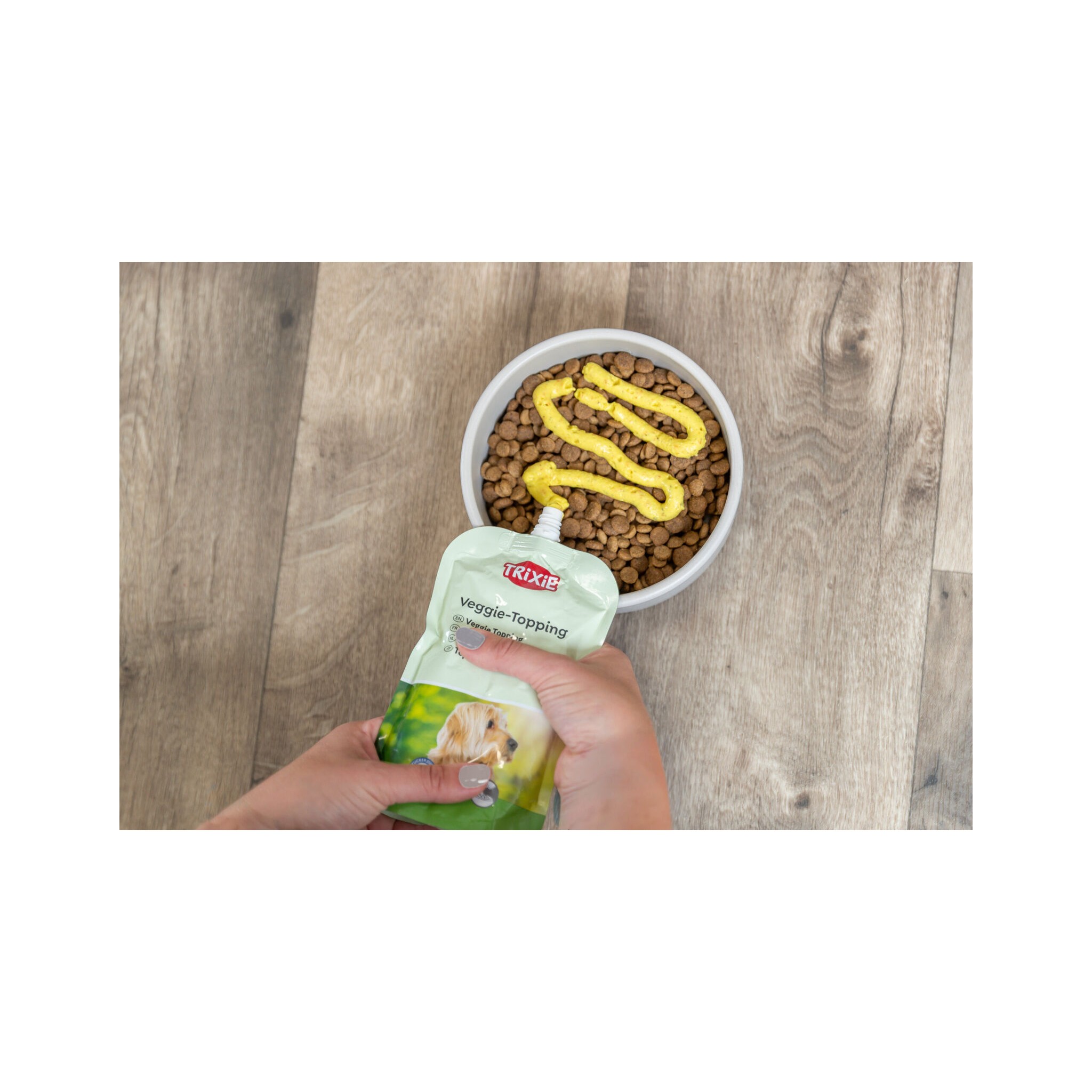Nasz wegański topping to płynny przysmak, który świetnie sprawdza się jako dodatek do suchej karmy. Charakteryzuje się bardzo wysoką akceptacją ze strony psa oraz stanowi wspaniały efekt nagrody podczas treningu czy codziennej zabawy.