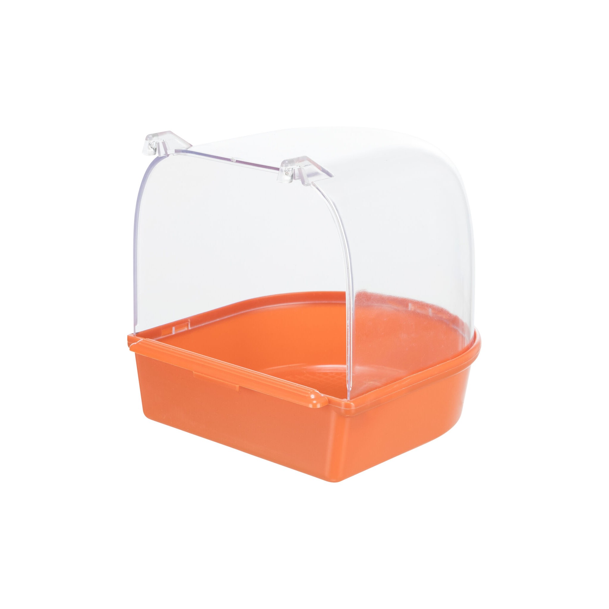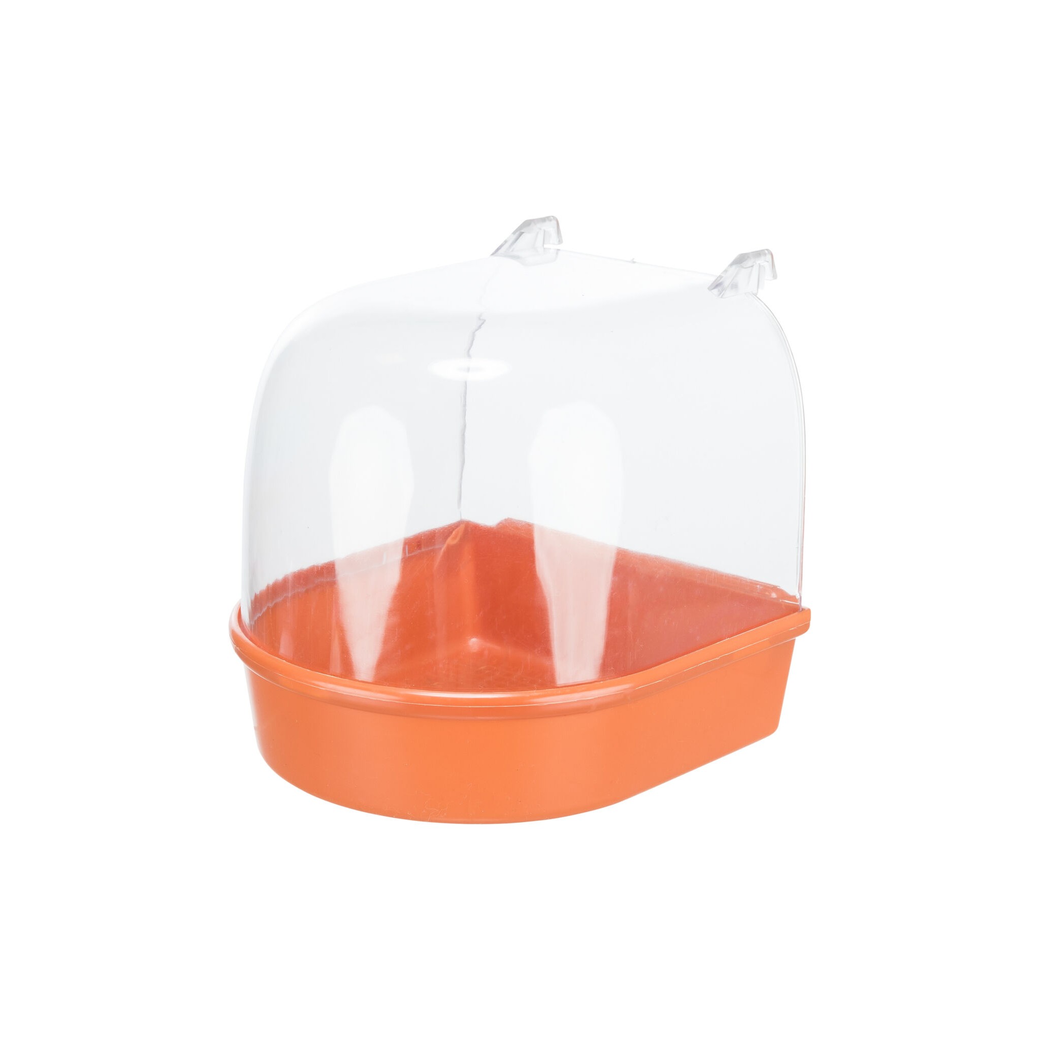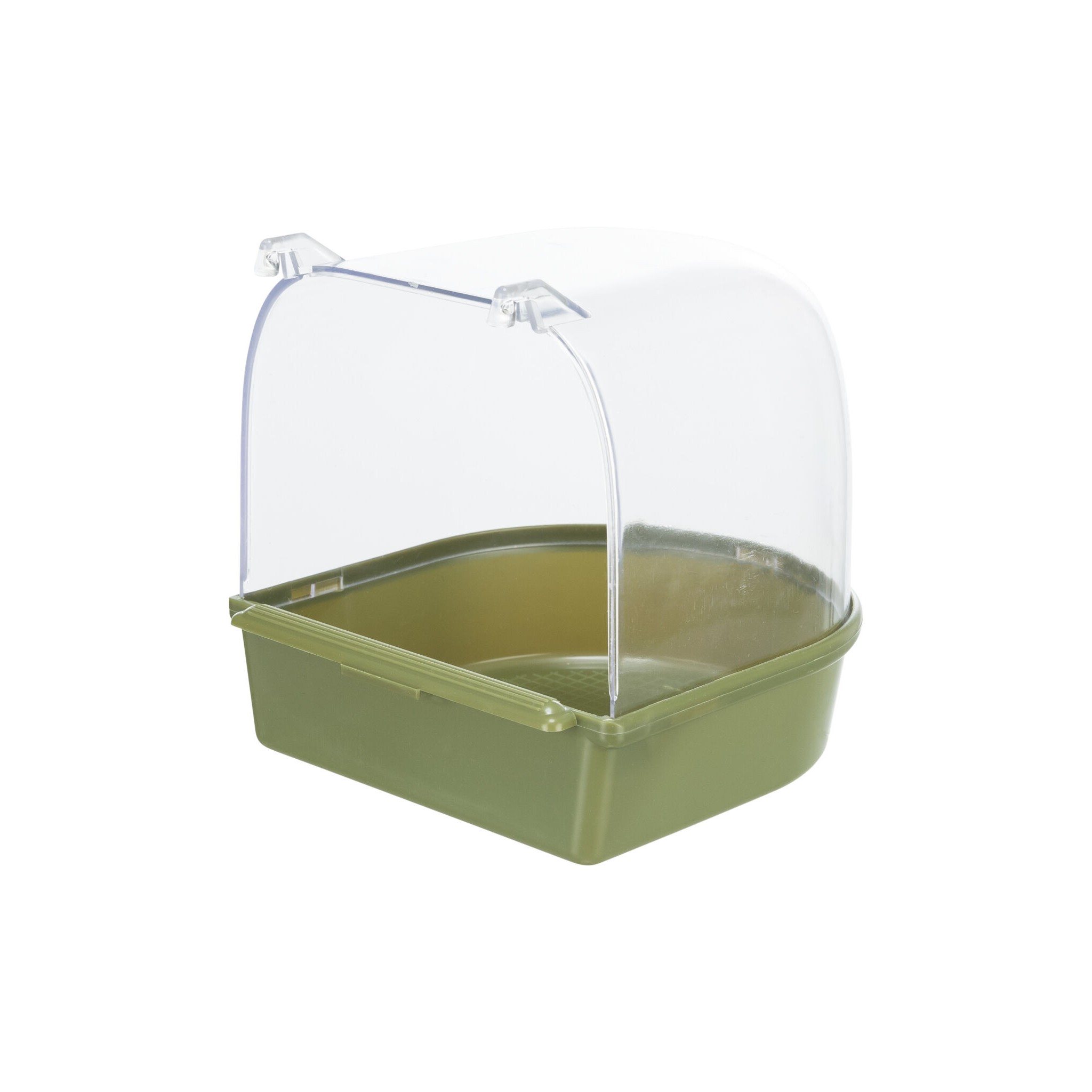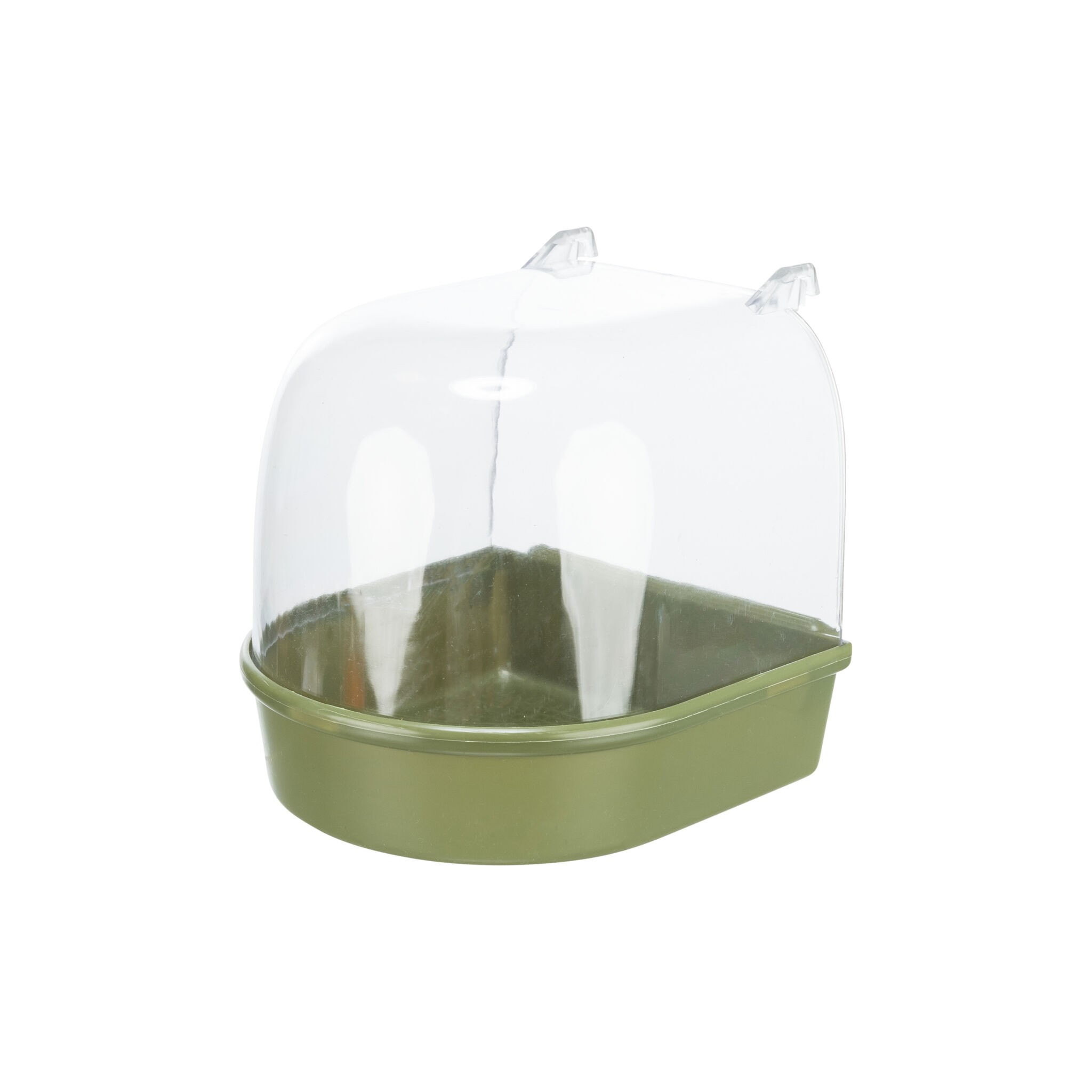 Pojemnik do kąpieli półokrągły jest doskonałym wyposażeniem dla właścicieli ptaków. Może być zawieszany przy drzwiczkach wejściowych, a jego optymalne otwarcie drzwiczek (13 × 10 cm) sprawia, że jest łatwy w użyciu. Góra jest przezroczysta, a pojemnik występuje w różnych kolorach, co pozwala dostosować go do preferencji estetycznych. Wykonany jest z plastiku, co czyni go łatwym w utrzymaniu czystości.
