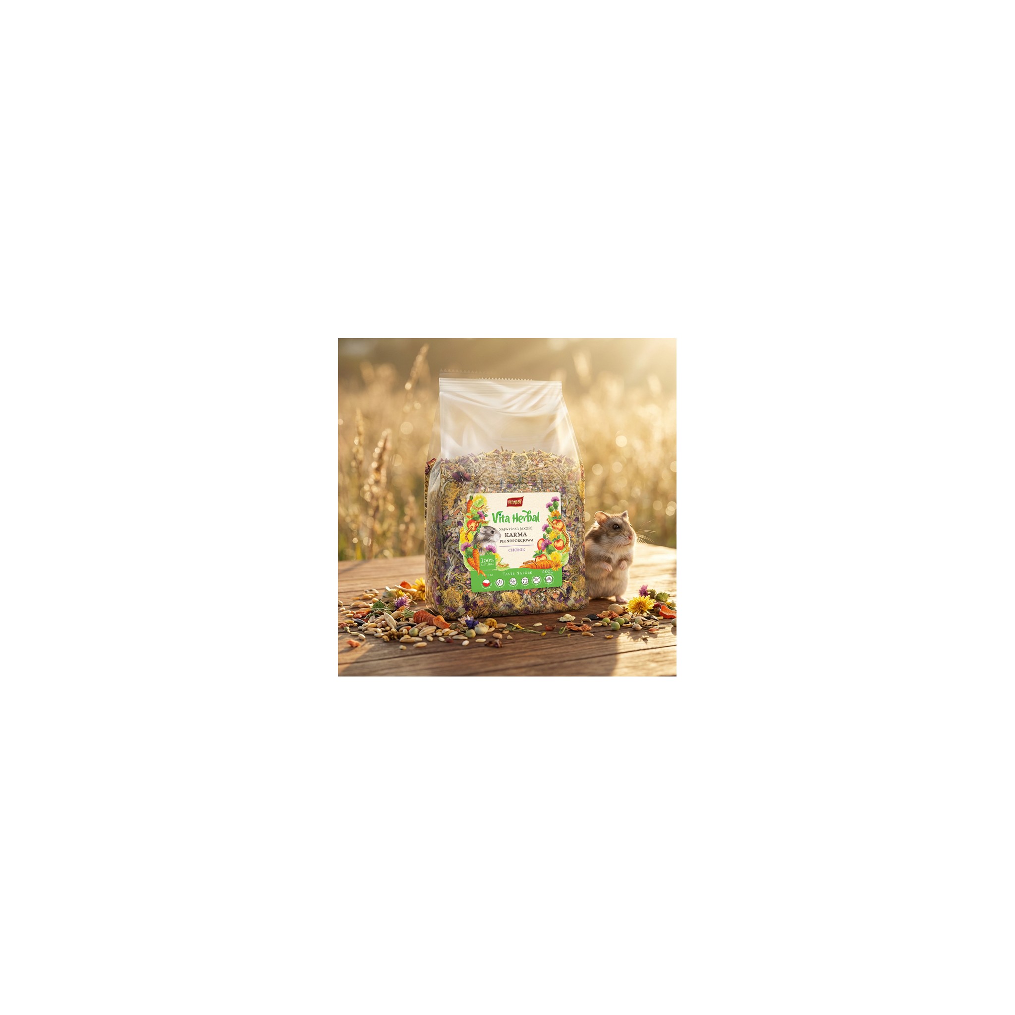 Vita Herbal dla chomika to w 100% naturalna karma dla chomików, której rozbudowany skład zawiera zarówno zboża, ziarna, owoce, warzywa, zioła jak i dodatek suszonych larw mącznika oraz krewetki. Dzięki tak bogatemu i różnorodnemu składowi zapewniamy chomikowi dostęp do szerokiej gamy składników pokarmowych. Obecność białka pochodzenia zwierzęcego zapewnia prawidłowe żywieni tych małych gryzoni wszystkożernych. Dodatek ziół jak mniszek, kwiat nagietka czy płatki róży wpływa pozytywnie na procesy trawienia i odporność. Nasiona ostropestu plamistego chronią wątrobę. Karma zapewnia doskonałe trawienie, błyszczącą sierść i dobrą higienę jamy ustnej.