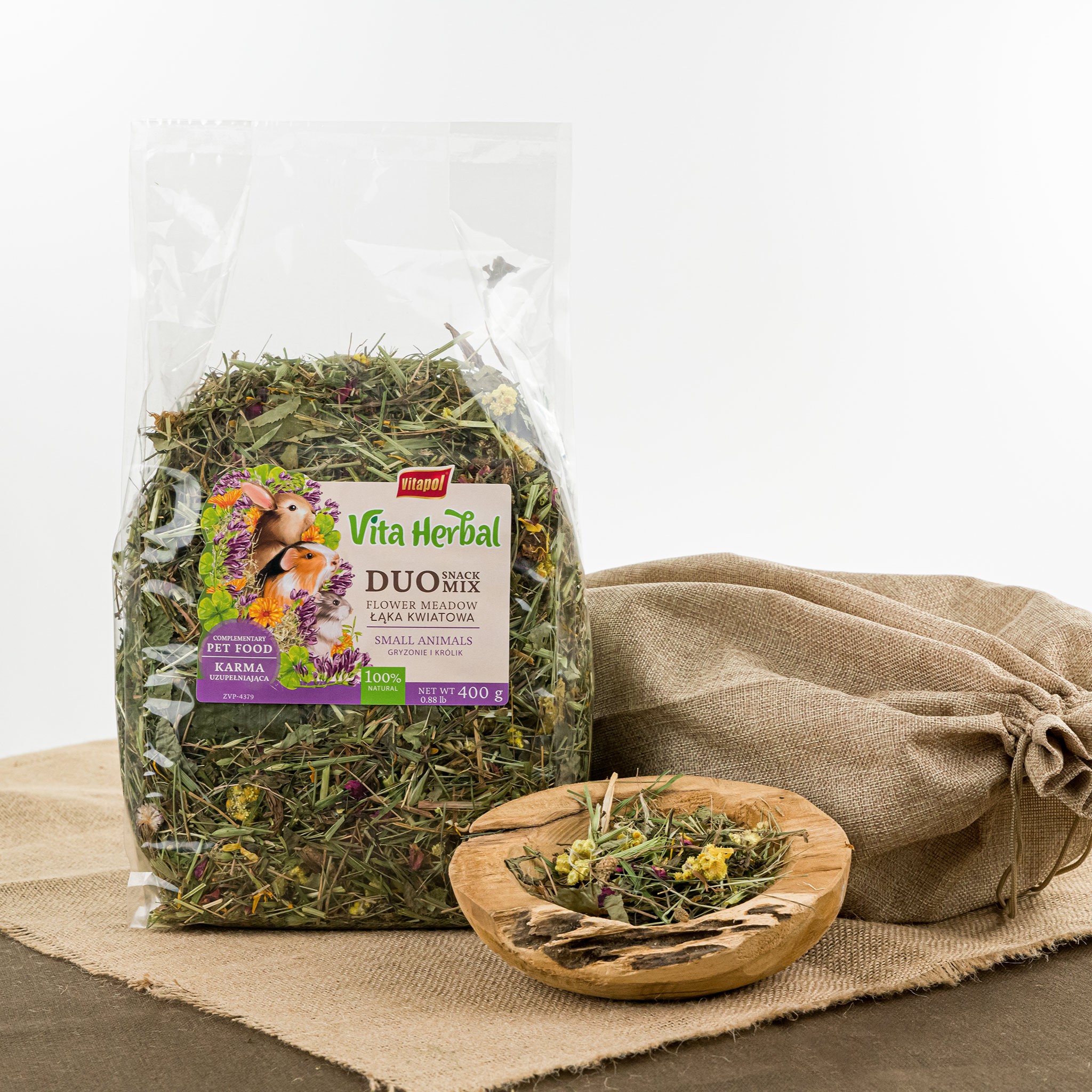 Duo Snack to połączenie siana łąkowego z paletą ziół oraz kwiatami stanowiące urozmaicenie diety Twojego pupila. Mieszanka zwiększa udział włókna surowego w diecie zwierzęcia jednocześnie niosąc ze sobą wiele walorów smakowych i prozdrowotnych.