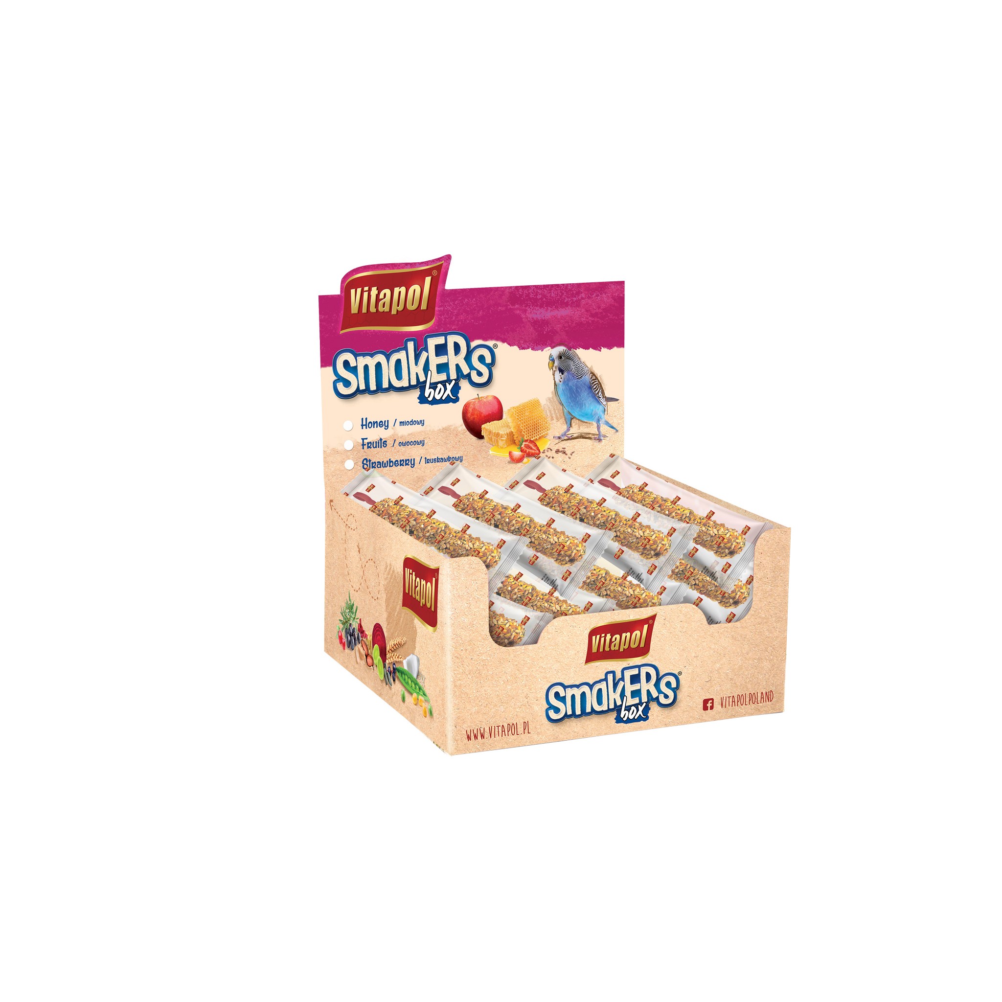 Smakers® , którego skład został wzbogacony odżywczym pyłkiem pszczelim. Pyłek kwiatowyprócz walorów smakowych i odżywczych charakteryzuje się właściwościami leczniczymi i wzmacniającymi odporność organizmu. Z powodzeniem można go podawać zarówno zdrowym jak i chorym lub osłabionym papugom.
