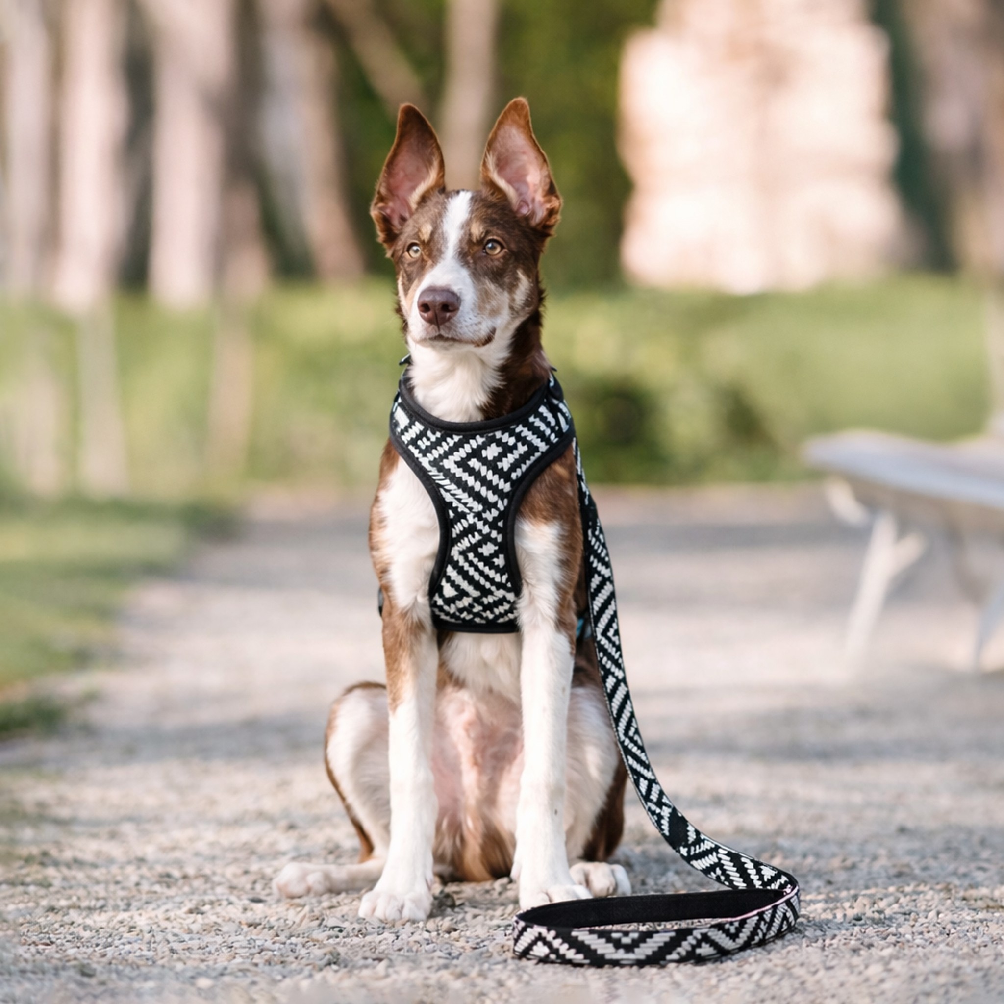 Wzór aztecki, z biało-czarnymi paskami, nadaje szelkom charakterystyczny, etniczny wygląd, co sprawia, że stają się one nie tylko praktycznym narzędziem, ale także modnym elementem dla Twojego psa. Ten kolorowy wzór doskonale komponuje się z różnymi typami sierści, dodając pupilkowi odrobinę stylu podczas spacerów.