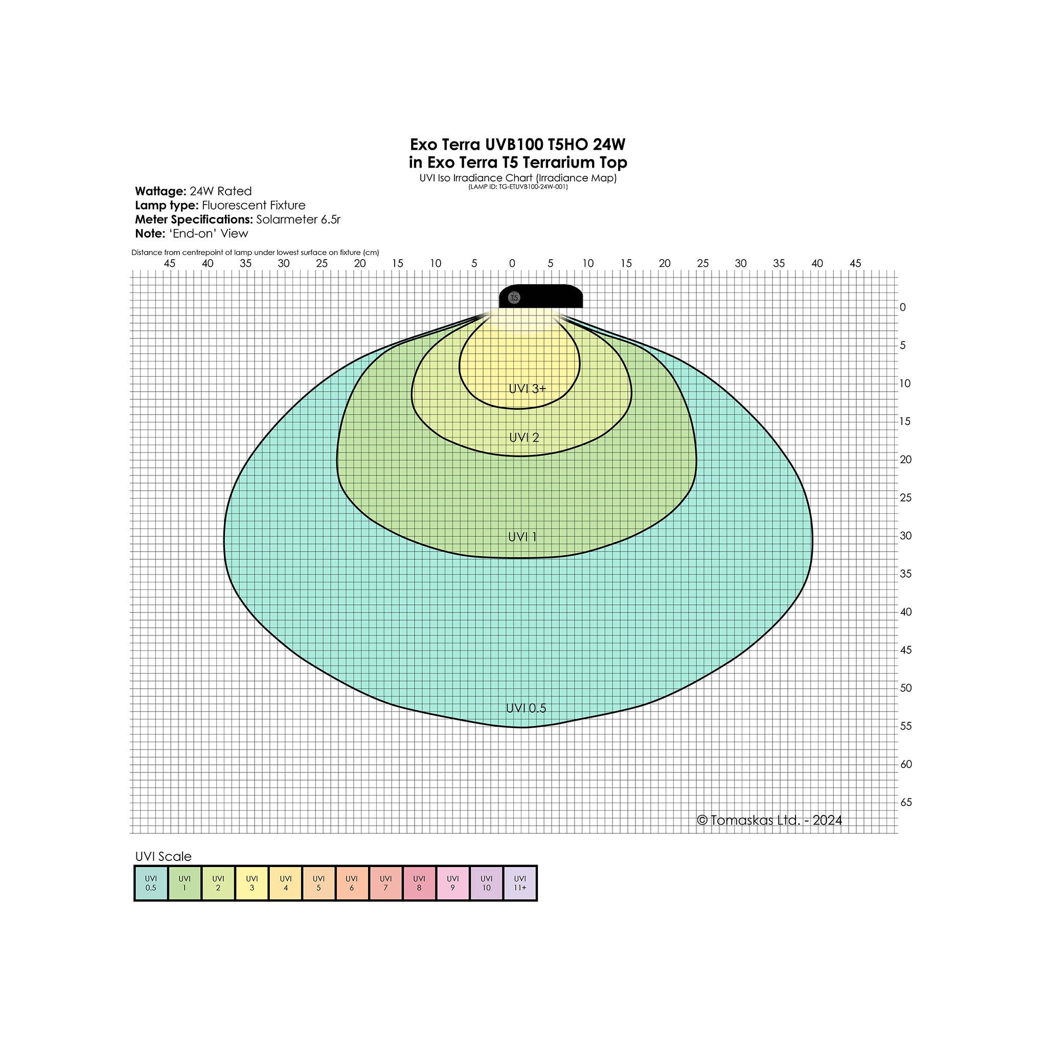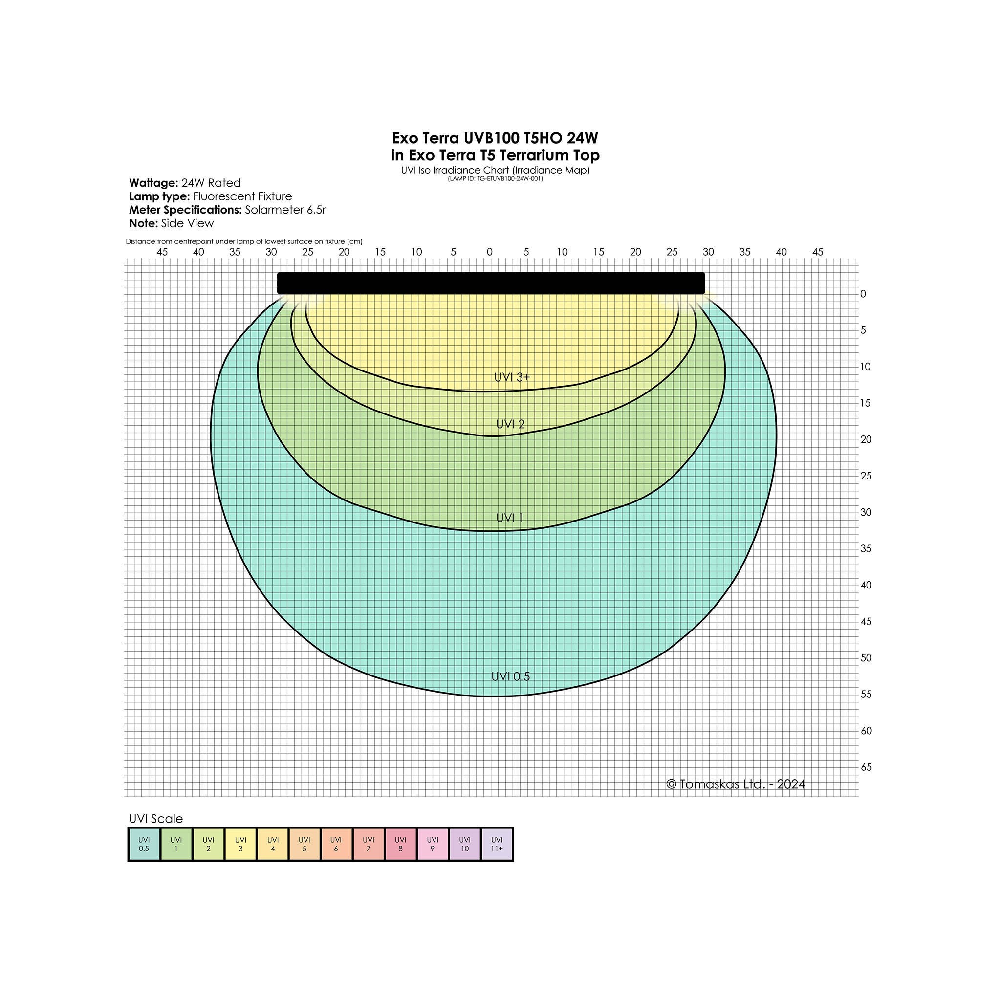 Exo Terra Reptile UVB100 T5 24 W to wysokiej jakości świetlówka UVB zaprojektowana z myślą o gadach i płazach zamieszkujących środowiska o umiarkowanym nasłonecznieniu, takie jak strefy podszytu tropikalnych lasów. Emituje 3% promieniowania UVB i 30% UVA, wspierając syntezę witaminy D3, a tym samym prawidłowe wchłanianie wapnia i zapobieganie metabolicznej chorobie kości (MBD). Jej bardzo wysoka wydajność świetlna (VHO) oraz nowoczesna technologia Sunergy™ zapewniają maksymalną skuteczność i odwzorowanie naturalnego spektrum światła słonecznego.