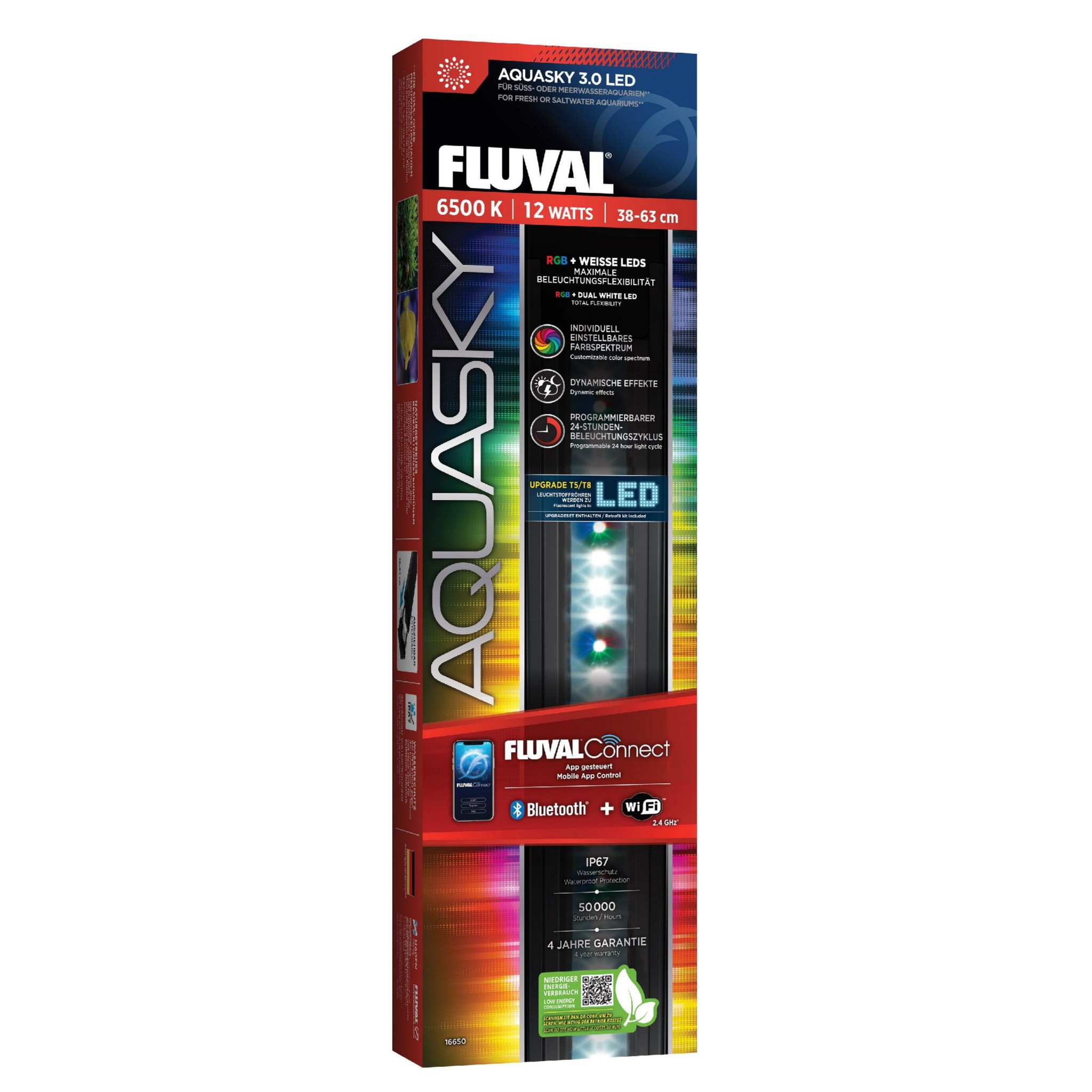 Sterowanie odbywa się wyłącznie za pomocą aplikacji FluvalConnect, korzystającej z Bluetooth i Wi-Fi (2.4 GHz), co gwarantuje wygodę i pełną kontrolę nad oświetleniem z poziomu smartfona.