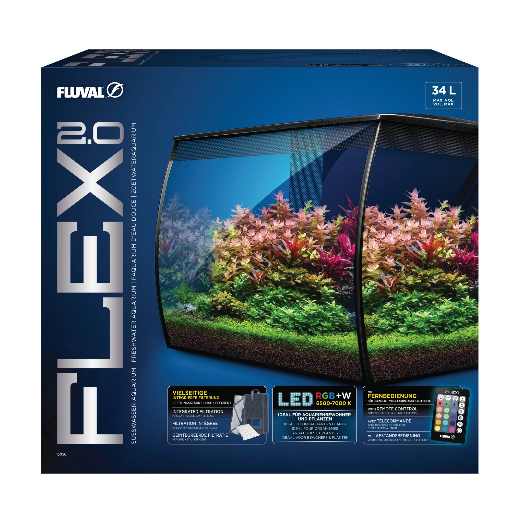 • Oświetlenie LED RGB + białe z pilotem-Dzięki wielokolorowemu oświetleniu (RGB) i możliwości regulacji barw, Flex 2.0 34 L umożliwia kreowanie efektownych aranżacji światłem. Białe diody wspierają wzrost roślin akwariowych.
