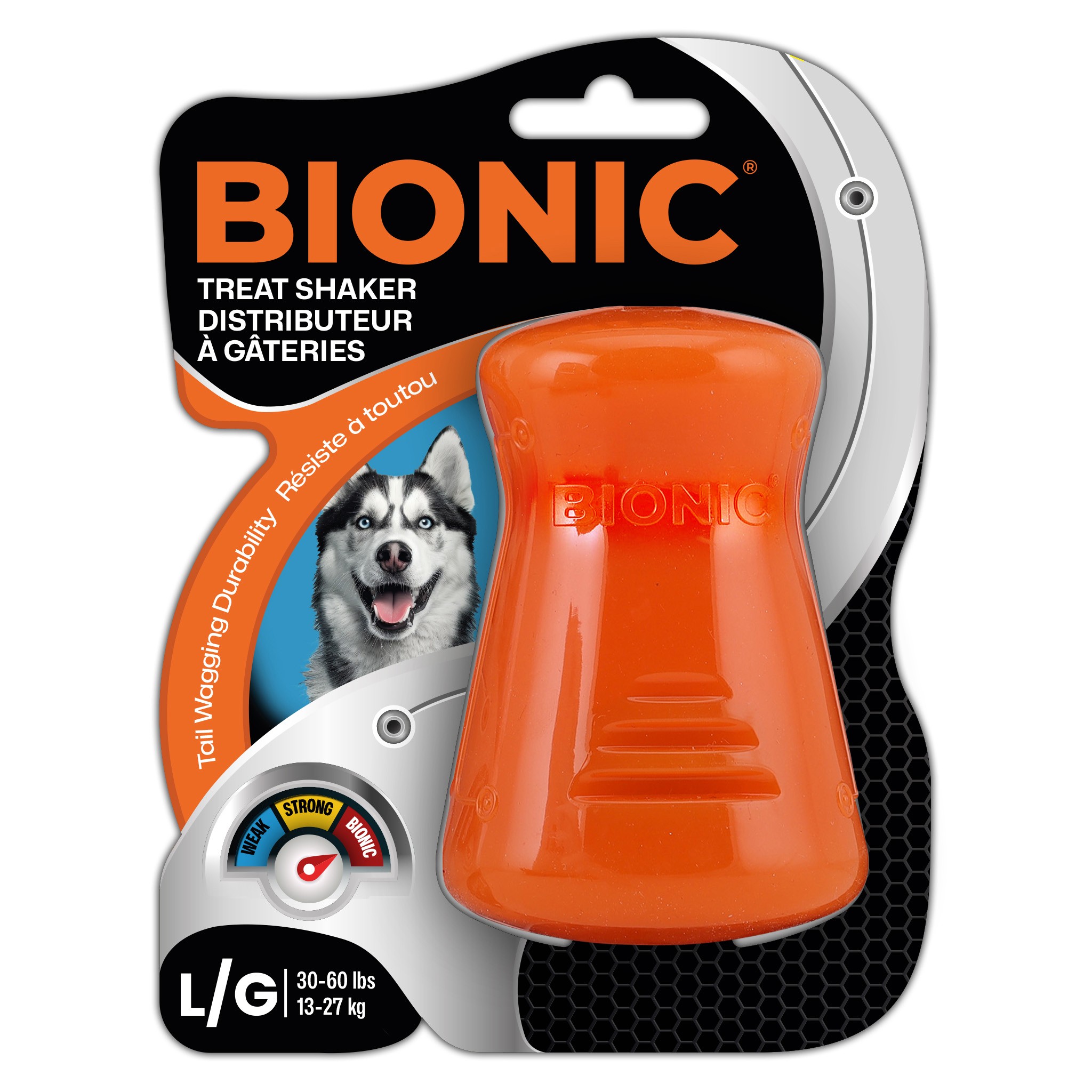 BIONIC Treat Shaker to wytrzymała zabawka do żucia z dozownikiem przysmaków, stworzona specjalnie dla psów o silnym instynkcie gryzienia. Duża komora na smakołyki sprawia, że czas zabawy i żucia staje się bardziej angażujący. BIONIC Treat Shaker jest dostępny w trzech rozmiarach, a rozmiar L przeznaczony jest dla większych psów o wadze 13-27+ kg