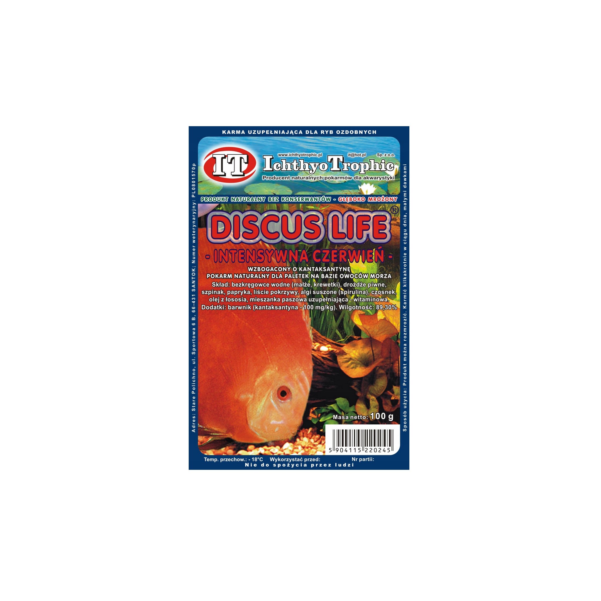Ichthyo Trophic Pokarm mrożony Discus Life Intensywna czerwień 100g to wysokiej jakości pokarm mrożony dla paletek i ryb tropikalnych, stworzony na bazie owoców morza. Dzięki starannie dobranym składnikom oraz zawartości kantaksantyny, produkt wspiera intensywne wybarwienie i naturalną kondycję ryb. Blisterowa forma ułatwia porcjowanie i przechowywanie.