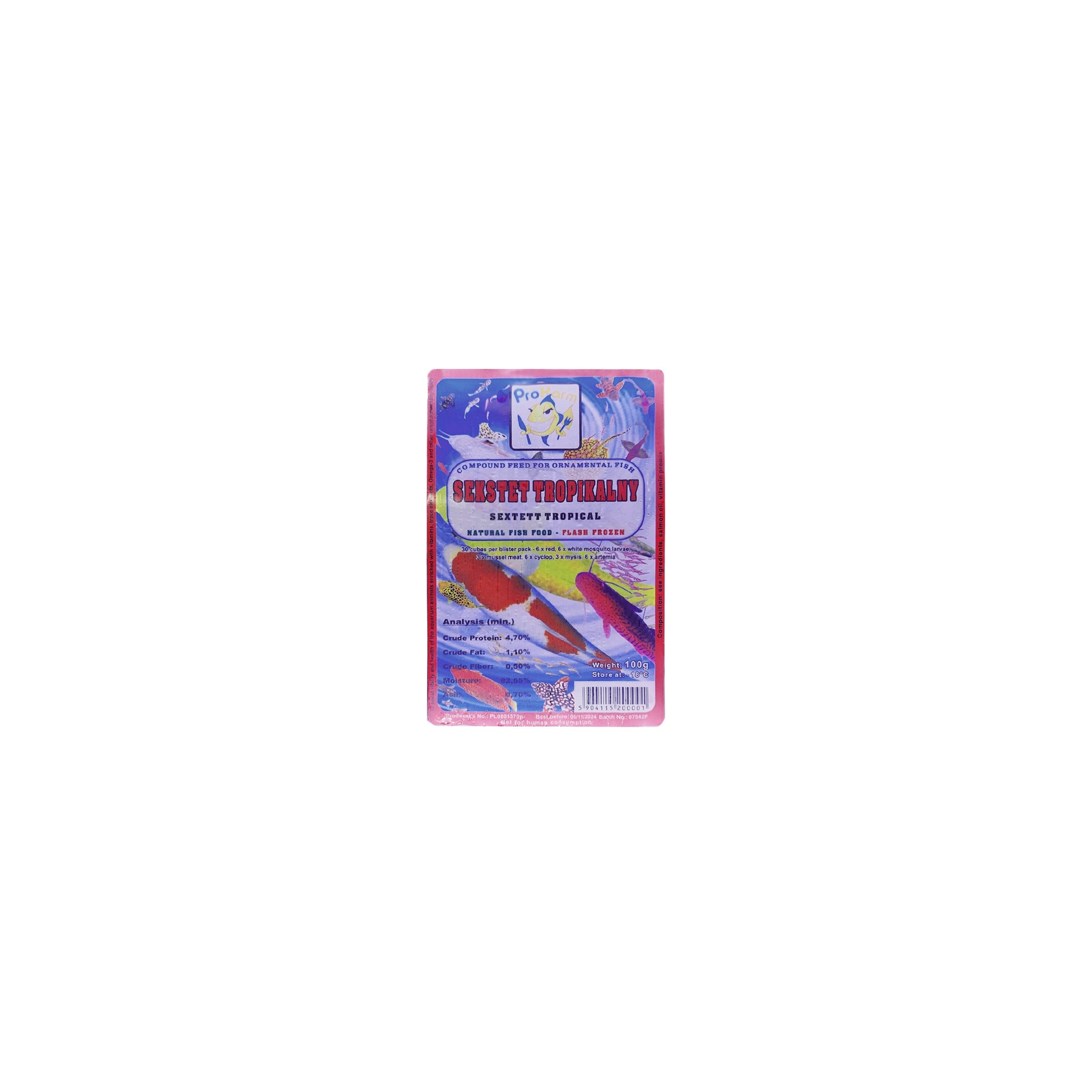 ProKarm Sekstet Tropikalny to wyjątkowy zestaw sześciu różnych pokarmów mrożonych w jednym praktycznym opakowaniu, stworzony z myślą o różnorodności diety Twoich ryb akwariowych. Ten kompleksowy pokarm w blistrze 100g zawiera starannie dobrane składniki naturalne, które zapewnią pełnowartościowe odżywienie zarówno rybom słodkowodnym, jak i morskim różnych rozmiarów i preferencji żywieniowych.
