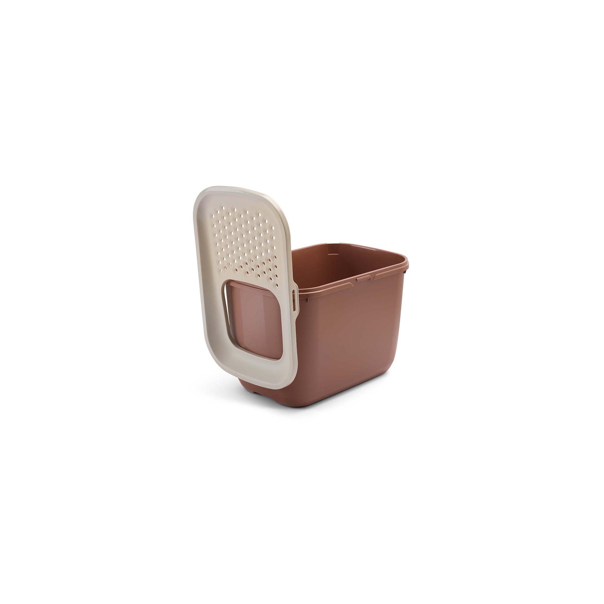 • Kuweta Hop In wyróżnia się subtelnymi, eleganckimi kolorami oraz nowoczesnym kształtem, dzięki czemu doskonale wpasuje się w każde wnętrze. Estetyka idzie tu w parze z funkcjonalnością, co czyni ten produkt atrakcyjnym wyborem dla wymagających właścicieli kotów.
